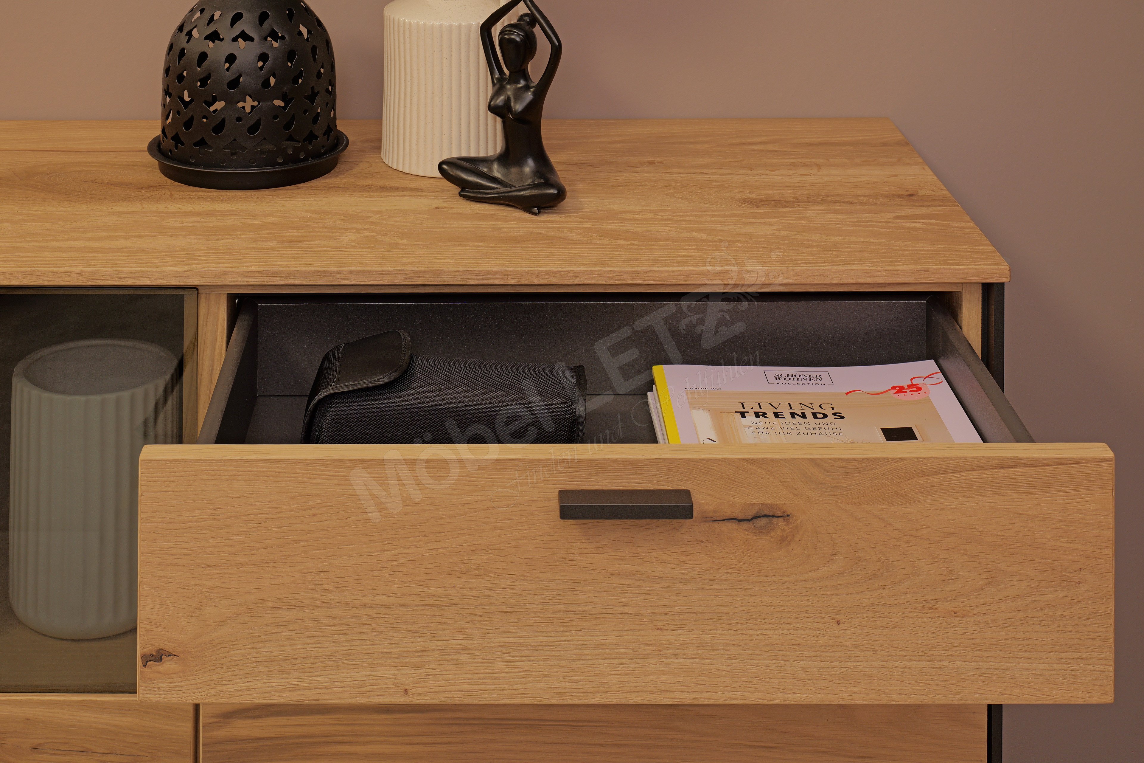 SCHÖNER WOHNEN – Wohnideen für ein besseres Zuhause: Dieses Sideboard aus der Kollektion Andra-living ist die perfekte Ergänzung für stilvolle Wohnräume. Der Solist bringt natürliche Eleganz sowie moderne Akzente in Ihre verschiedenen Wohnbereiche. Für eine warme und wohnliche Atmosphäre sorgt der Korpus sowie die Front aus hochwertigem Eichenfurnier. Die sichtbare Rückwand in mattem Anthrazit setzt dazu einen stilvollen Kontrast. Edles Parsolglas in Grau verleiht dem Möbel eine elegante Transparenz. Metallgriffe, passend zum Untergestell in Anthrazit, runden das harmonische Gesamtbild ab. Ausgestattet ist die Kommode mit einer Holztür, hinter der Ihre persönlichen Sachen außer Sichtweite aufbewahrt werden können, zwei Glas-/ Holztüren, die einen Einblick auf Ihre präsentierten Schätze freigeben, und einem Schubkasten, in dem gewisse Kleinstutensilien einen idealen Platz finden. Zudem sorgen integrierte Dämpfungen nicht nur für geräuschloses und sanftes Schließen, sondern gewähren auch eine Langlebigkeit des Möbels. Eine inkludierte Fach- und Untergestellbeleuchtung verleihen dem Solisten den gewissen Feinschliff. Weitere passende Einzelmöbel finden Sie in unserem hinterlegten Möbelplaner. Kollektion Andra-living – für ein rundum stimmiges Wohnkonzept.