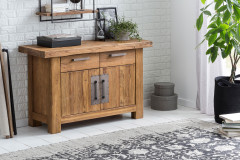 Diese Kommode aus der Serie Coral von SIT Möbel überzeugt als stilvolles Möbelstück mit natürlichem Charme und modernem Charakter. Gefertigt aus recyceltem Teakholz, bringt sie eine warme, lebendige Ausstrahlung in den Wohnraum und wird durch silberfarbene Metallgriffe und Beschläge gekonnt ergänzt. Das Zusammenspiel von ursprünglichem Holz und kühlen Metallelementen verleiht ihr eine ausdrucksstarke Optik mit zeitgemäßem Flair. Die besondere Oberflächenbeschaffenheit macht die Geschichte des Materials nicht nur sichtbar, sondern auch spürbar und unterstreicht den individuellen Charakter jedes einzelnen Stücks. Dank ihres vielseitigen Designs lässt sich die Kommode problemlos in unterschiedliche Einrichtungsstile integrieren. Auch funktional bietet sie durchdachte Lösungen: Zwei Türen und zwei Schubladen schaffen großzügigen, geschlossenen Stauraum für alles, was ordentlich verstaut werden soll. Die Schubladen sind mit stabilen Holzschienen ausgestattet und fügen sich harmonisch in das Gesamtbild ein. Das verwendete Holz stammt aus alten Gebäuden wie Scheunen oder Häusern und wird sorgfältig aufgearbeitet. So entsteht bei jeder Kommode ein einzigartiges Möbelstück mit eigener Geschichte. Diese Kommode verbindet Nachhaltigkeit, praktischen Nutzen und ein wohnliches Ambiente auf gelungene Weise.