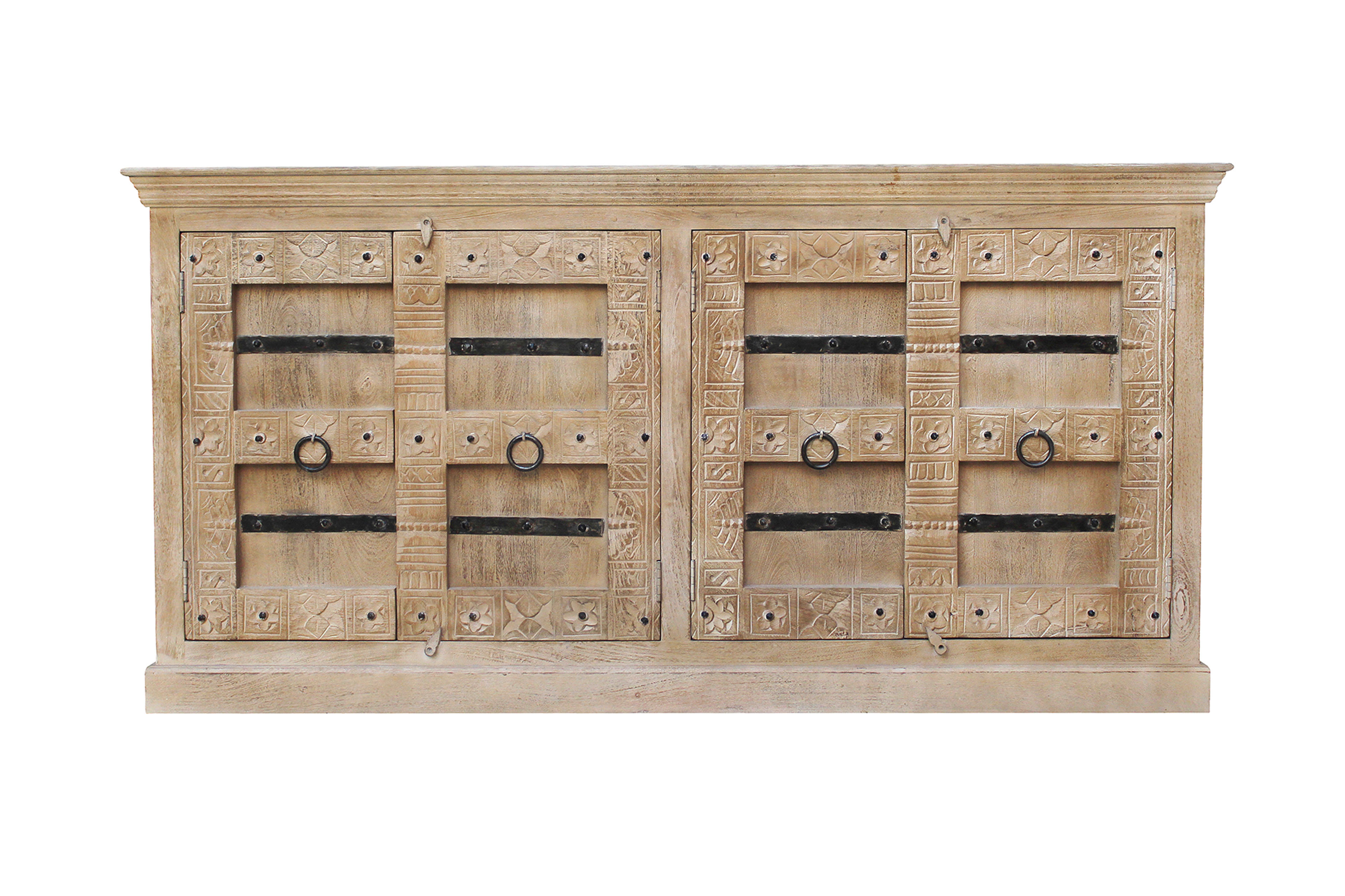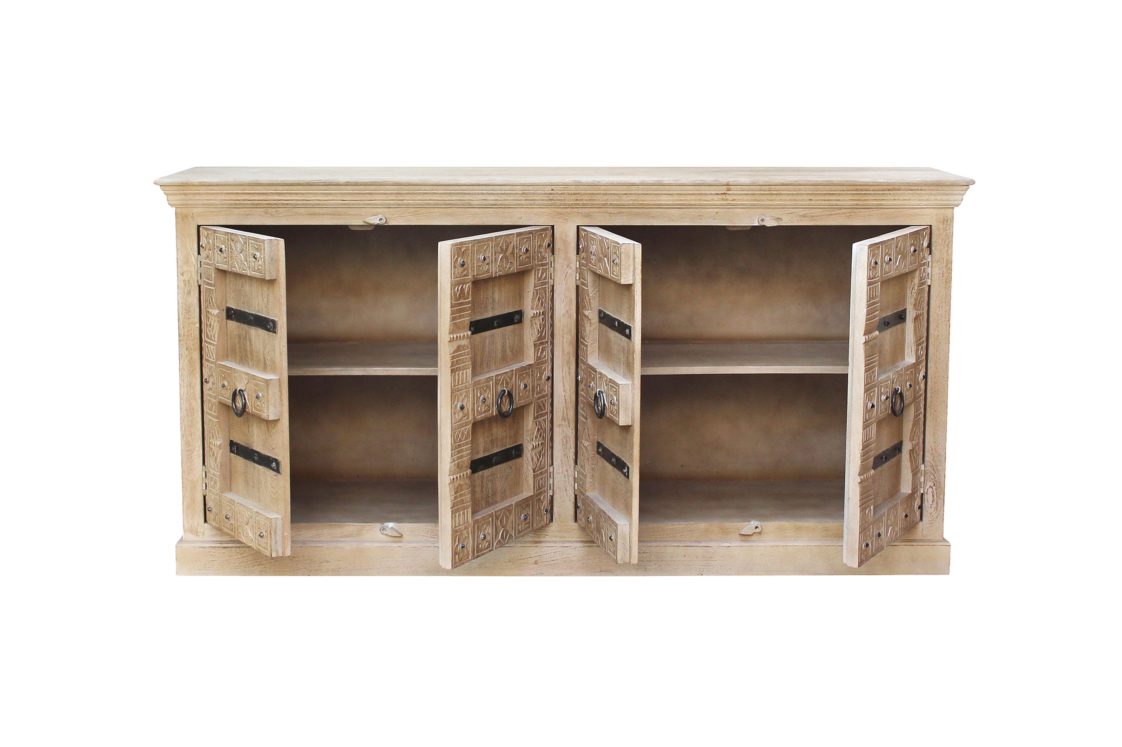 SIT Möbel bringt einen Hauch von Exotik in Ihr Zuhause und begeistert mit seinem charakterstarken Design. Gefertigt aus massivem Mangoholz, besticht es durch seine aufwendig gestaltete Front mit kunstvollen Schnitzereien und stilvollen Metallelementen, die dem Möbelstück eine warme, antik anmutende Ausstrahlung verleihen. Hinter vier Türen verbirgt sich großzügiger Stauraum, der durch jeweils einen festen Einlegeboden sinnvoll unterteilt ist. So lassen sich verschiedenste Gegenstände ordentlich und übersichtlich verstauen – von Geschirr über Wohnaccessoires bis hin zu Alltagsutensilien. Die großzügige Deckplatte bietet ausreichend Platz, um dekorative Elemente wie große Vasen, Pflanzen oder andere Hingucker stilvoll zu präsentieren und die besondere Optik des Sideboards zusätzlich hervorzuheben. Leichte, bewusst eingearbeitete Gebrauchsspuren unterstreichen den individuellen Charakter und sorgen für eine authentische, lebendige Ausstrahlung. Gleichzeitig lässt sich das Möbelstück vielseitig kombinieren und harmoniert sowohl mit modernen als auch mit klassischen oder rustikalen Einrichtungsstilen. Dank der Verwendung von robustem Mangoholz überzeugt das