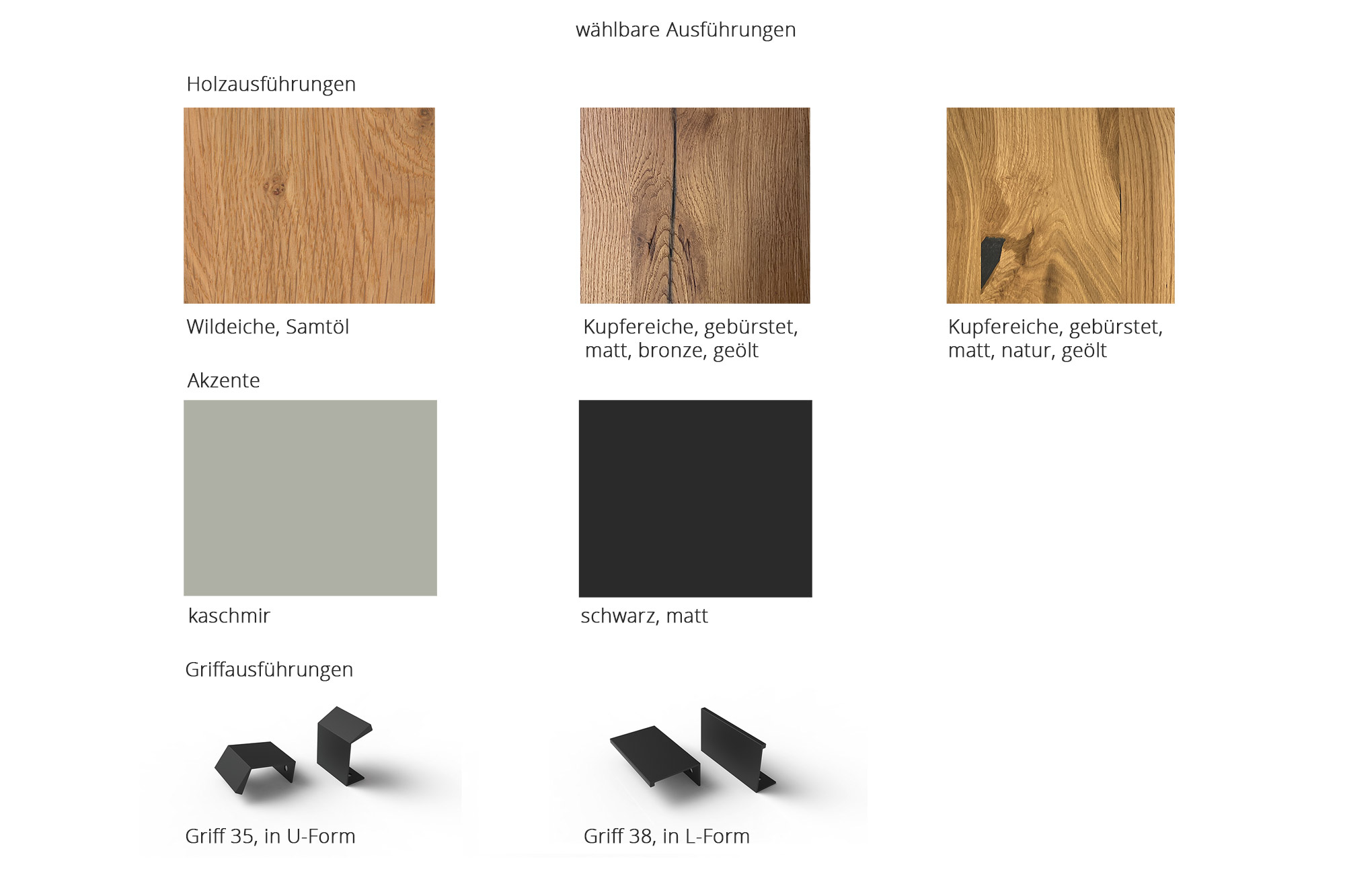 - Korpus: Wildeiche, Spanplatten innen und außen edel furniert