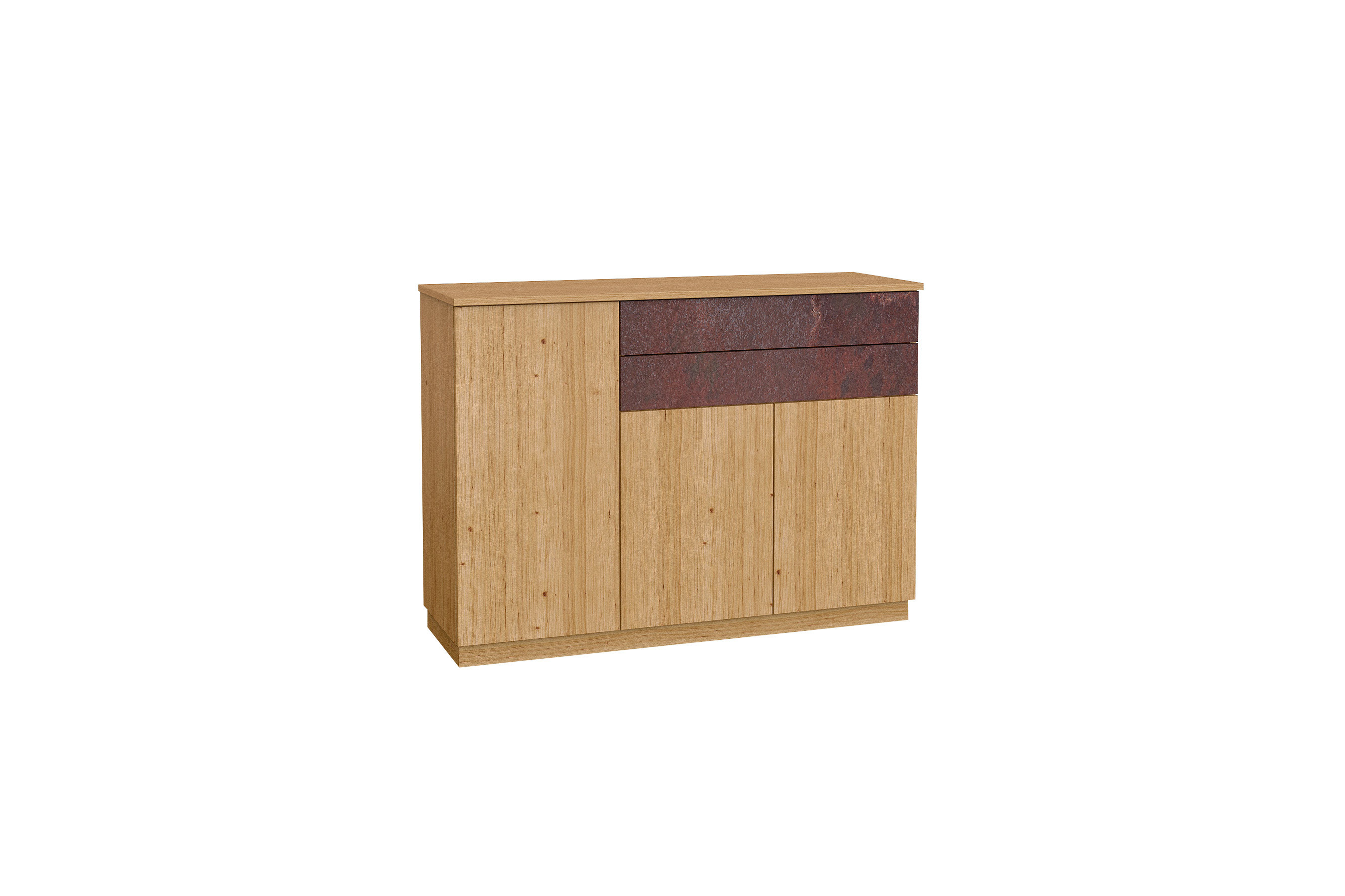 Struktur entsteht dort, wo Gestaltung und Funktion ineinandergreifen. Das Sideboard von Schösswender folgt diesem Prinzip und zeigt sich als ruhiger, klar gegliederter Ordnungsgeber im Wohnraum. Edles Wildeichenfurnier prägt die Fläche mit einer natürlichen und lebendigen Maserung, die durch die Oberfläche in Samtlack eine sanfte, gleichmäßige Tiefe erhält. Dadurch wirkt das Möbel hochwertig, ohne sich in den Vordergrund zu drängen. Die Metallabsetzungen in Rostoptik an den Schubkästen setzen dazu einen bewusst gesetzten Kontrast und verleihen dem Sideboard von Schösswender eine markante, leicht industrielle Nuance. Im Aufbau zeigt sich eine klare funktionale Logik: Hinter drei Holztüren mit jeweils einem Holzboden entsteht großzügiger Stauraum für größere Gegenstände. Ergänzt wird dies durch zwei Schubkästen, die kleinere Dinge ordentlich aufnehmen und schnell zugänglich machen. So ergibt sich eine ausgewogene Kombination aus geschlossenen Flächen und strukturierter Innenaufteilung. Die TipOn-Technik ermöglicht eine grifflose Bedienung und unterstützt die reduzierte Formensprache. Der flache Sockel sorgt für eine stabile Basis und unterstreicht die ruhige, bodennahe Präsenz des Möbels. Ein Sideboard, das nicht auf Effekte setzt, sondern durch Material, klare Gliederung und eine durchdachte Nutzung überzeugt – und sich harmonisch in die Serie Tessaro-living einfügt.
