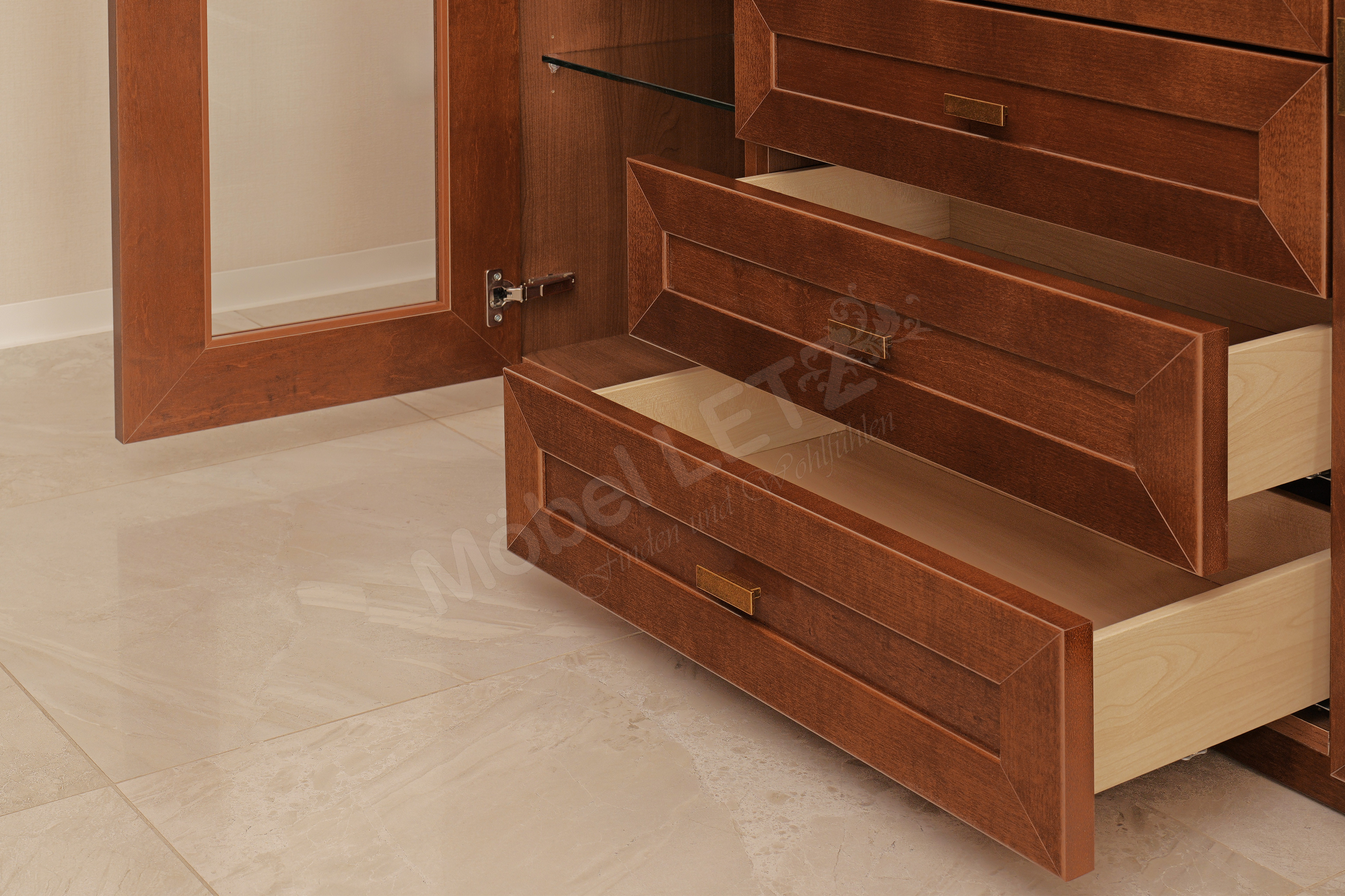 - Korpus/ Front: Cognac antik, dunkel gebeiztes Ahornfurnier