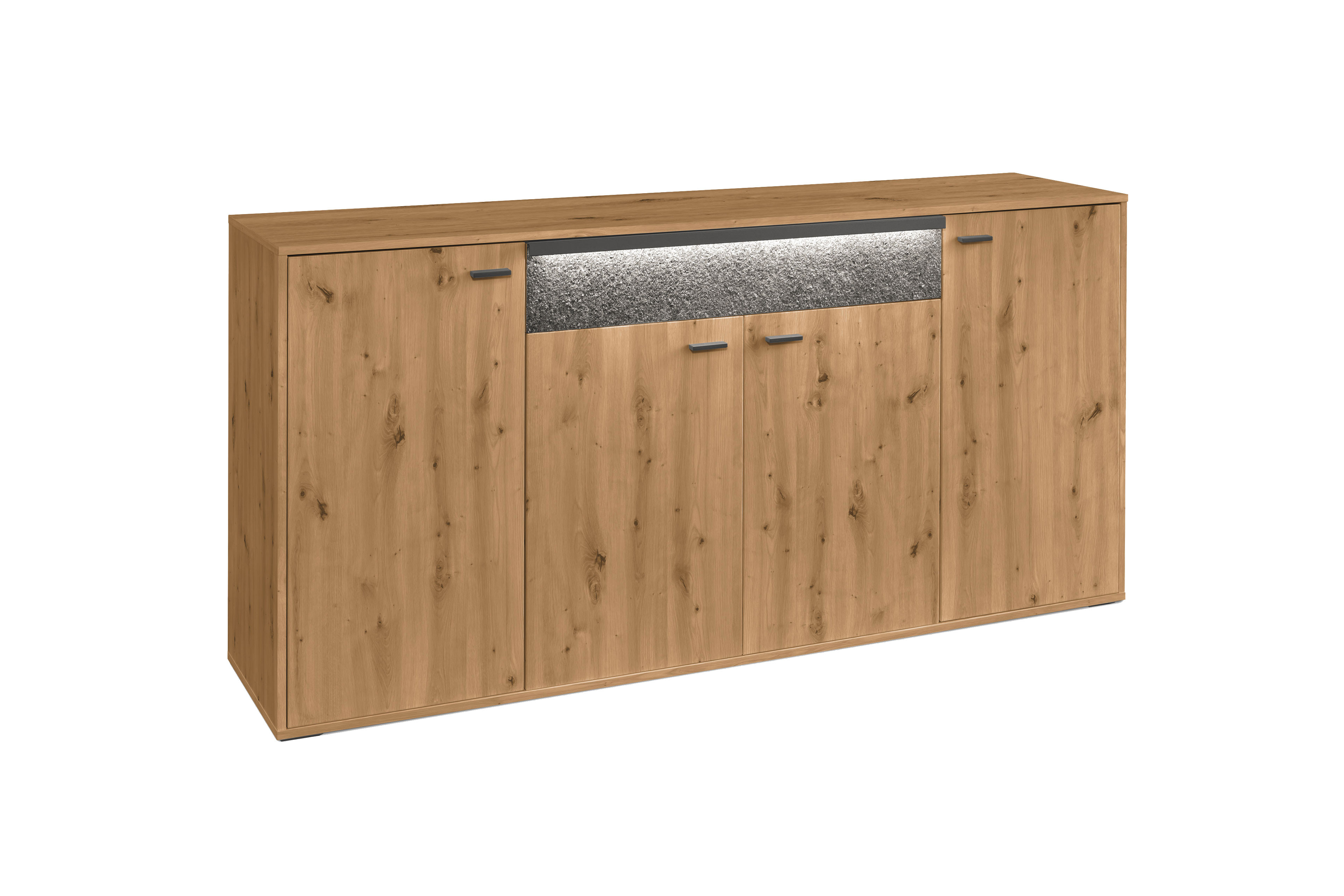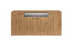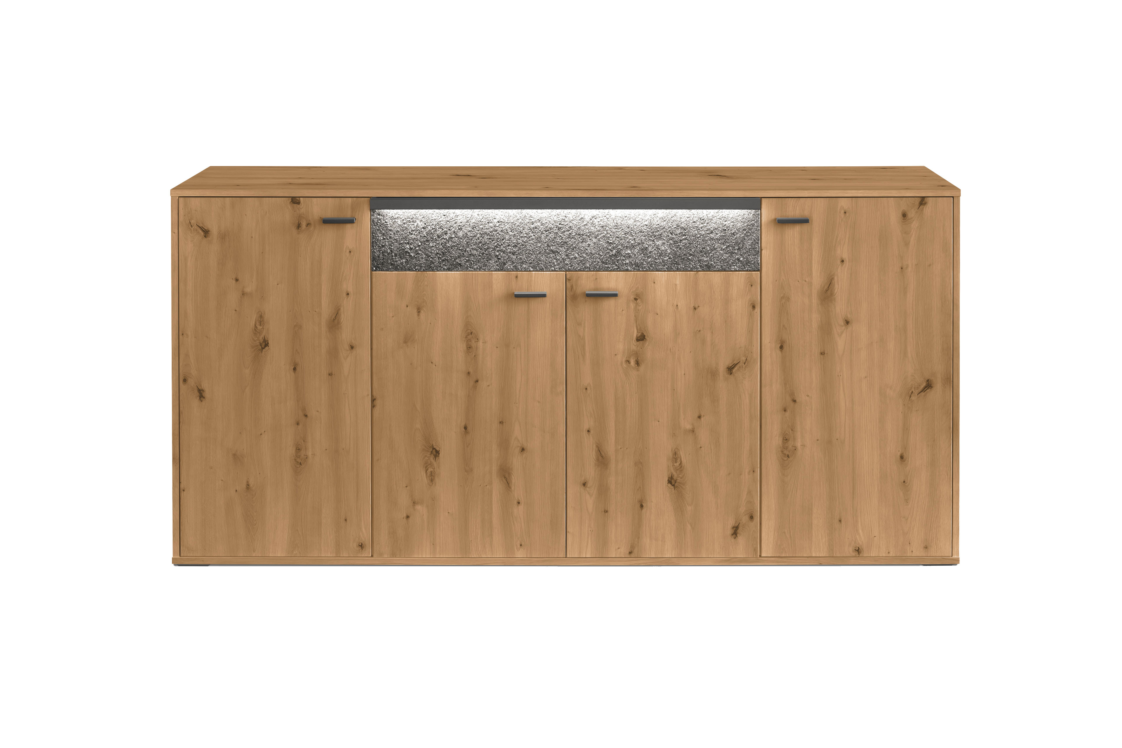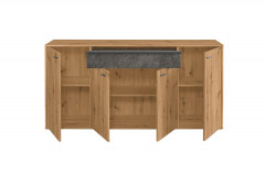 Ein Stauraummöbel als Statement – das bekommen Sie mit diesem Sideboard aus der Kollektion Deltona von set one by Musterring. Das viertürige Element bietet auf insgesamt drei Böden viel Platz für alle Dinge, die Sie im Wohn- und Esszimmer sicher unterbringen möchten. Das Highlight ist aber der Schubkasten oben in der Mitte, welcher mit einem Zierelement in Sandstein versehen ist. Dank der inkludierten Beleuchtung ist dieser Bereich nicht nur haptisch, sondern auch optisch ein Hingucker. Das Spiel von Licht und Schatten erzeugt einen besonderen Effekt in Ihrem Wohnraum. Überzeugen Sie sich selbst von der Vielseitigkeit der Serie Deltona. Sie finden sowohl im hinterlegten Typenplan als auch im Möbelkonfigurator alle Einzeltypen und Vorschlagskombinationen zur Inspiration und zum direkten Zusammenstellen. Neben Vitrinen, Highboards und Lowboards finden Sie auch einen Couchtisch und passende Wandboards. set one by Musterring bietet für jeden die passende Einrichtung. Überzeugen Sie sich selbst und richten Sie sich neu ein.