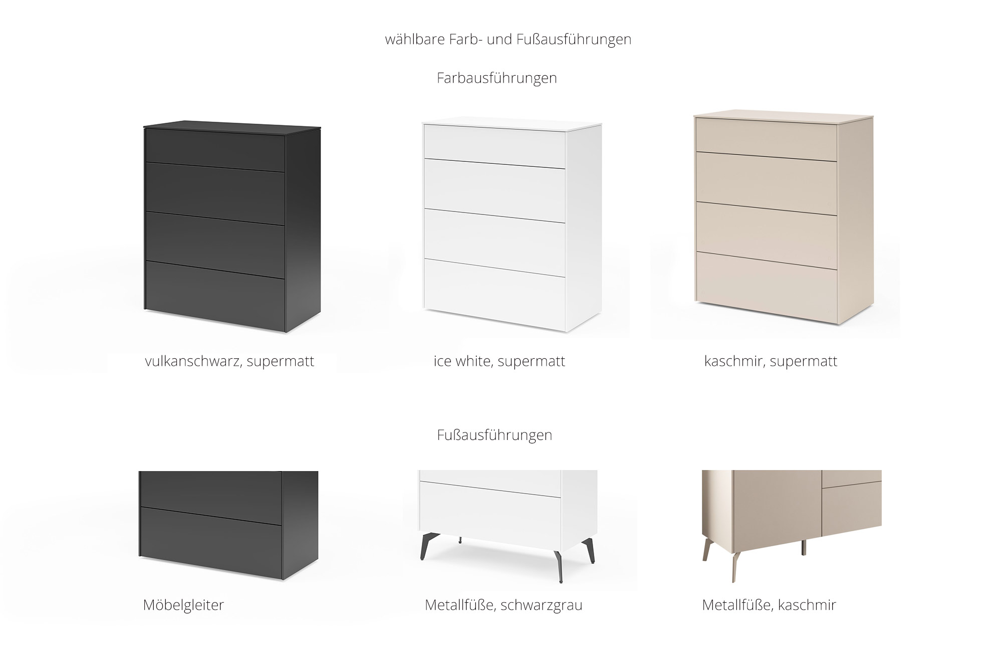 In diesem Angebot zeigen wir Ihnen ein Möbel, welches nicht nur jegliche Blicke auf sich zieht, sondern auch für zusätzlichen Stauraum sorgt. Das Sideboard aus dem Hause set one by Musterring der Kollektion Riverside ist mit vier Schubkästen ausgestattet, in denen Sie genügend Platz erhalten, um Alltagsgegenstände, Dokumente oder Wohnaccessoires geordnet unterzubringen. Eine integrierte Softclose-Funktion sorgt dabei für ein sanftes und nahezu geräuschloses Schließen der Schubkästen – ein Komfortmerkmal, welches man nicht mehr missen möchte. Weiterhin überzeugt die Modellreihe Riverside durch ihre Vielseitigkeit und individuellen Anpassungsoptionen. Die Kommode ist in insgesamt drei verschiedenen Farbausführungen erhältlich – entscheiden Sie sich für ein klassisches Weiß, für ein modernes Kaschmir oder für ein elegantes Schwarz. Zusätzlich können Sie das Möbelstück mit schwarzgrauen oder mit kaschmirfarbenen Metallfüßen versehen. Wie Sie sehen, ist das Möbel über unsere Zusatzoptionen im Nu anpassbar. Für eine personalisierte Wohnraumgestaltung steht Ihnen außerdem unser Möbelplaner zur Verfügung. In diesem finden Sie neben unterschiedlichen Ausführungsvarianten auch noch weitere Einzelmöbel aus dieser Produktreihe. Schauen Sie doch einmal hinein und gestalten Sie sich mit den vielzähligen Möbeln von set one by Musterring ein harmonisches Zuhause.