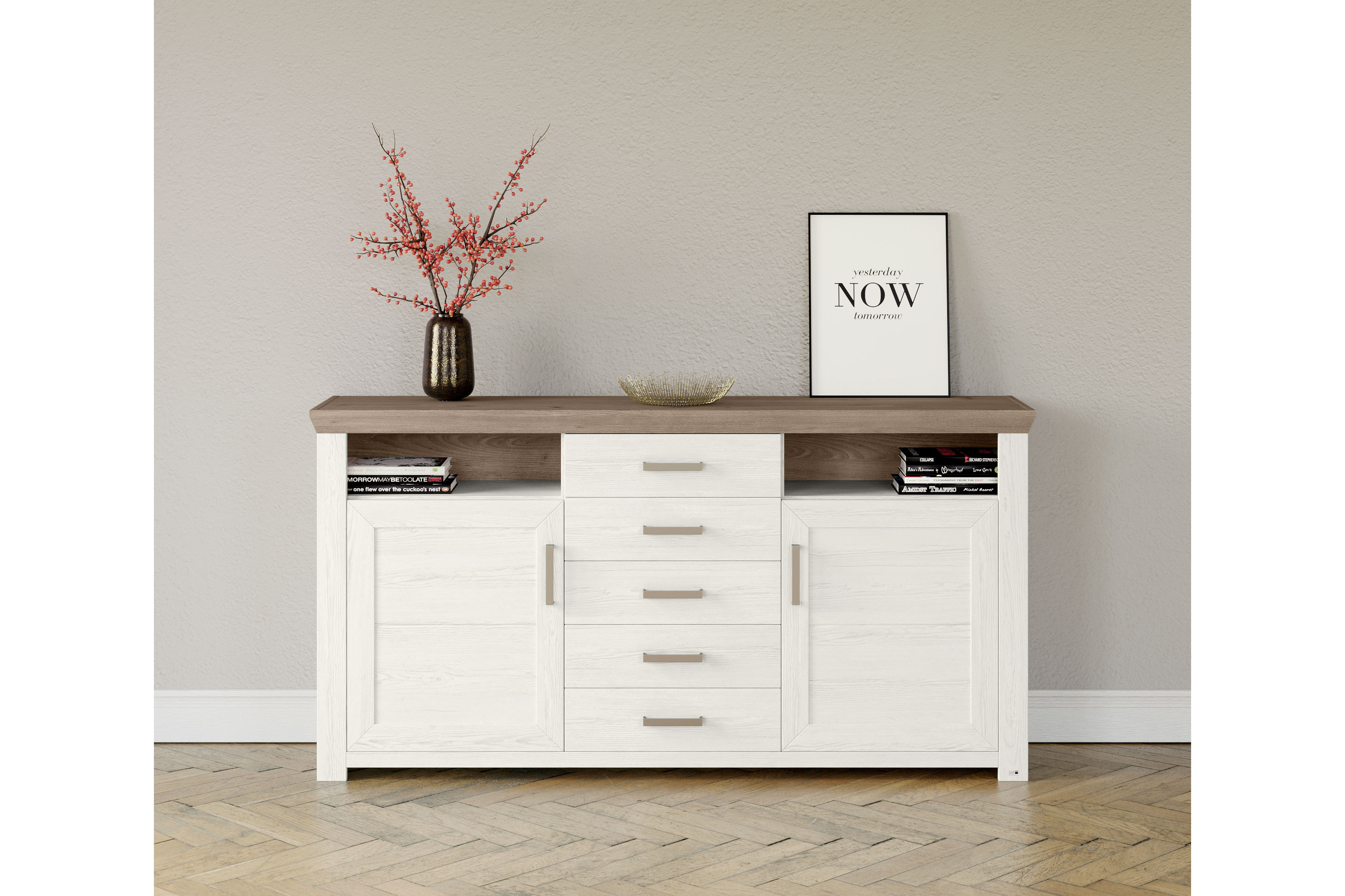 - Sideboard mit 2 Holztüren, 5 Schubkästen, 2 offenen Fächern und 2 Holzeinlegeböden