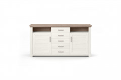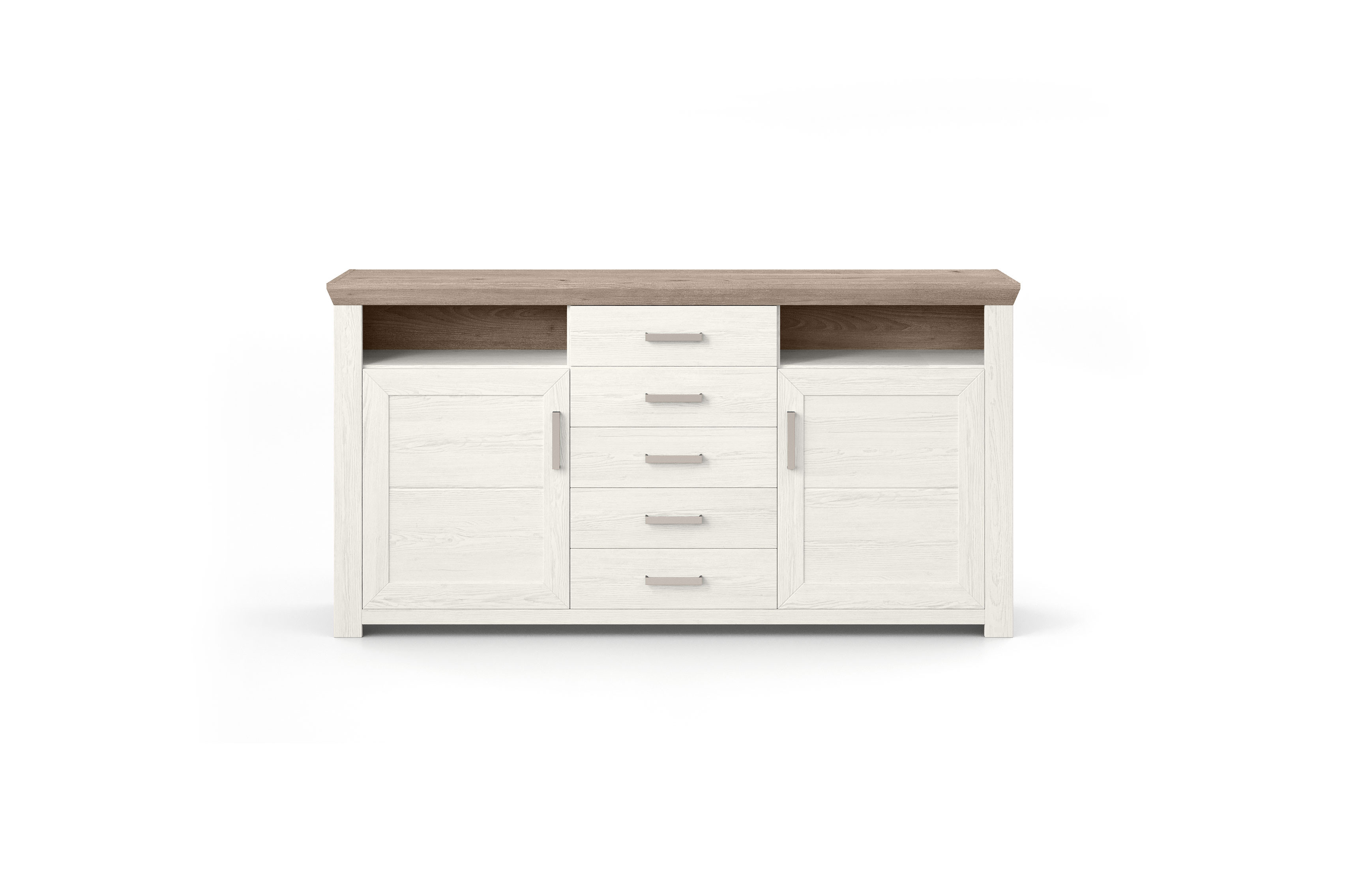 Mit einem Sideboard holt man sich praktischen Stauraum ins Haus, der auch noch richtig gut aussieht. Diese Kommode aus der Modellreihe York von set one by Musterring bezaubert mit der zeitlosen Ausführung in Pino Aurelio und Eiche Nelson, welche einen Hauch von Landhausstil in Ihre vier Wände bringen wird. Mit zwei Holztüren, jeweils einem dahinterliegenden Boden, fünf Schubkästen und zwei offene Fächer bietet das Möbel umfangreichen Stauraum sowie Ablagefläche und Präsentationsmöglichkeiten. Die eleganten Metallbügelgriffe setzen dem Design noch das i-Tüpfelchen auf. Entscheiden Sie sich für diese Ausführungsvariante oder eine der beiden anderen Optionen, um das Element ganz nach Ihrem Geschmack anzupassen. Die Schubkästen sind serienmäßig mit einer Unterflurführung sowie Softabstoppungen versehen. Für die Türen finden Sie diese Möglichkeit zur Auswahl in den Zusatzoptionen. Weitere passende Solisten sowie komplette Wohnwandvorschläge finden Sie im Typenplan und dem Möbelkonfigurator. Lassen Sie sich von set one by Musterring verzaubern.