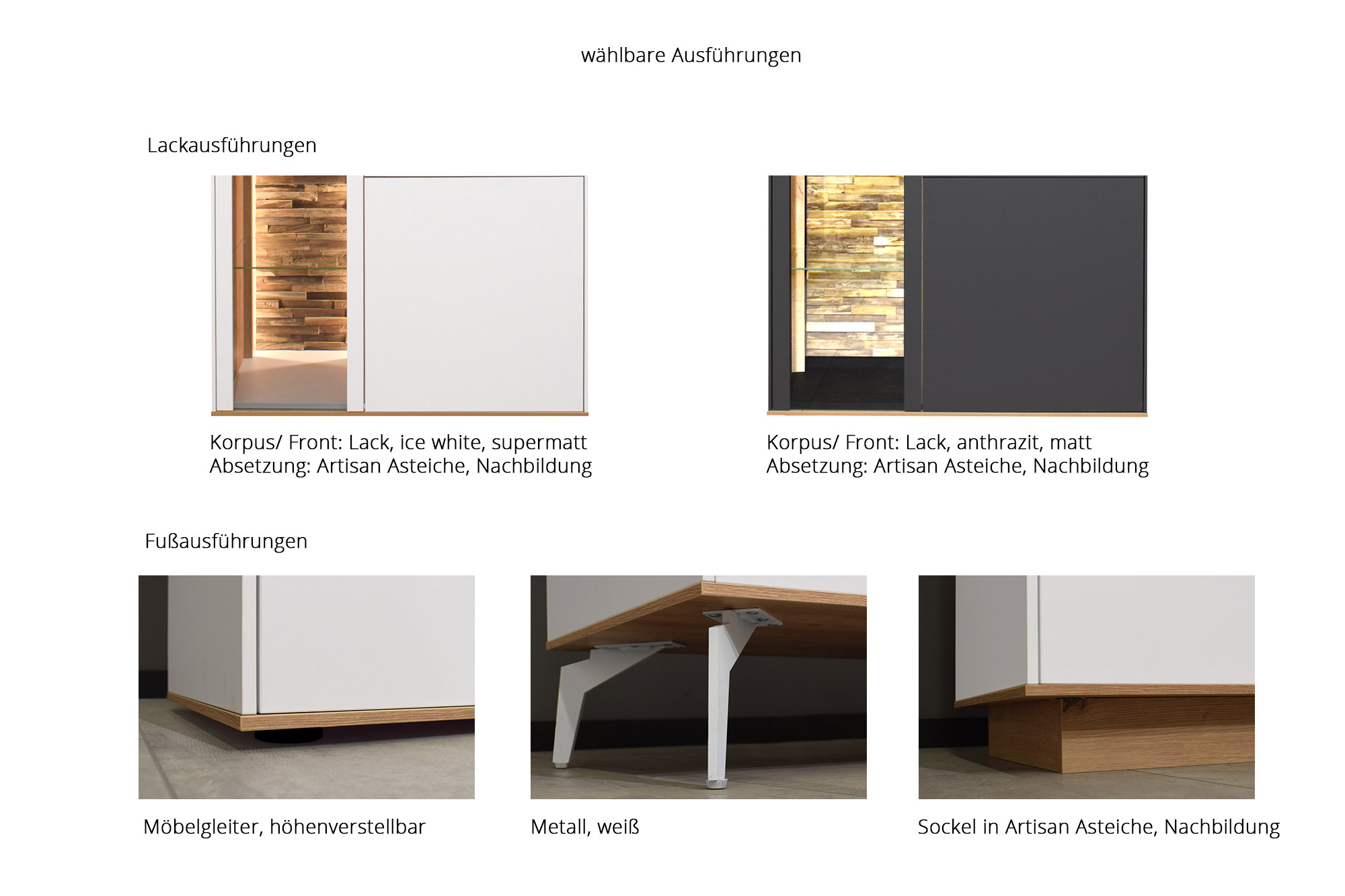 - Absetzung Paneelrückwand: Lack, ice white, supermattt, E1-Spanplatte mit Melaminbeschichtung, kratzfest, mit ABS-Kanten