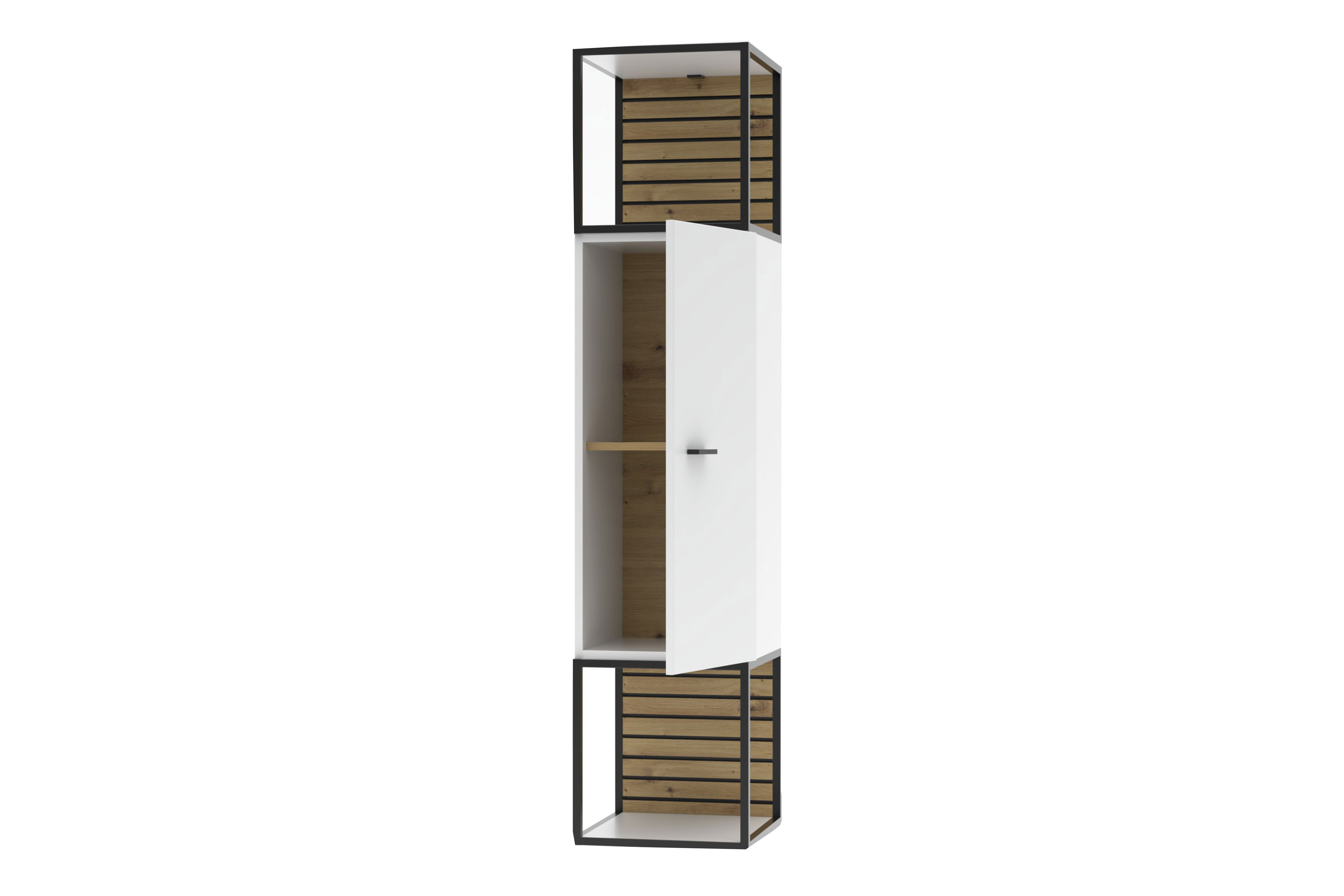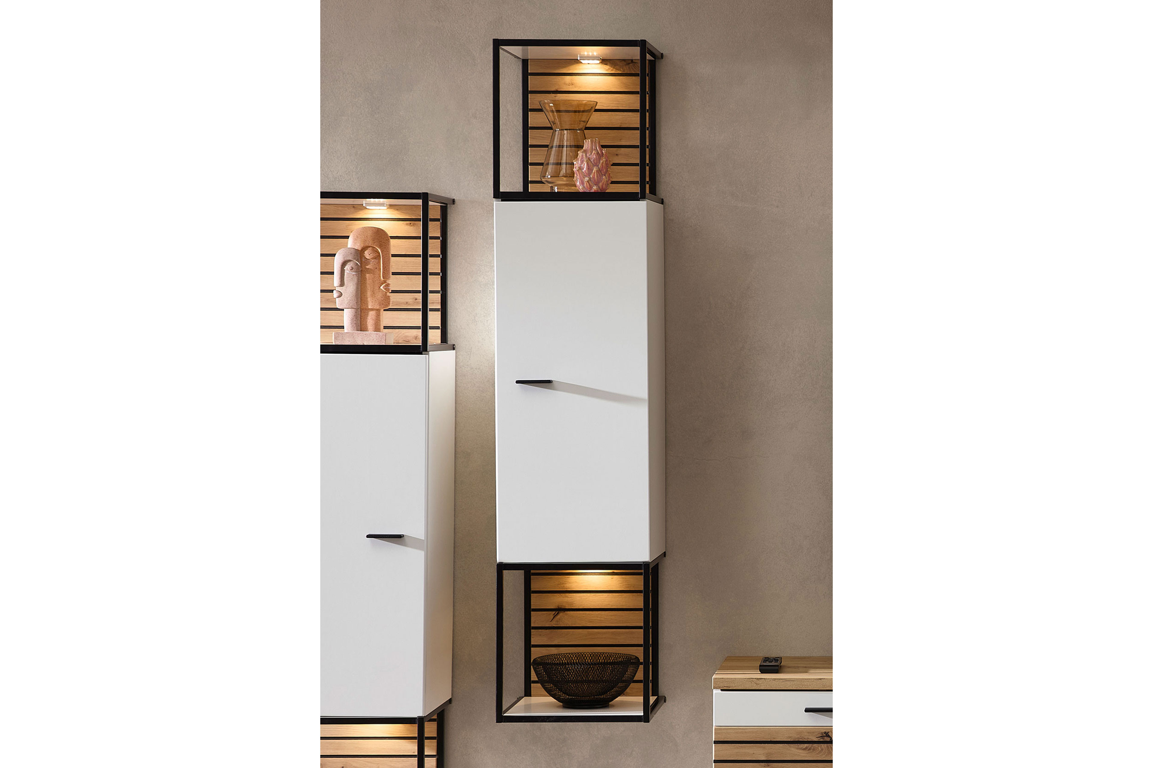Das Hängeelement aus der Modellreihe Fresno von Wohnconcept vereint modernes Design, hochwertige Materialien und clevere Funktionalität in einem kompakten Möbelstück. Die Holztür in mattem Weiß sorgt für eine klare, elegante Optik, während die Rückwand in Artisan Eiche mit feiner Leistenoptik warme, natürliche Akzente setzt. Das Element ist sowohl mit links- als auch rechtsseitigem Türanschlag möglich und passt sich flexibel jeder Raumsituation an. Hinter der Tür und in den zwei offenen Fächern bietet das Möbel praktischen Stauraum für Bücher, Deko oder Multimedia-Accessoires. Optional lassen sich die Fächer mit einer LED-Beleuchtung ausstatten, die sich bequem über eine Funkfernbedienung steuern lässt – ideal, um stimmungsvolle Lichtakzente zu setzen. Der Metallgriff in Anthrazit mit feiner Struktur rundet das Design ab, sorgt für angenehmes Handling und verleiht dem Möbelstück einen modernen, hochwertigen Look. Das Element kann einzeln genutzt werden oder in Kombination mit anderen Möbeln der Modellreihe wie TV-Unterteilen, Wandboards oder Sideboards zu einem harmonischen Einrichtungskonzept zusammengestellt werden. So entsteht eine stilvolle, durchdachte Wohnwand, die Funktionalität und Design perfekt miteinander verbindet.