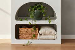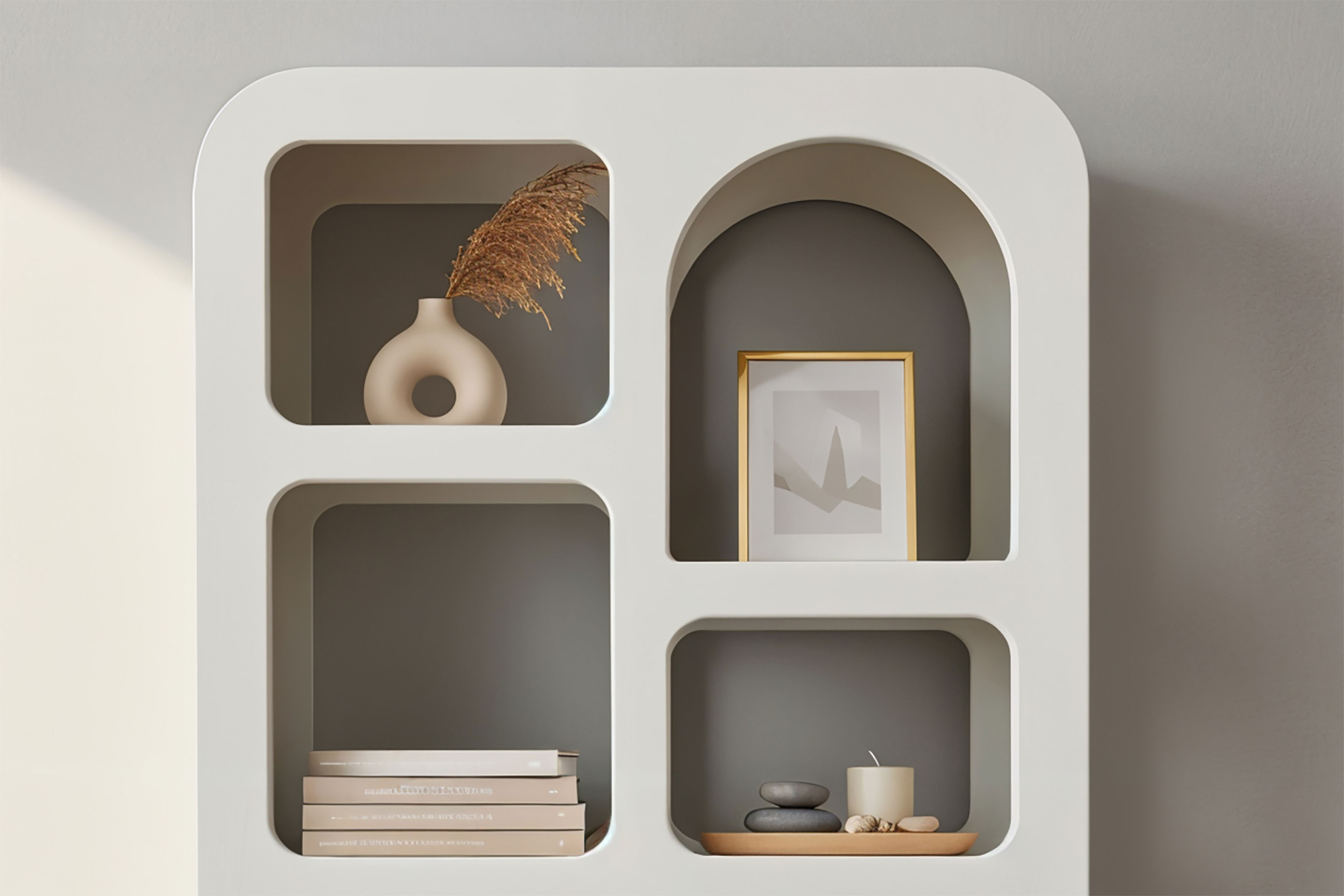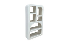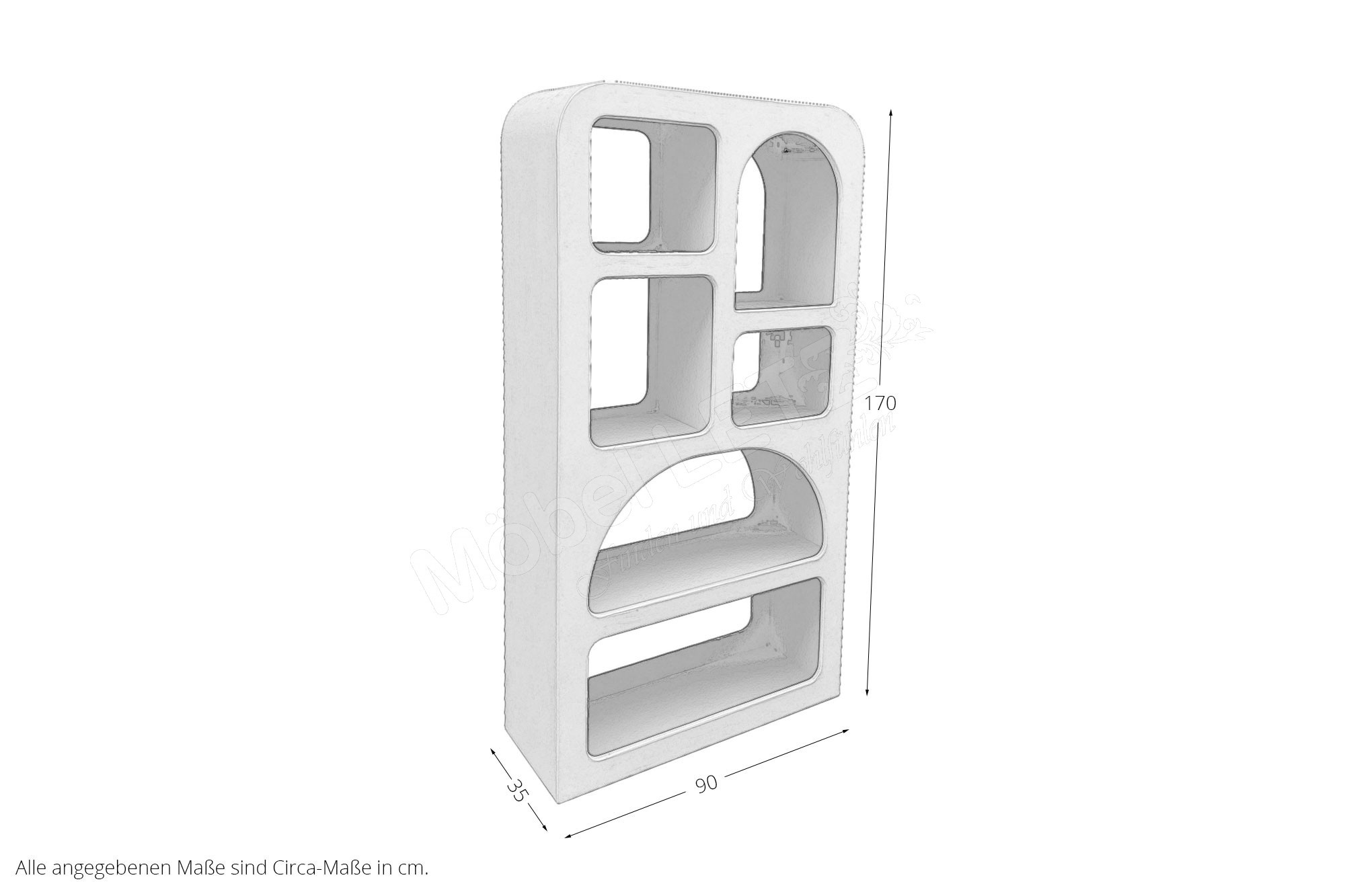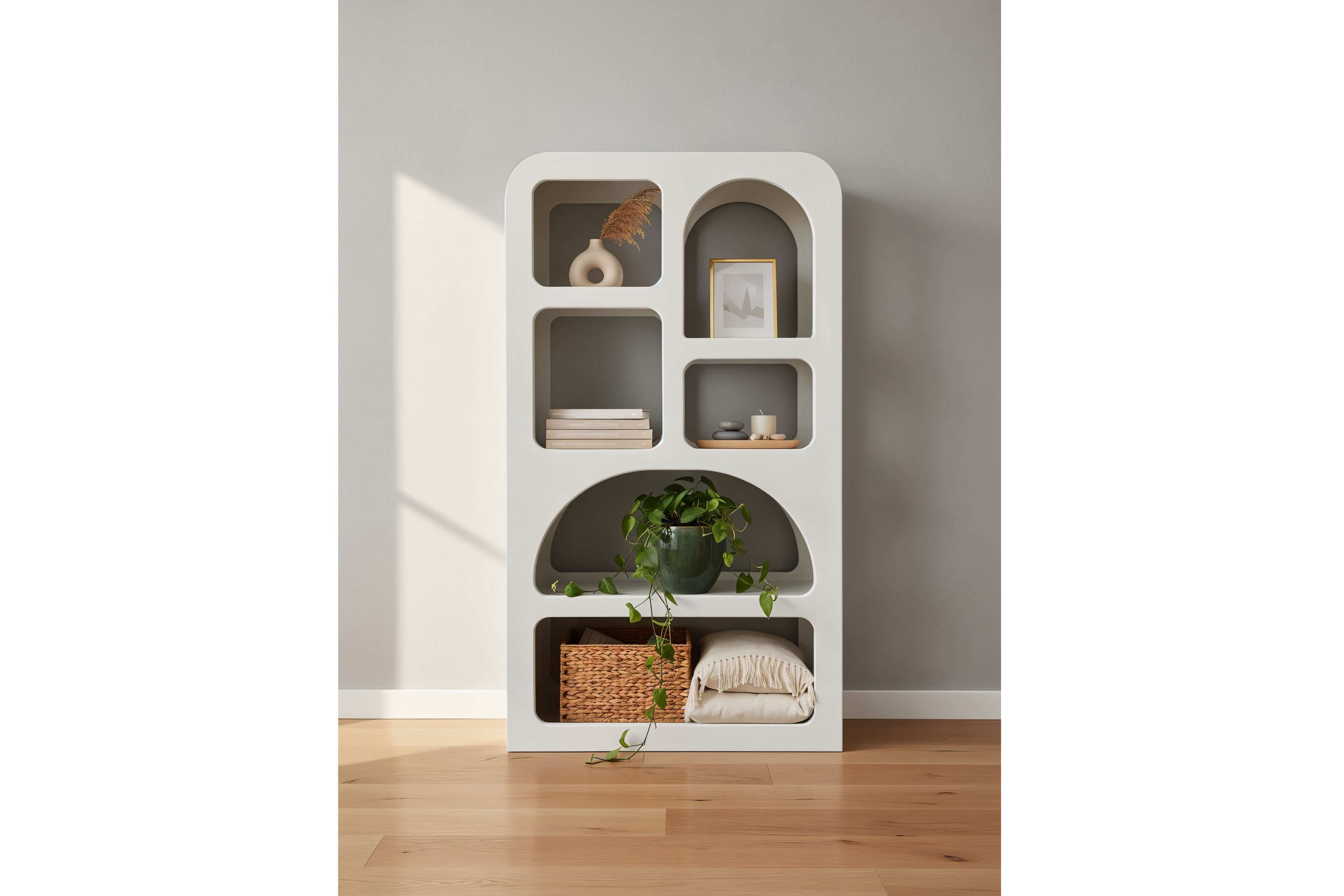 Mit seiner klaren Linienführung und der ausdrucksstarken, geometrischen Gestaltung setzt dieses Regal aus der Serie Holvik von SIT Möbel ein modernes Statement im skandinavischen Stil. Mit einer Höhe von circa 170 Zentimetern bietet es großzügigen Stauraum auf sechs offenen Fächern, die in spannenden geometrischen Formen angeordnet sind und dem Möbelstück eine besondere optische Dynamik verleihen. Veredelt mit edlem Kalkputz in strahlendem Weiß strahlt das Regal eine ruhige, klare Ästhetik aus und bringt gleichzeitig eine angenehme Leichtigkeit in den Raum. Die matte, fein strukturierte Oberfläche unterstreicht den modernen Charakter und sorgt dafür, dass sich das Regal harmonisch in unterschiedliche Einrichtungsstile einfügt. Ob im Wohnzimmer zur Präsentation von Büchern und Dekoration, im Homeoffice für stilvolle Ordnung oder im Schlafzimmer als modernes Stauraumelement. Das Regal lässt sich vielseitig einsetzen. Dank seines luftigen, offenen Aufbaus eignet es sich zudem hervorragend als stilvoller Raumteiler, um Wohnbereiche dezent voneinander abzugrenzen. So wird dieses Regal nicht nur zu einem funktionalen Stauraummöbel, sondern zu einem architektonisch wirkenden Gestaltungselement, das skandinavische Klarheit, zeitloses Design und wohnliche Eleganz auf harmonische Weise vereint.