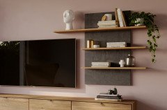 Das Wandpaneel von Elfo Möbel aus der Modellreihe Rosa – Architektur für Ihre Wand. Das Hängemöbel ist weit mehr als ein funktionales Regal – es ist ein architektonisches Gestaltungselement, das Räume strukturiert und Atmosphäre schafft. Das Zusammenspiel von Eichenböden und einer marmorierten Rückwand in Grau verleiht dem Paneel eine besondere Tiefenwirkung und macht es zu deinem stilvollen Blickfang. Mit drei Ablageböden bietet der Solist vielseitige Präsentationsflächen für Bücher, Kunstobjekte oder persönliche Lieblingsstücke. Dank der beidseitigen Verwendbarkeit kann das Paneel sowohl rechts als auch links montiert werden und passt sich flexibel an unterschiedliche Raumkonzepte an. Ob als Solitär oder in Kombination mit weiteren Möbeln aus der Serie Rosa – dieses Wandpaneel verleiht Wohnräumen Struktur, Eleganz und Individualität. Es ist die perfekte Wahl für alle, die modernes Design mit natürlicher Materialästhetik miteinander verbinden möchten.