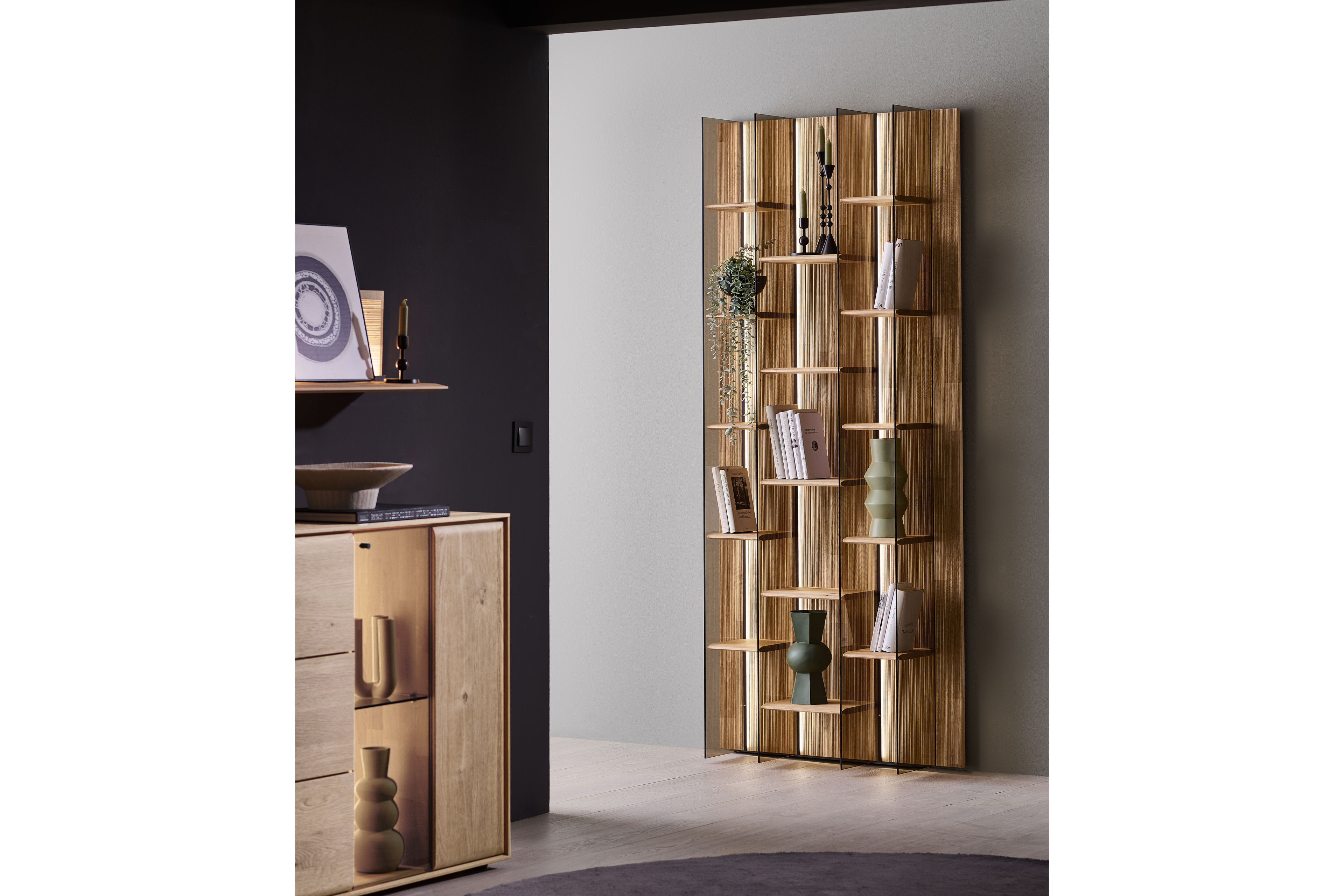 Dieses Paneelregal von Hartmann setzt neue Maßstäbe in Design und Funktion. Mit seiner markanten Rückwand aus geschropptem Eichenholz und den eleganten Glasseiten wird es zum Blickfang in jedem Bereich. Die markante Struktur des Holzes verleiht dem Möbelstück eine warme, lebendige Ausstrahlung und macht jedes Element zu einem Unikat. Gleichzeitig sorgen die vier Trennwände aus edlem Parsolglas für eine leichte, beinahe schwebende Optik, die den Raum offen wirken lässt und die präsentierten Objekte stilvoll in Szene setzt. Mit insgesamt 15 stabilen Holzböden bietet das Regal eine sichtbar elegante Ablagefläche für Bücher, ohne dabei überladen zu wirken. Es eignet sich ebenso hervorragend zur dekorativen Inszenierung von kleinen Pflanzen, Vasen oder Kerzen, die durch das getönte Glas eine besonders stimmungsvolle Wirkung entfalten. So entsteht eine harmonische Verbindung aus Funktion und Ästhetik, die sowohl in Wohnräumen als auch in modernen Essbereichen überzeugt. Ein weiteres Highlight ist die optionale Beleuchtung, die gezielt Akzente setzen kann. Sie unterstreicht die natürliche Maserung der Eiche und lässt die Glasflächen dezent schimmern, wodurch eine angenehme, wohnliche Atmosphäre entsteht. Gerade in den Abendstunden gewinnt das Regal dadurch zusätzlich an Ausdruckskraft. Dank der Erweiterungsmöglichkeiten im Möbelplaner sowie im Typenplan lässt sich das Wandregal individuell an unterschiedliche Raumkonzepte anpassen. Ob als einzelnes Designstück oder als Teil einer größeren Wohnwand – es bietet flexible Gestaltungsmöglichkeiten und wächst mit den Anforderungen seiner Nutzer. So wird der Solist aus der Modellreihe Vala zum stilprägenden Element in jeder Umgebung.