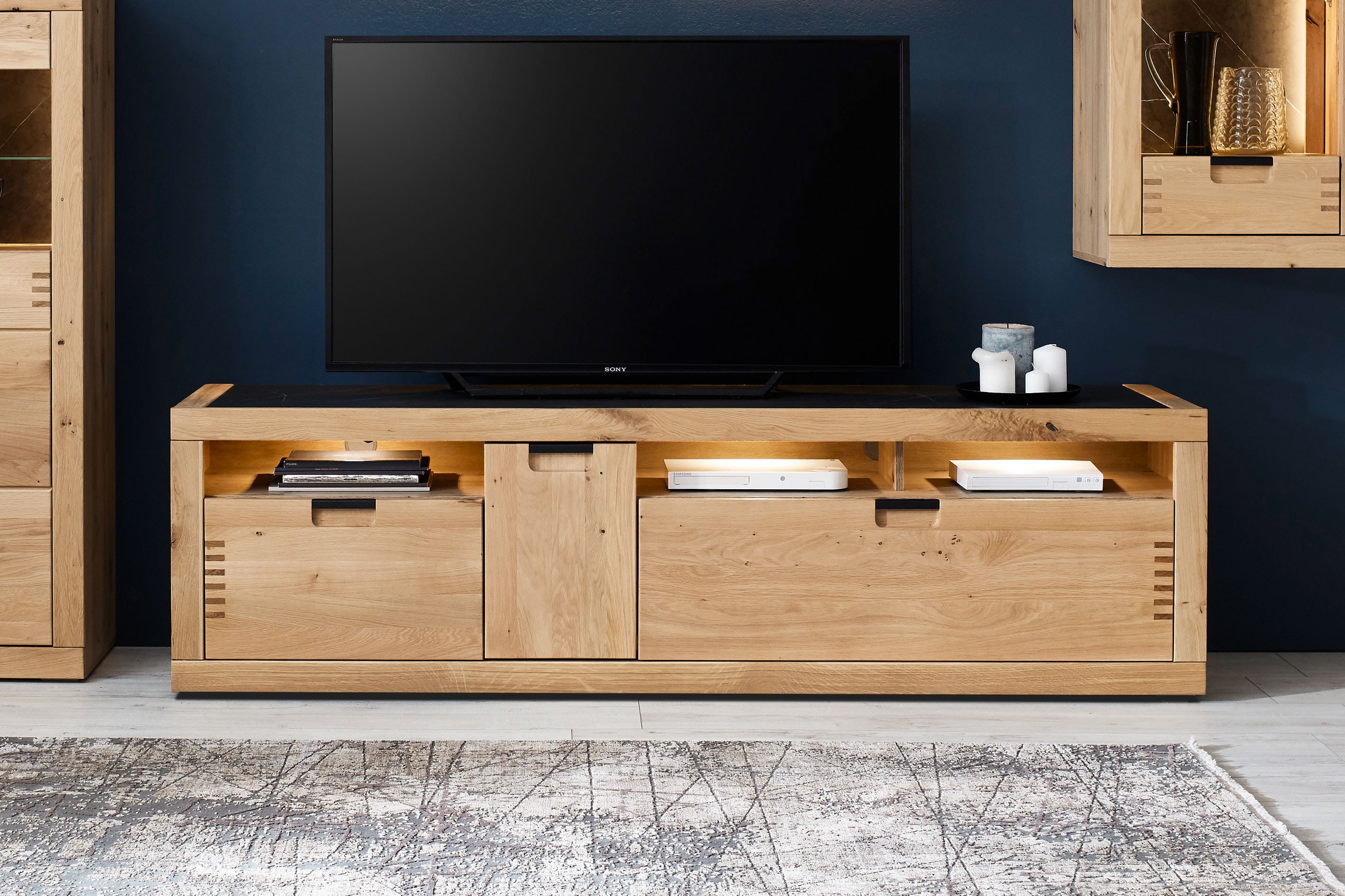 Das Lowboard aus der Modellreihe Esberg von IDEAL Möbel vereint natürliche Eiche mit einer Neuinterpretation eines klassischen Designs. Ein Schubkasten, eine Tür mit Holzboden dahinter, ein Doppelschubkasten sowie drei offene Fächer bieten Stauraum und die Möglichkeit, technische Geräte sicher unterzubringen. Auch Ihr Fernseher wird sich auf dem Abdeckblatt mit eingelassener Schieferabsetzung wohlfühlen. Außerdem finden dort neben weiterem Equipment wie Konsolen oder Bluray-Player auch Dekorationen Platz. Die gedämpften Schubkästen bieten Stauraum für Kabel und Batterien sowie andere Kleinigkeiten, die man im Wohnzimmer benötigt. Weitere passende Elemente zu diesem Lowboard finden Sie sowohl im hinterlegten Typenplan als auch im Möbelplaner, mit dessen Hilfe Sie sich eine Wohnwand nach Ihrem Geschmack zusammenstellen können. Entdecken Sie noch heute die Vielfalt der Serie Esberg von IDEAL Möbel und holen Sie sich ein Stück Natur ins Zuhause.