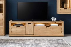 - Lowboard mit 1 Holztür (Rechtsanschlag), 1 Schubkasten links, 1 Doppelschubkasten rechts, 3 offenen Fächern und 1 Holzboden
