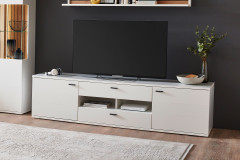 Lowboards dienen nicht nur als sicherer Standort für einen Fernseher – sie sind außerdem die perfekten Stauraumelemente für Kabel, Batterien oder sonstigem technischen Zubehör. Dieses Exemplar aus der Modellreihe Morella von IDEAL Möbel kommt in klassischem Weiß daher, was es zu einem flexiblen Begleiter für die unterschiedlichsten Wohnstile macht. Zwei Holztüren, zwei Schubkästen und zwei offene Fächer bieten Raum für alle Dinge, die Sie gern griffbereit haben möchten. Auch der Receiver oder die Konsole finden unter dem Deckblatt ihren neuen Stammplatz. Bloß ein Lowboard reicht Ihnen nicht? Entdecken Sie weitere passende Stücke im Typenplan oder dem Konfigurator von Morella. Vitrinen, Kommoden und Wandboards ergänzen dieses Angebot um weitere Möbel, mit denen Sie sich ein stimmiges Wohnzimmer einrichten können. Entdecken Sie weitere Highlights der Serie Morella von IDEAL Möbel und ergänzen Sie Ihr Zuhause mit Möbeln, die Stil und Funktion verbinden.