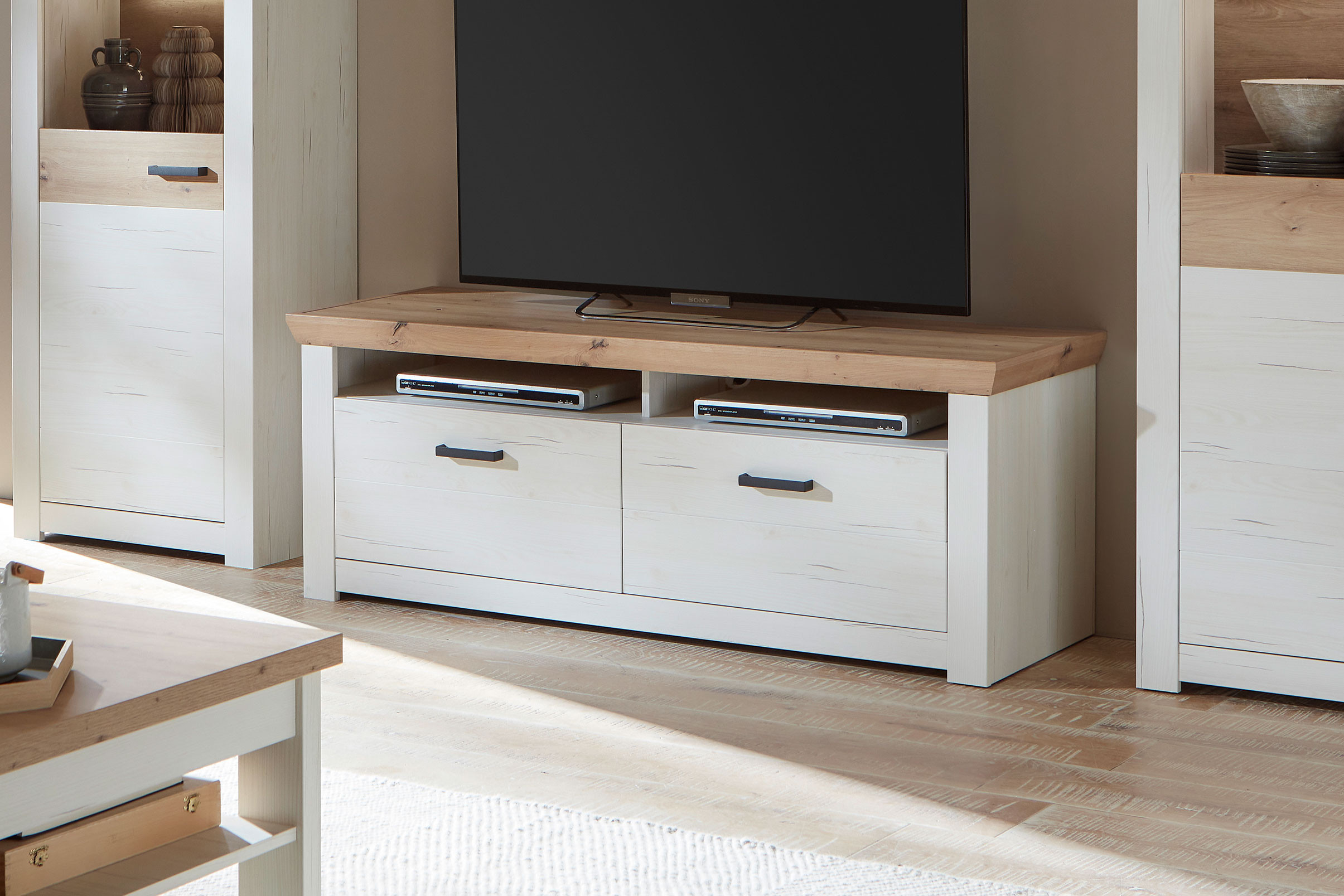 Das Lowboard der Modellreihe Nizza von IDEAL Möbel bietet mit zwei Schubkästen und zwei offenen Fächern eine durchdachte Kombination aus Stauraum und Präsentationsfläche. Hier findet Ihr Fernseher einen passenden Platz, während Medien, Zubehör oder andere Utensilien ordentlich untergebracht werden können. Die Schubkästen sind mit einer Dämpfung und Unterflurführungen ausgestattet, sodass sie sich angenehm leicht und komfortabel bedienen lassen. In den offenen Fächern können Sie Receiver, Spielkonsolen oder dekorative Elemente griffbereit platzieren. Erst in Verbindung mit dem Abdeckblatt und den sichtbaren Rückwänden der beiden offenen Fächer zeigt sich der besondere Look des Möbels: Während Korpus und Fronten in Pino Aurelio gehalten sind, setzen Eiche Artisan auf der Oberseite und im Bereich der sichtbaren Rückwände einen warmen, natürlichen Akzent. So entsteht ein stimmiges Gesamtbild, das moderne Klarheit mit wohnlicher Ausstrahlung verbindet und sich vielseitig in verschiedene Einrichtungsstile einfügt.
