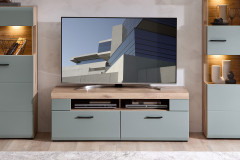 Die perfekte Abstellfläche für Ihr TV-Gerät – das ist dieses Innostyle TV-Unterteil aus der Fun Plus II Modellreihe. Mit einer Front in Schilfgrün und einem Korpus in hellem Viking Oak wird ein nahezu perfektes Gesamtbild geschaffen. Die matte Oberfläche der Front sorgt zusätzlich für ein besonderes Erscheinungsbild. Praktische Funktionalität wird durch zwei Schubkästen und zwei offene Fächer geboten. Die Schubkästen bieten Stauraum für Ihre Multimedia-Geräte, während die offenen Fächer eine stilvolle Präsentationsfläche für Dekorationsobjekte oder Multimedia-Zubehör darstellen. Zudem setzt die integrierte Beleuchtung nicht nur das Möbelstück selbst, sondern auch Ihre technischen Geräte gekonnt in Szene. Insgesamt präsentiert sich dieses TV-Unterteil als eine gelungene Verbindung von Form und Funktion, die nicht nur den Anforderungen an moderne Medienzentren gerecht wird, sondern auch einen stilvollen Beitrag zu Ihrer Wohnraumgestaltung leistet. Von TV-Unterteilen über Barschränke bis hin zu Vitrinen bietet die Fun Plus Serie eine umfassende Auswahl, um Ihren Wohnraum stilvoll zu gestalten. Informieren Sie sich diesbezüglich gern im beigefügten Typenplan. Unser engagierter Kundenservice steht Ihnen dabei stets zur Verfügung, um Ihnen bei Fragen, Anliegen oder einer persönlichen Beratung behilflich zu sein. Entdecken Sie die Vielfalt der Fun Plus II Modellreihe und lassen Sie sich von Qualität, Design und Kundennähe überzeugen.