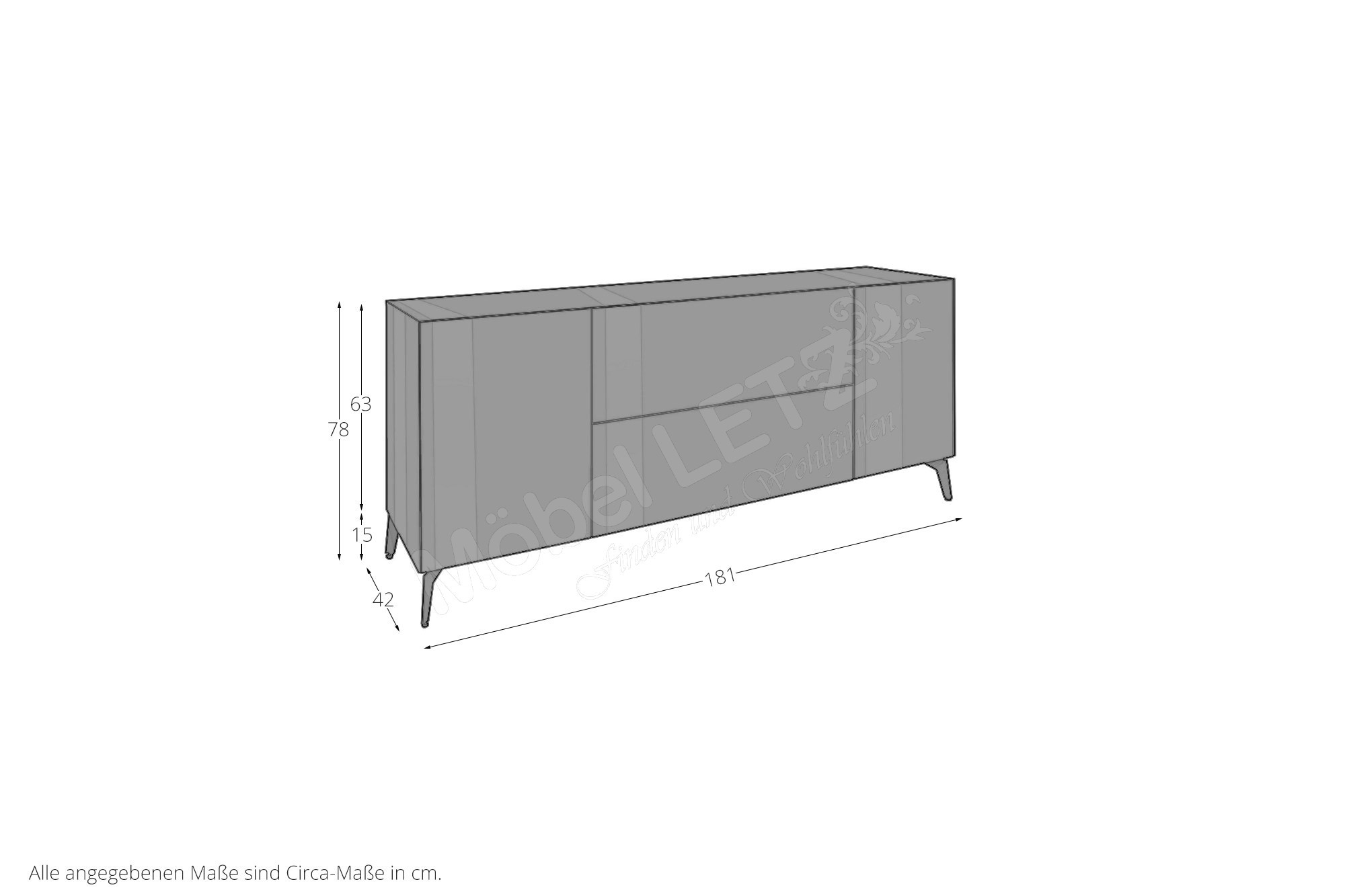 Gesamtmaße des Lowboards: BHT ca. 181/75/42 cm (Art-Nr. Metallfüße Gerade)