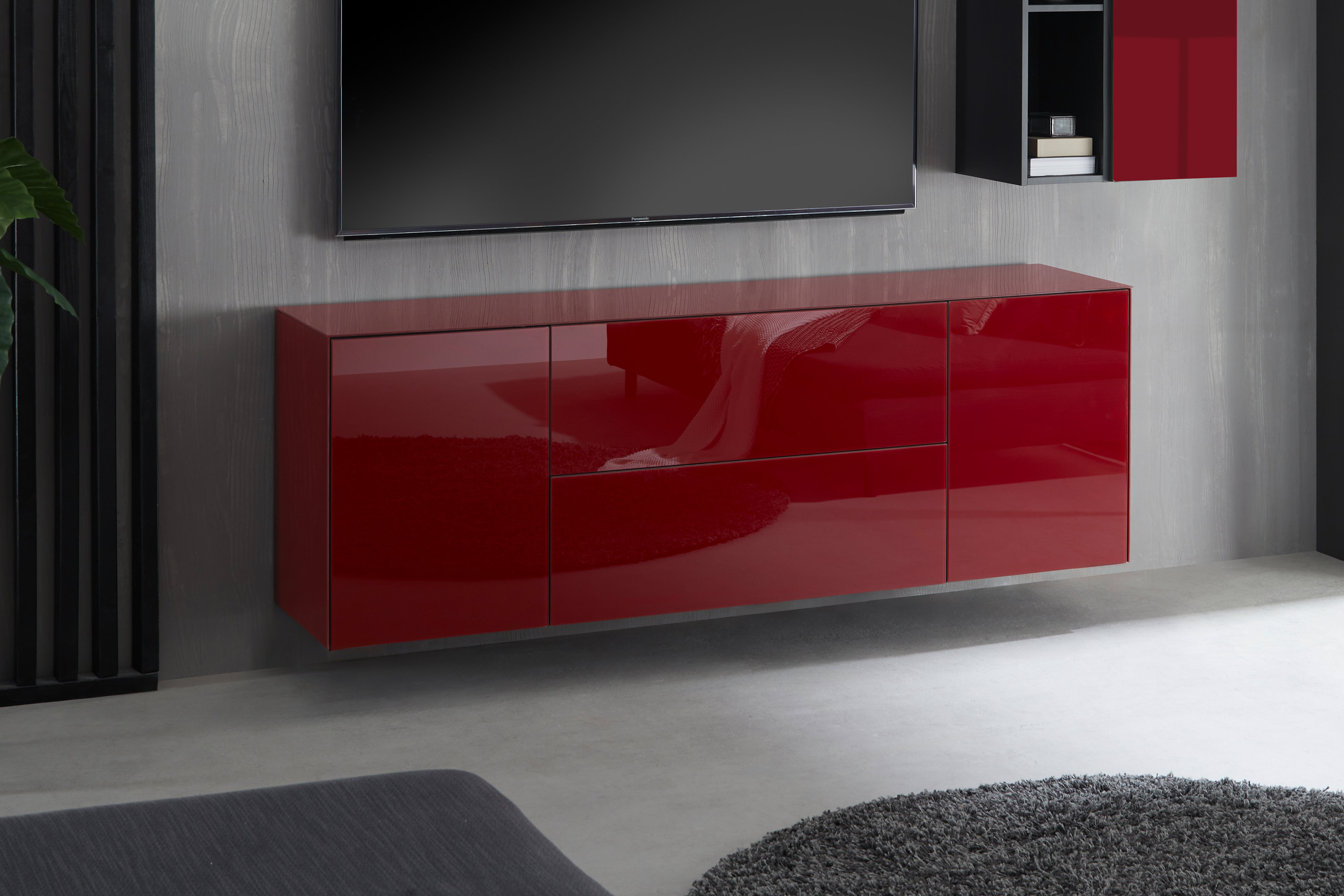 Individuell gestaltbar: Das Lowboard aus der Modellreihe Colors von Mäusbacher vereint markantes Design mit funktionaler Präzision und hochwertiger Verarbeitung. Die glänzenden Glasflächen in edlem Bordeauxrot verleihen dem Möbel eine ausdrucksstarke, luxuriöse Präsenz und setzen stilvolle Akzente in modernen Wohnräumen. Das grifflose Design mit komfortabler Push-to-open-Funktion unterstreicht die klare, puristische Linienführung. Für maximale Flexibilität ist das Lowboard ebenfalls für eine hängende Montage ausgelegt – die benötigten Hängebeschläge sind bereits im Lieferumfang enthalten. Bodengleiter gehören ebenfalls zur Standardausstattung, sodass das Möbel individuell montiert werden kann. Auch für Stauraum ist gesorgt. Das Lowboard ist jeweils mit zwei Türen, zwei festen Böden, einer Klappe sowie einem Schubkasten ausgestattet. Die Klappe verfügt über eine integrierte Dämpfung für sanftes, geräuscharmes Schließen. Der Schubkasten läuft auf hochwertigen Unterflurauszügen und gewährleistet hohen Bedienkomfort sowie Langlebigkeit. Des Weiteren stehen Ihnen je nach Raumanforderung und persönlichem Geschmack drei durchdachte Aufteilungsvarianten zur Auswahl: wählen Sie das Möbel mit beiden Türen auf der linken Seite, auf der rechten Seite oder mit je eine Tür auf beiden Seiten. Als Bestandteil der vielseitigen Modellreihe Colors ist das Lowboard von Mäusbacher mit weiteren Einzelmöbeln kombinierbar und in zusätzlichen Ausführungen erhältlich – für ein harmonisch abgestimmtes Wohnkonzept mit Stil und Charakter.