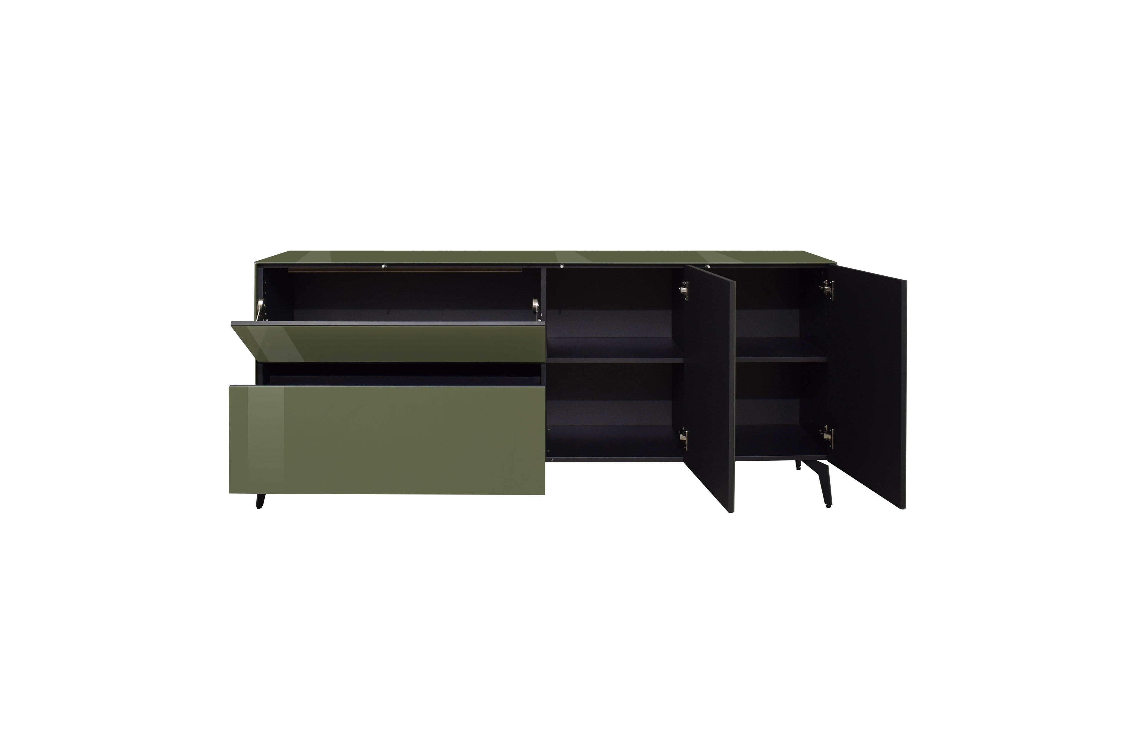 Individuell gestaltbar: Das Lowboard aus der Modellreihe Colors von Mäusbacher vereint markantes Design mit funktionaler Präzision und hochwertiger Verarbeitung. Die glänzenden Glasflächen in edlem Olivgrün verleihen dem Möbel eine ausdrucksstarke, luxuriöse Präsenz und setzen stilvolle Akzente in modernen Wohnräumen. Das grifflose Design mit komfortabler Push-to-open-Funktion unterstreicht die klare, puristische Linienführung. Für maximale Flexibilität ist das Lowboard ebenfalls für eine hängende Montage ausgelegt – die benötigten Hängebeschläge sind bereits im Lieferumfang enthalten. Bodengleiter gehören ebenfalls zur Standardausstattung, sodass das Möbel individuell montiert werden kann. Auch für Stauraum ist gesorgt. Das Lowboard ist jeweils mit zwei Türen, zwei festen Böden, einer Klappe sowie einem Schubkasten ausgestattet. Die Klappe verfügt über eine integrierte Dämpfung für sanftes, geräuscharmes Schließen. Der Schubkasten läuft auf hochwertigen Unterflurauszügen und gewährleistet hohen Bedienkomfort sowie Langlebigkeit. Des Weiteren stehen Ihnen je nach Raumanforderung und persönlichem Geschmack drei durchdachte Aufteilungsvarianten zur Auswahl: wählen Sie das Möbel mit beiden Türen auf der linken Seite, auf der rechten Seite oder mit je eine Tür auf beiden Seiten. Als Bestandteil der vielseitigen Modellreihe Colors ist das Lowboard von Mäusbacher mit weiteren Einzelmöbeln kombinierbar und in zusätzlichen Ausführungen erhältlich – für ein harmonisch abgestimmtes Wohnkonzept mit Stil und Charakter.