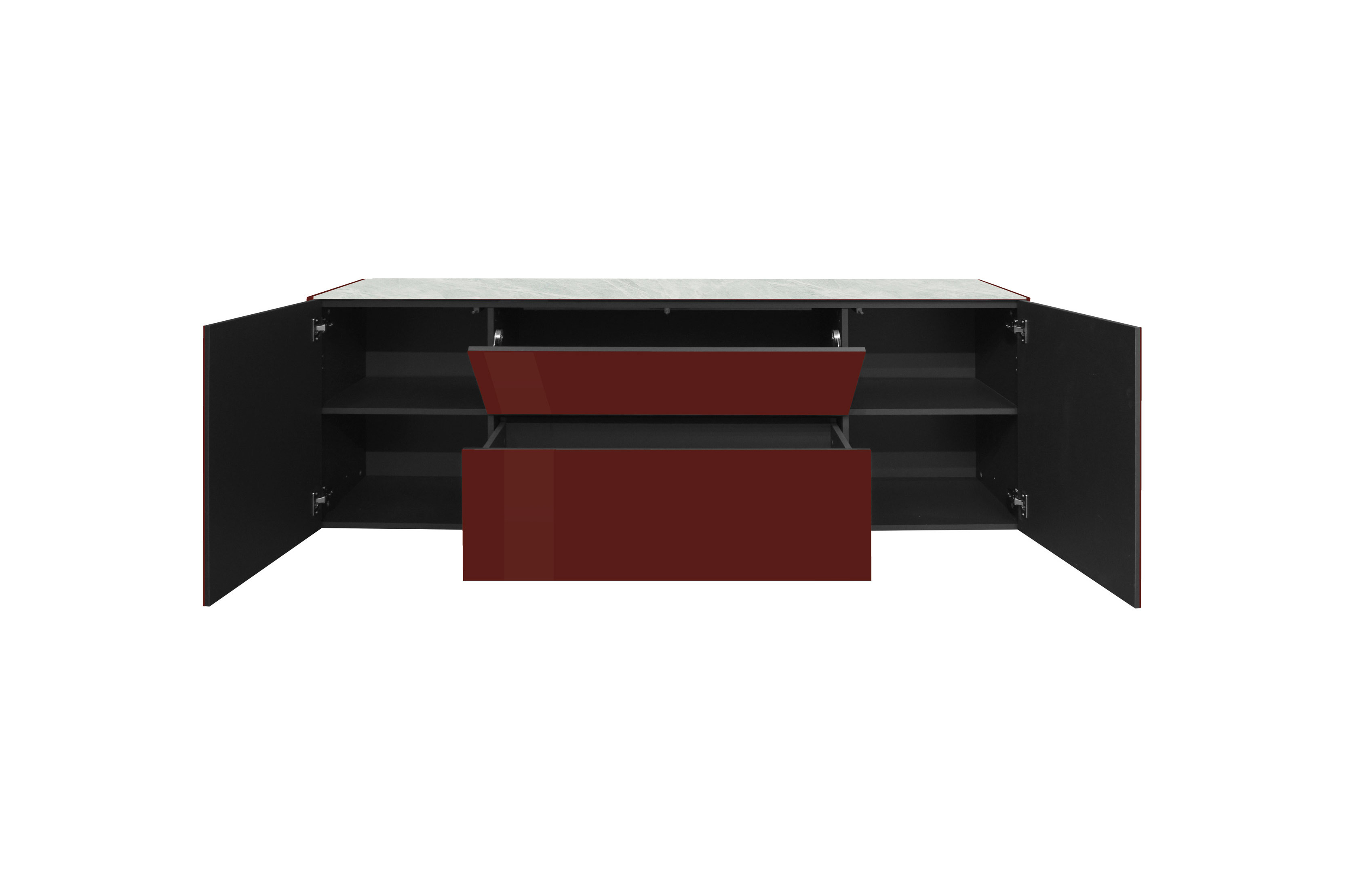 Das Lowboard der Modellreihe Colors von Mäusbacher – für ein stimmiges Wohnkonzept, das Designanspruch, Funktionalität und elegante Individualität vereint. Die glänzenden Glasfronten sowie die Seiten in edlem Bordeauxrot setzen einen markanten Akzent und verleihen dem Möbelstück eine außergewöhnlich elegante Präsenz. Ein raffiniertes Detail ist die innenliegende, wendbare Oberplatte: Je nach Vorliebe lässt sie sich in schwarzer oder weißer Keramikoptik einsetzen und ermöglicht so eine harmonische Anpassung an unterschiedliche Wohn- und Farbkonzepte. Die grifflose Gestaltung mit komfortabler Push-to-open-Funktion betont die klare Linienführung und unterstreicht den modernen Charakter des Solisten. Neben verschiedenen Fußvarianten besteht zudem die Möglichkeit, das TV-Möbel als Hängelowboard zu montieren. Die hierfür erforderlichen Hängebeschläge für die wandhängende Installation sind bereits im Lieferumfang enthalten. Für maximale Gestaltungsfreiheit stehen drei Montagevarianten zur Auswahl: mit beiden Türen links, beiden Türen rechts oder jeweils einer Tür auf jeder Seite. Unabhängig von der gewählten Konfiguration verfügt das Lowboard stets über zwei Türen, zwei festen Böden, eine Klappe sowie einen Schubkasten. Die Klappe ist mit einer integrierten Dämpfung ausgestattet und schließt angenehm leise, während der Schubkasten auf hochwertigen Unterflurauszügen läuft und ein besonders komfortables Handling gewährleistet. Als Bestandteil der vielseitigen Modellreihe Colors lässt sich das Lowboard ideal mit weiteren Einzelmöbeln von Mäusbacher kombinieren.