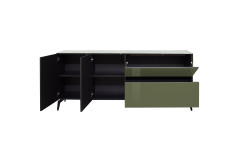 Das Lowboard aus der Modellreihe Colors von Mäusbacher verbindet modernes Design mit fein abgestimmter Materialästhetik und erstklassiger Verarbeitung. Die glänzenden Glasfronten und Seitenteile in elegantem Olivgrün verleihen dem Möbel ein außergewöhnliches Erscheinungsbild. Ein besonderes Highlight bildet die innenliegende Oberplatte zum Wenden. Je nach Wunsch kann sie in schwarzer oder weißer Keramikoptik eingesetzt werden und ermöglicht so eine individuelle Anpassung an unterschiedliche Farb- und Einrichtungskonzepte. Das grifflose Design mit komfortabler Push-to-open-Funktion unterstreicht die klare und puristische Linienführung. Neben einer Auswahl an verschiedenen Fußausführungen haben Sie auch alternativ die Möglichkeit, das TV-Möbel kurzerhand zu einem Hängelowboard umzufunktionieren. Passende Hängebeschläge für eine wandhängende Montage werden serienmäßig mitgeliefert. Weiterhin stehen Ihnen drei unterschiedliche Montagevarianten zur Auswahl: Wählen Sie das Element mit beiden Türen auf der linken Seite, mit beiden Türen auf der rechten Seite oder mit jeweils eine Türen an beiden Seiten. Unabhängig von der gewählten Variante verfügt der Solist über zwei Türen, zwei festen Böden, eine Klappe und einen Schubkasten. Die Klappe ist mit einer integrierten Dämpfung ausgestattet und schließt angenehm leise, während der Schubkasten auf hochwertigen Unterflurauszügen läuft und höchsten Bedienkomfort bietet. Als Teil der vielseitigen Modellreihe Colors ist das Lowboard mit weiteren Einzelmöbeln von Mäusbacher kombinierbar und in zusätzlichen Ausführungen erhältlich – für ein stimmiges Wohnkonzept mit Charakter, Eleganz und funktionaler Raffinesse.