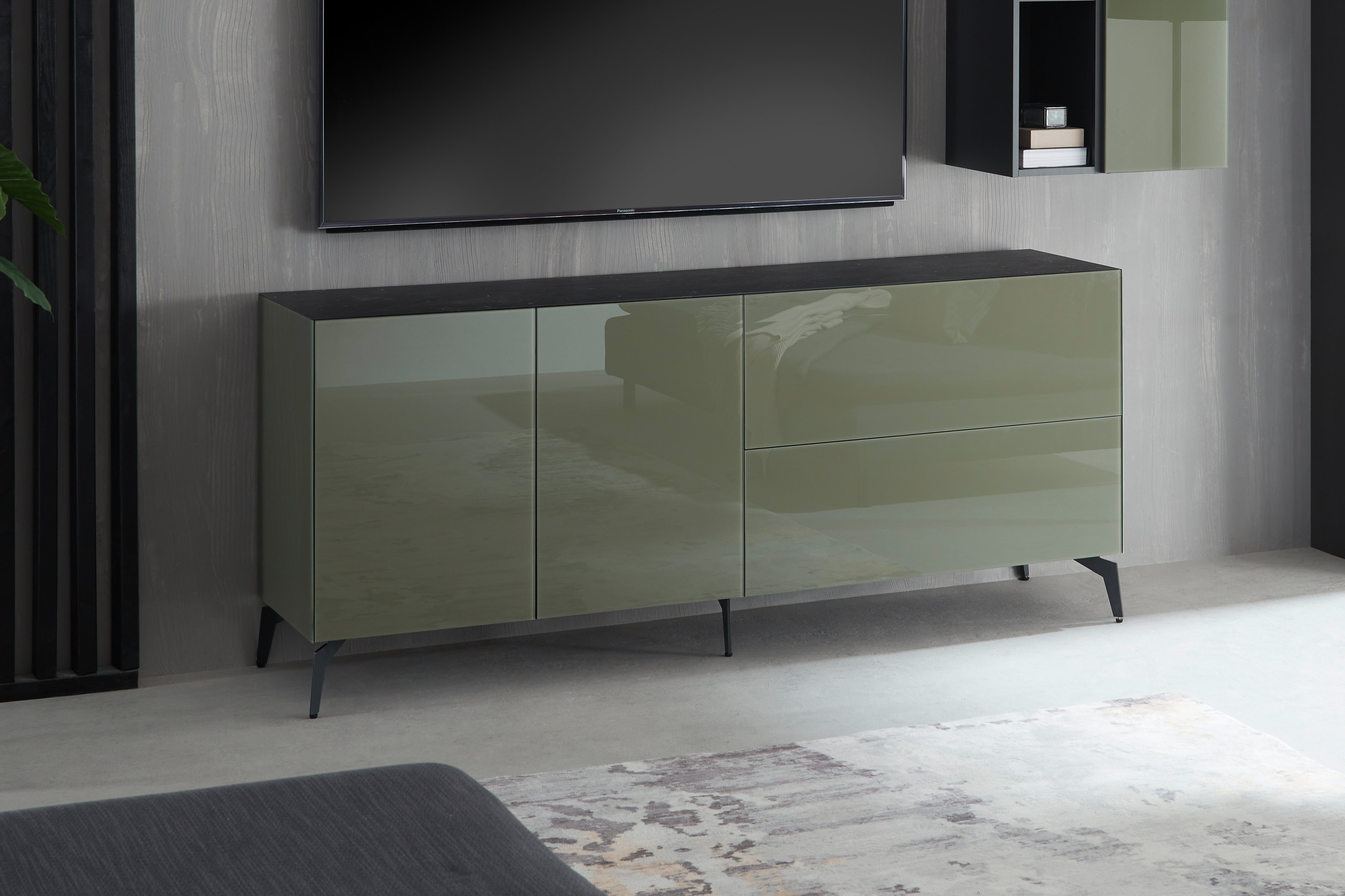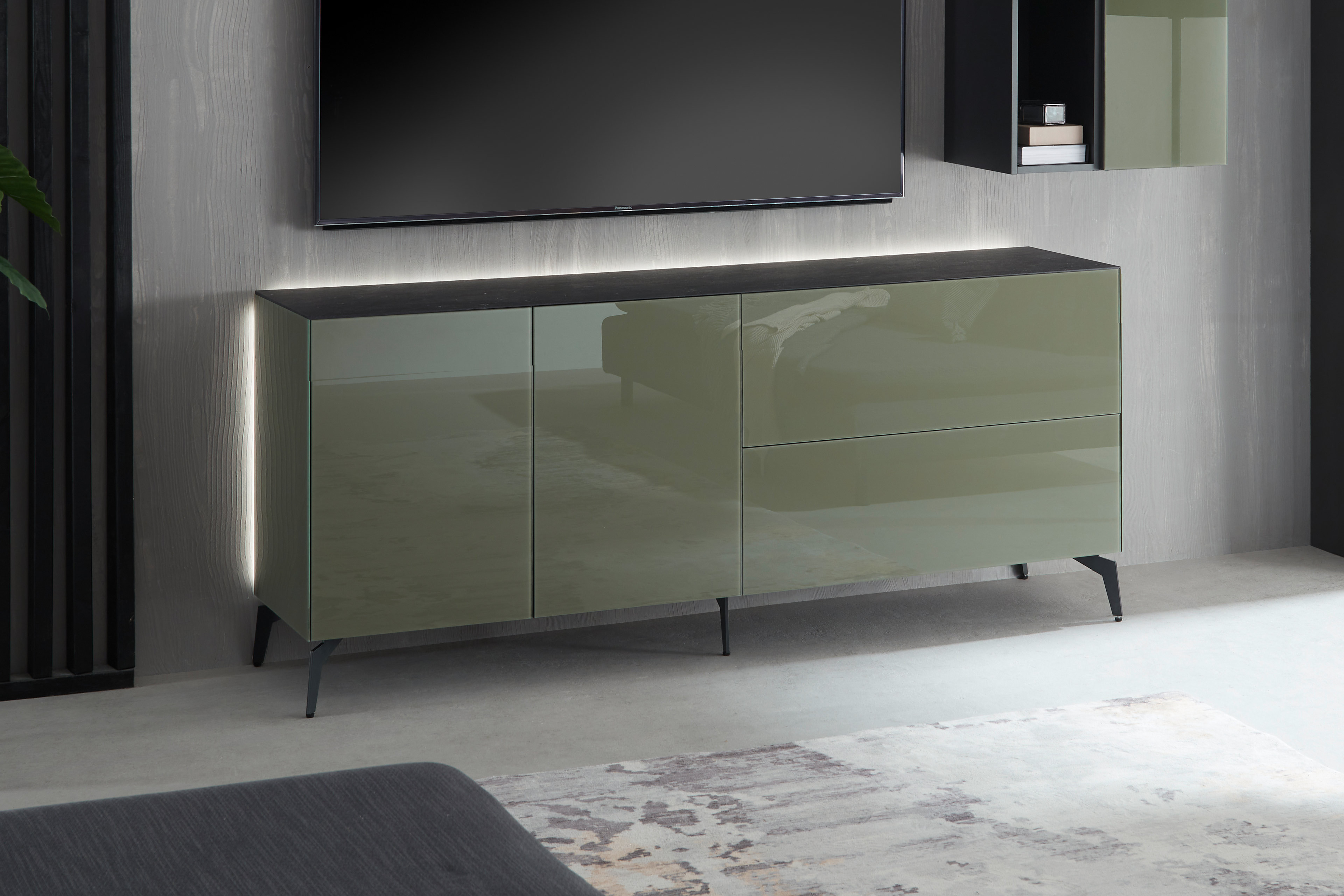 Lowboard von Mäusbacher - Modell Colors 211 Glas olivgrün mit Wendekeramikplatte und Metallfüßen Colors - Möbel für jeden Wohnbereich