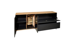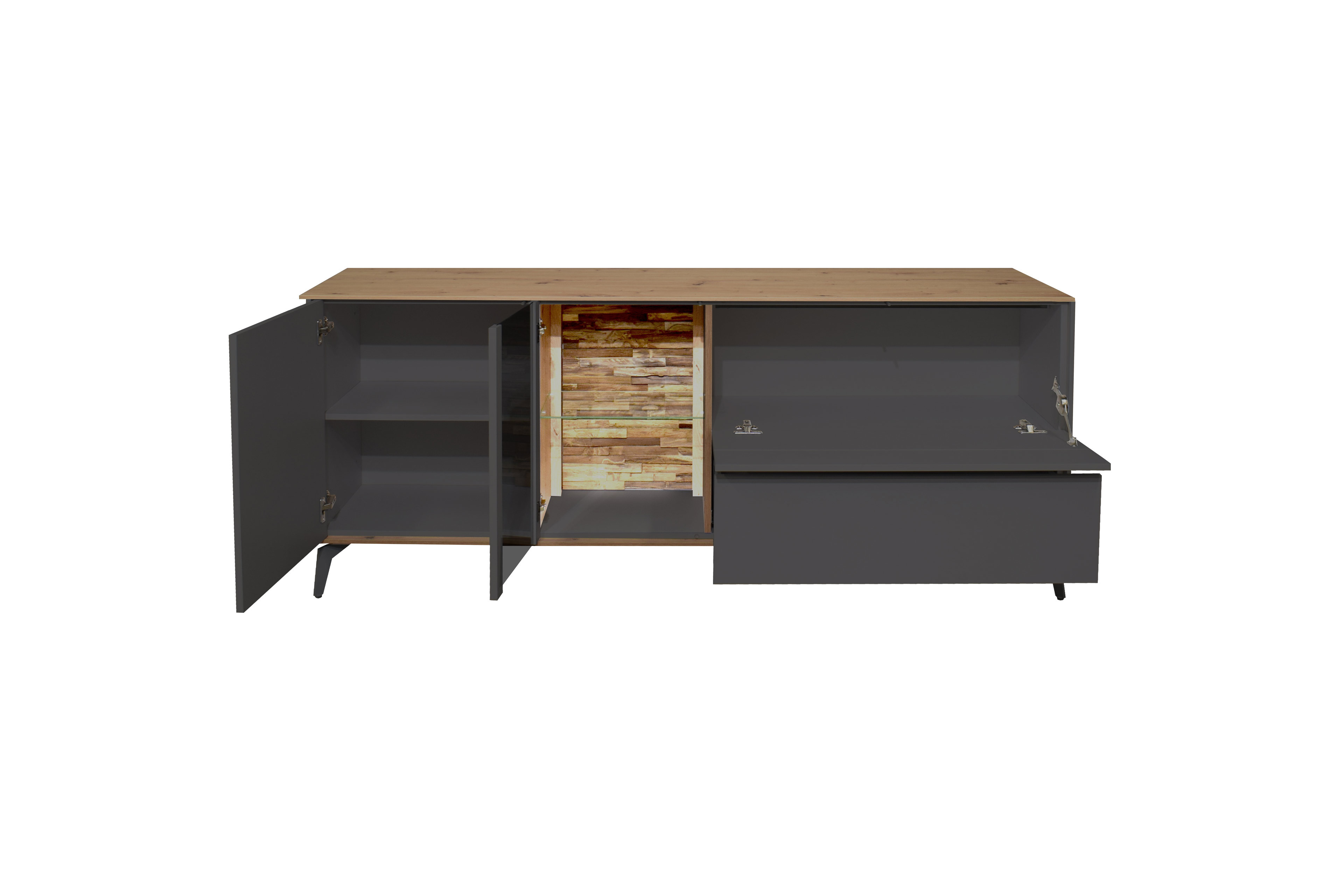- Lowboard mit 1 Holztür, 1 Glas-/ Holztür, 1 Klappe, 1 Holzboden, 1 Glasboden und 1 Schubkasten