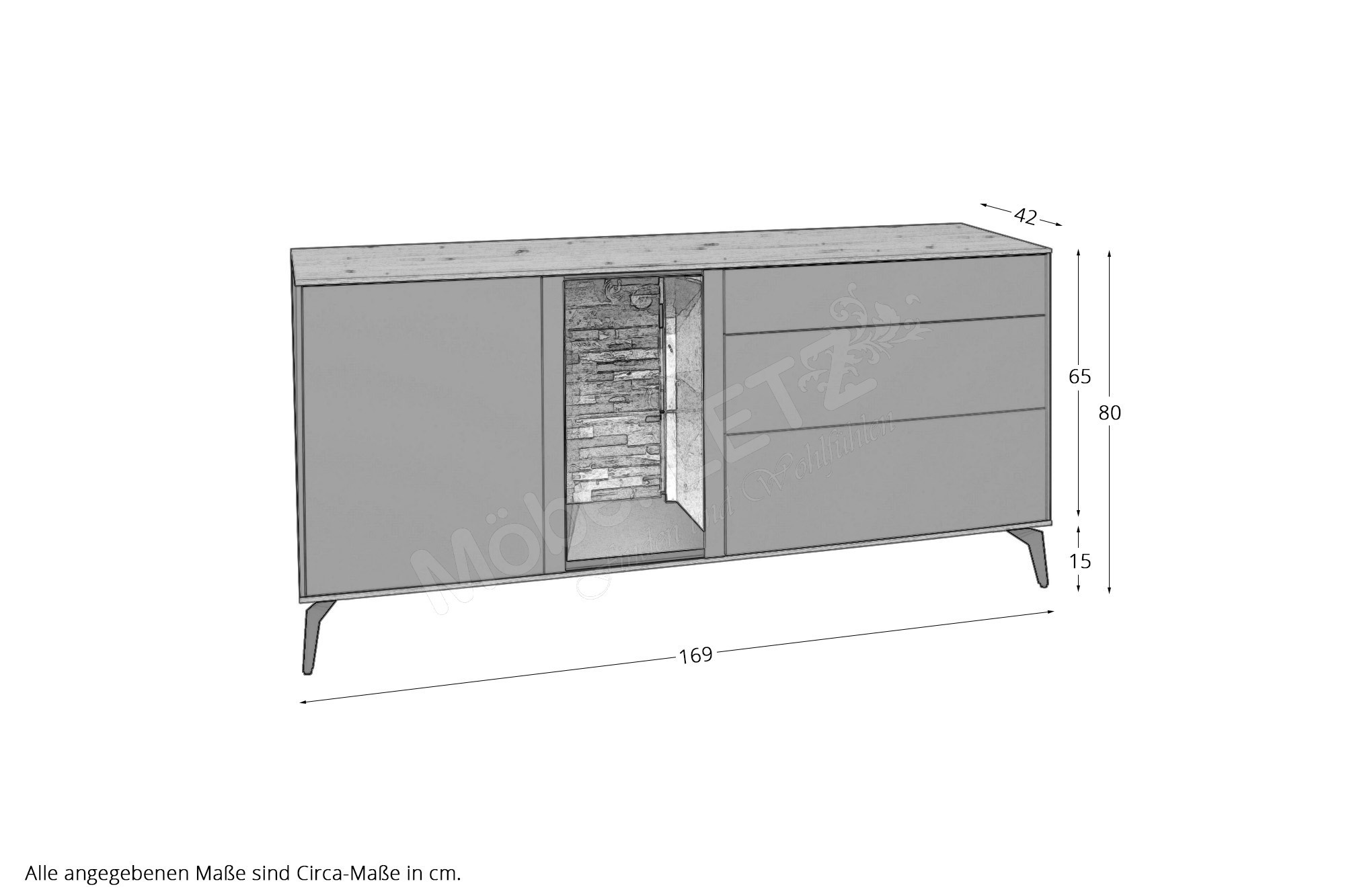 Gesamtmaße des Lowboards: BHT ca. 207/80/42 cm (Art-Nr. L1016)