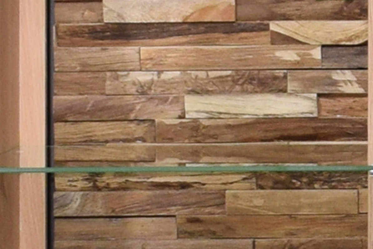 - sichtbare Akzentückwand hinter der Glastür: Teakholz, massiv