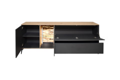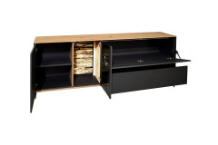 - Lowboard mit 1 Holztür, 1 Glas-/ Holztür, 1 Klappe, 1 Holzboden, 1 Glasboden und 1 Schubkasten