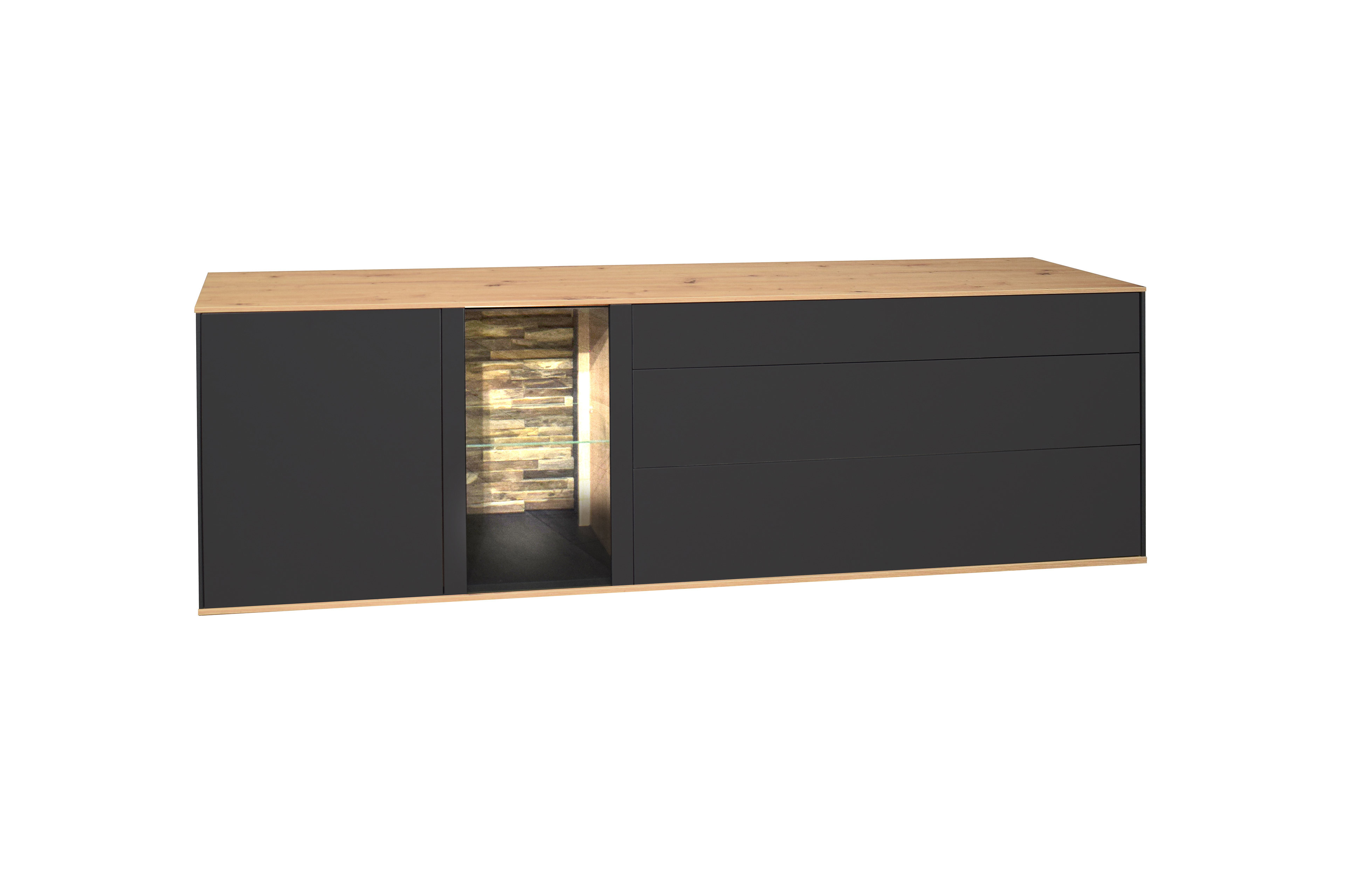 Als Teil einer stilvollen Möbelserie für ein harmonisches Wohnkonzept mit Charakter und Anspruch präsentieren wir Ihnen das Lowboard von Mäusbacher aus der Modellreihe Como. Das Möbel ist die Essenz moderner Eleganz – puristisch im Design, luxuriös in der Ausführung und kompromisslos hochwertig verarbeitet. Der Korpus, die Fronten sowie der Holzboden in edlem Anthrazit matt, einem Farbton, der Ruhe, Tiefe und zeitlose Souveränität ausstrahlt. Die samtige Lackoberfläche wirkt zurückhaltend und dennoch kraftvoll. Die kratzfeste Melaminbeschichtung und sauber gearbeiteten ABS-Kanten garantieren höchste Alltagstauglichkeit. Als stilvoller Kontrast ergänzt der Oberboden in Artisan Asteiche das Design mit natürlicher Wärme und feiner Holzoptik – modern interpretiert und harmonisch eingebunden. Ein besonderer Akzent offenbart sich hinter der Glas- / Holztür aus ESG-Sicherheitsglas: Die sichtbare Rückwand aus massivem Teakholz verleiht dem Solisten eine exklusive Note und schafft eine luxuriöse Bühne für dekorative Lieblingsstücke. In Kombination mit der integrierten Beleuchtung werden Ihre Lieblingsstücke stimmungsvoll in Szene gesetzt. Auch funktional überzeugt das TV-Möbel aus der Modellreihe Como bis ins Detail. Die grifflose Front unterstreicht die klare Linienführung und ermöglicht eine intuitive Bedienung. Höhenverstellbare Möbelgleiter sowie der passende Hängebeschlag sind ebenfalls standardmäßig inklusive und sorgen für maximale Flexibilität bei der Montage.