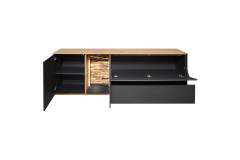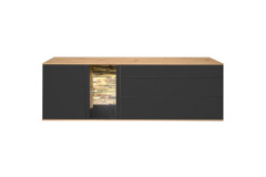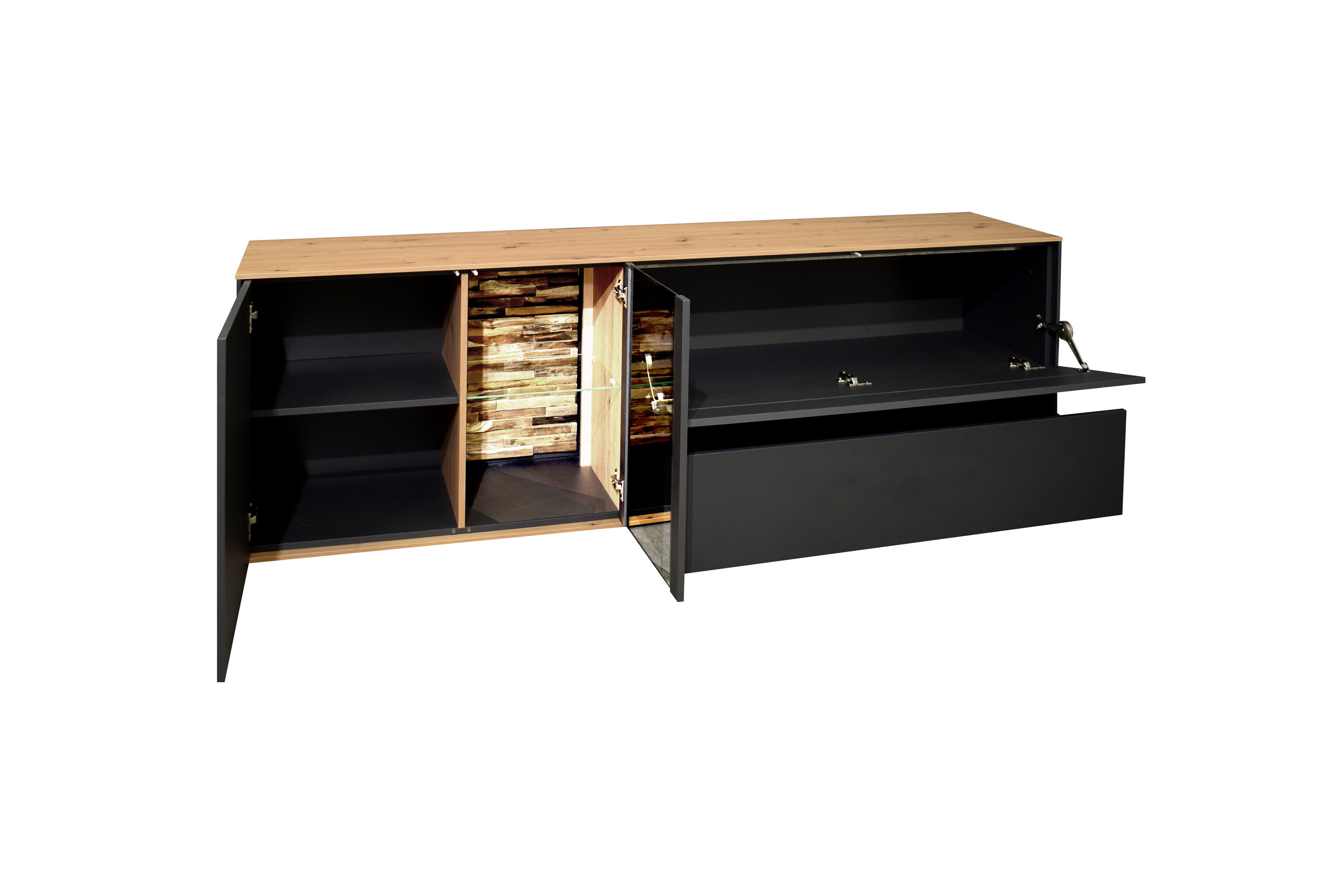 - Lowboard mit 1 Holztür, 1 Glas-/ Holztür, 1 Klappe, 1 Holzboden, 1 Glasboden und 1 Schubkasten