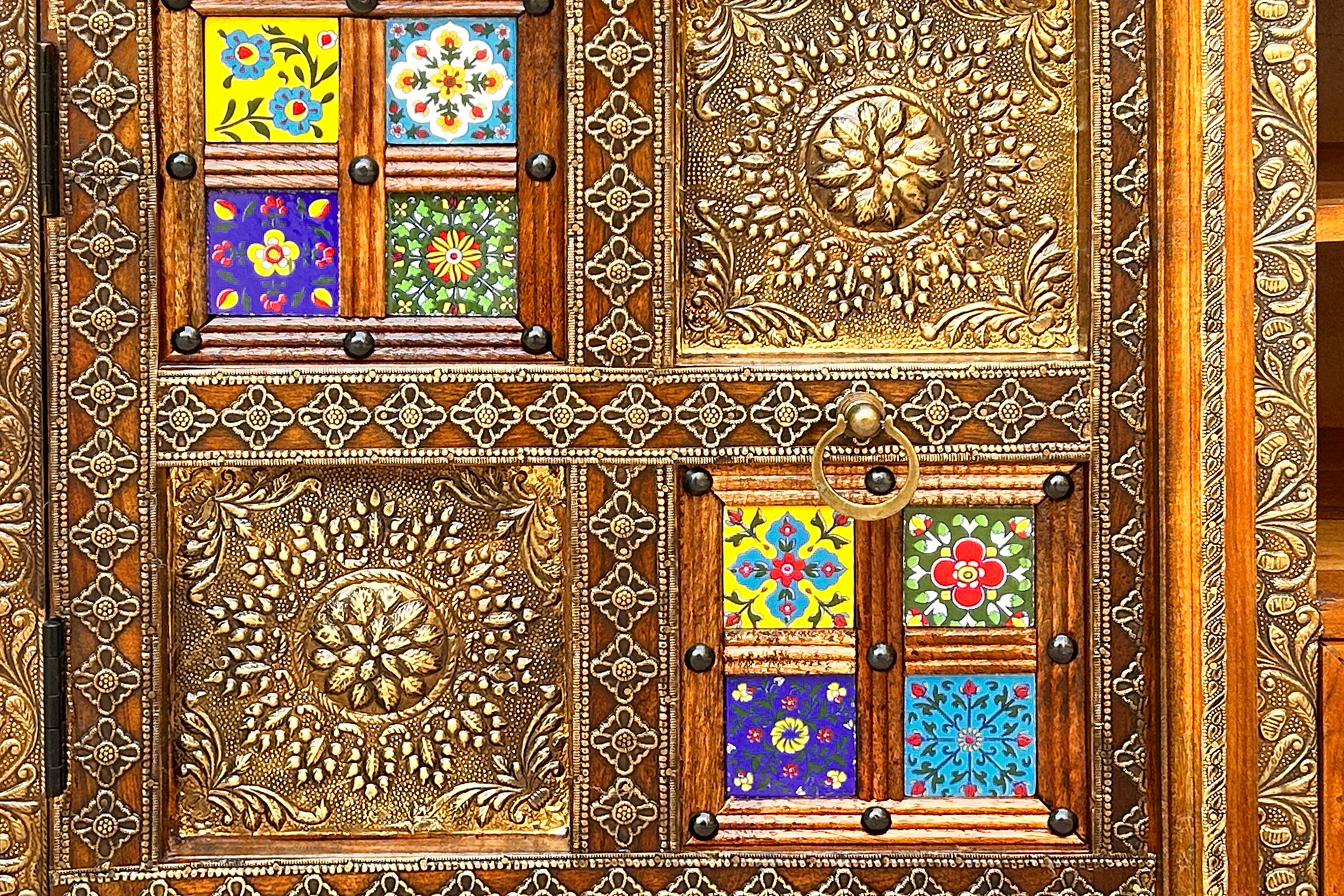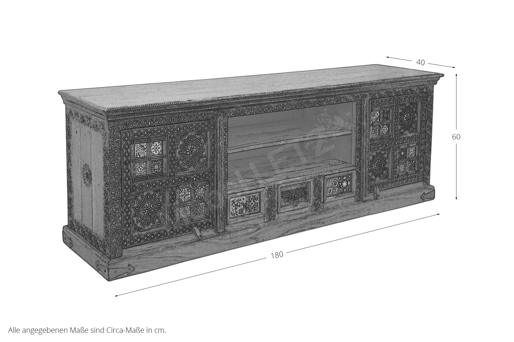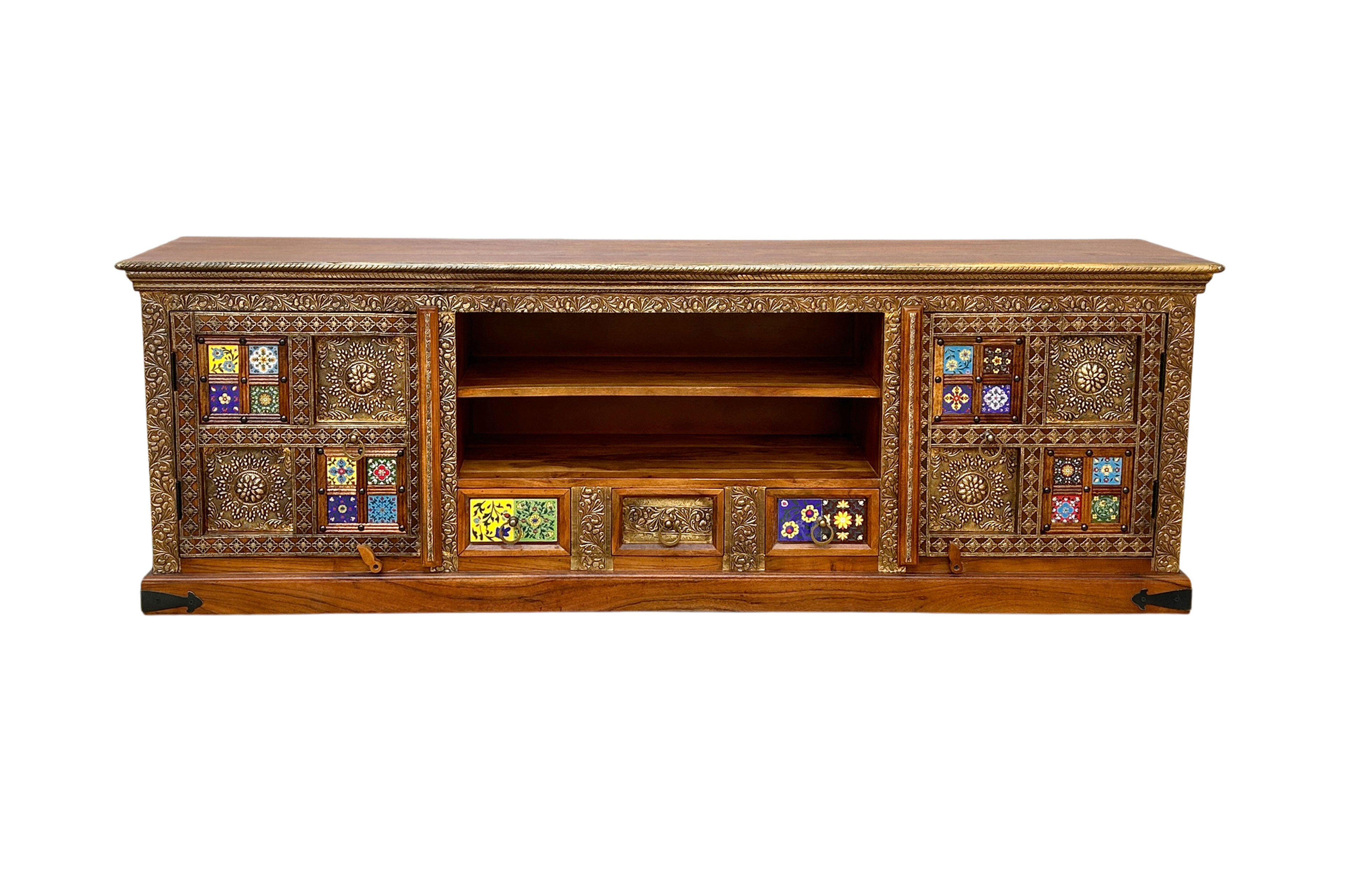 Das Lowboard Chitra von SIT Möbel begeistert als ausdrucksstarkes Designmöbel, das Natürlichkeit und Kreativität auf einzigartige Weise verbindet. Gefertigt aus massivem Akazienholz bringt es mit seiner markanten Maserung und den warmen Farbtönen eine behagliche Atmosphäre in Ihr Zuhause. Die kunstvoll von Hand gefertigten farbenprächtigen Fliesen auf den Fronten setzen lebendige Akzente und verleihen jedem Exemplar eine individuelle Note mit unverwechselbarem Charakter. Zwei Türen verbergen jeweils einen großzügigen Innenraum mit durchgehendem Boden, sodass ausreichend Platz für unterschiedlichste Wohnaccessoires entsteht. Ergänzend sorgen drei kompakte Schubkästen für strukturierte Ordnung, während zwei offene Fächer ideal dafür geeignet sind, Mediengeräte, Bücher oder dekorative Lieblingsstücke stilvoll in Szene zu setzen. Fein abgestimmte Details in Messingoptik unterstreichen die hochwertige Anmutung und harmonieren perfekt mit den dekorativen Ringgriffen, die dem Möbel eine besondere Raffinesse verleihen. Ob als stilvolle TV-Basis oder als markanter Blickfang im Wohnbereich - dieses Lowboard verbindet Funktionalität mit außergewöhnlichem Design und schafft ein Ambiente voller Persönlichkeit.