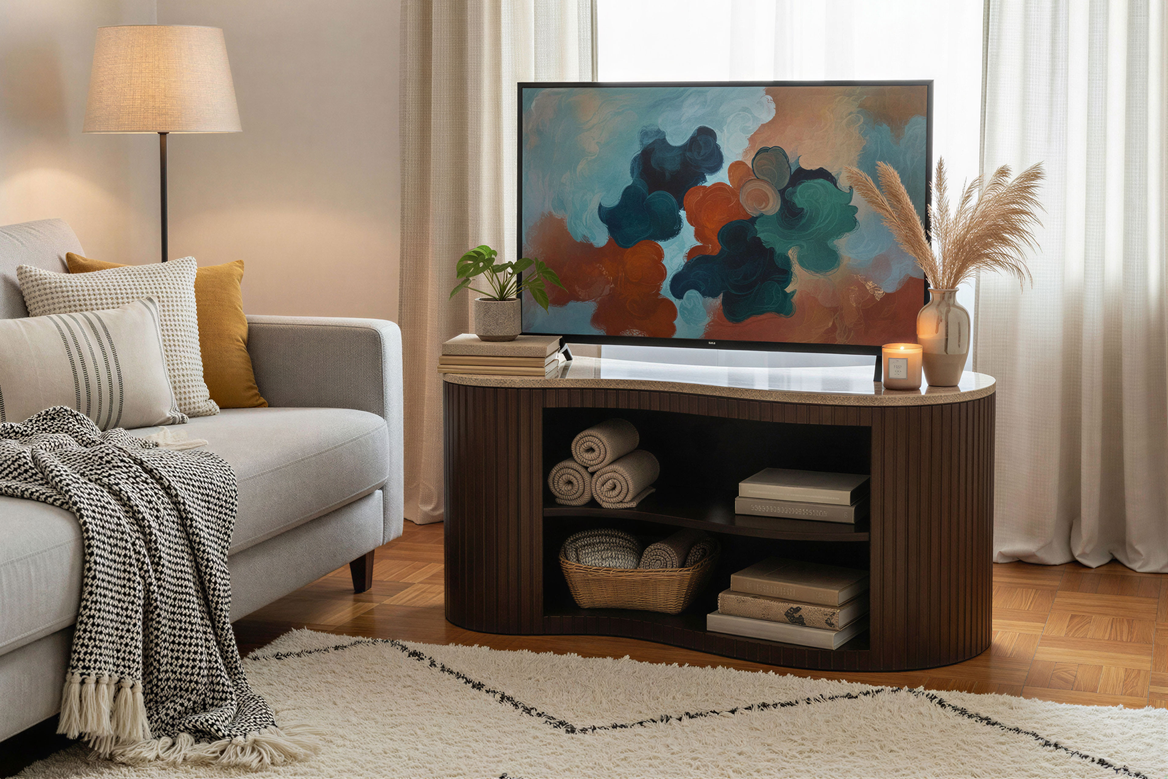 Das Rondura Lowboard von SIT Möbel verbindet natürliche Eleganz mit moderner Funktionalität und wird so zum Herzstück Ihres Wohnzimmers. Hergestellt aus massivem Mangoholz besticht es durch seine warme, braune Farbgebung und die lebendige Holzmaserung – jedes Möbelstück ist ein Unikat mit individueller Ausstrahlung. Die Front in stilvoller Lamellenoptik sorgt für einen zeitgemäßen Look und verleiht dem Board eine markante, aber dennoch harmonische Struktur. Das geschwungene Design mit sanft fließenden Linien verleiht dem Solisten eine organische Form, die sich sowohl in moderne als auch in klassische Einrichtungskonzepte einfügt. Hinter der klaren Aufteilung verbergen sich zwei offene Fächer, die ideal Platz für Multimedia-Geräte, Bücher oder dekorative Accessoires bieten. Die offene Gestaltung ermöglicht einfachen Zugriff und sorgt für eine aufgeräumte, luftige Optik. Dank seiner vielseitigen Bauweise lässt sich das Rondura Lowboard nicht nur als TV-Board, sondern auch als Couchtisch nutzen. Die niedrige Höhe und stabile Konstruktion bieten flexible Einsatzmöglichkeiten in verschiedenen Wohnbereichen. Mit diesem Möbelstück holen Sie sich ein Stück Natur ins Zuhause, das durch hochwertige Verarbeitung, langlebiges Material und intelligentes Design überzeugt.