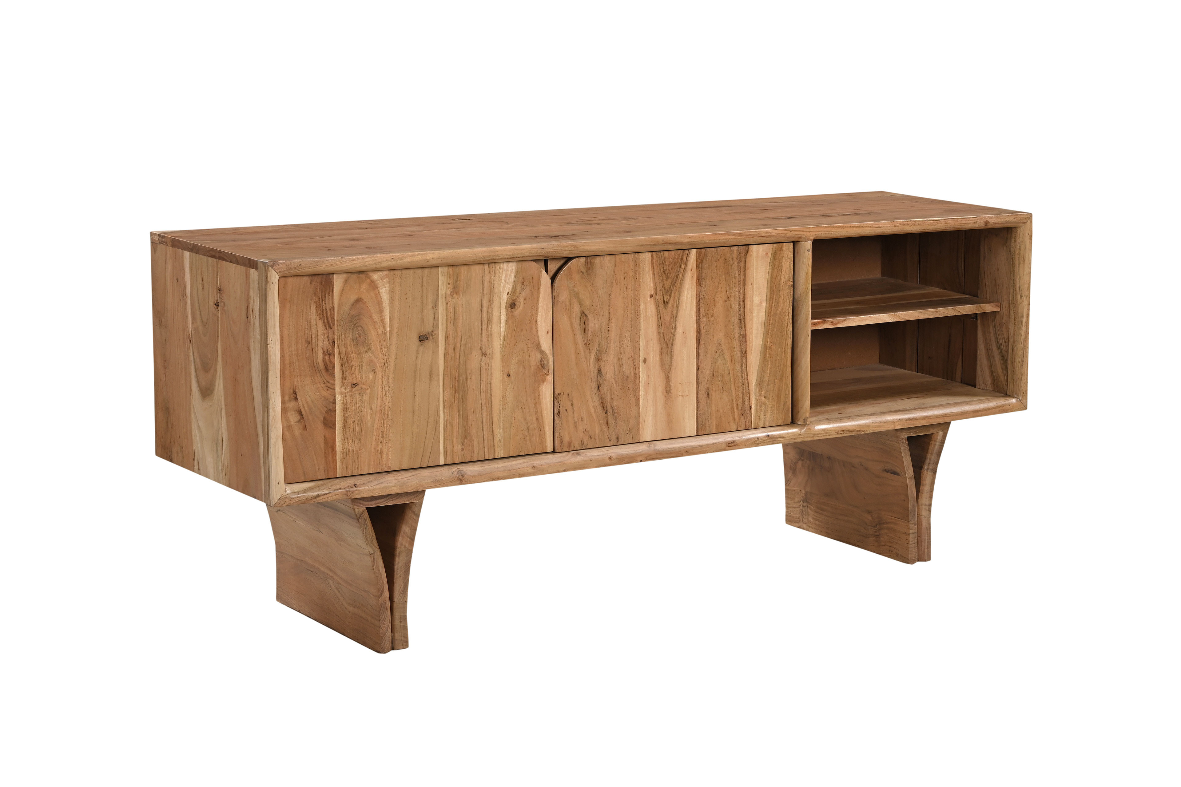 Bringen Sie einen Hauch von Eleganz und Natur in Ihr Zuhause mit unserem exquisiten Lowboard aus dem Programm Wave-living, das auch aus hochwertigem massivem Akazienholz gefertigt wurde. Die kunstvolle Maserung des Holzes macht jedes Stück einzigartig und verleiht Ihrem Raum einen warmen, einladenden Charakter. Die natürliche Optik harmoniert hervorragend mit verschiedenen Einrichtungsstilen und sorgt dafür, dass Ihr Wohn- oder Essbereich stilvoll und zeitlos wirkt. Das SIT Möbel TV-Unterteil ist mit einem großzügigen Stauraumangebot ausgestattet und bietet zwei offene Fächer für die Präsentation Ihrer Lieblingsfilme oder CDs, während das große Fach hinter den eleganten Türen ideal für die Aufbewahrung von Alltagsgegenständen ist. Das extravagante Holzwagengestell verleiht dem Möbelstück nicht nur Stabilität, sondern unterstreicht auch das raffinierte Design. Ob als stilvolles TV-Möbel oder als praktische Ablage im Essbereich, dieses SIT Möbel Lowboard ist ein wahrer Hingucker. Lassen Sie sich von seiner Natürlichkeit verzaubern und verwandeln Sie Ihr Zuhause mit diesem außergewöhnlichen Schmuckstück.