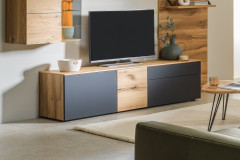 Das Lowboard von Schösswender aus der Modellreihe Como verkörpert die Kunst, Natürlichkeit und modernes Design in vollendeter Harmonie zu vereinen. Seine klare Linienführung und die Kombination aus Wildeichenfurnier und einer Oberfläche in Kupfereiche, die gebürstet, matt und in einem edlen Bronzeton geölt ist, verleihen dem Möbelstück eine warme, stilvolle Ausstrahlung. Jedes Detail, von der feinen Furnierrichtung bis hin zur dezenten Sockelausführung, zeugt von handwerklicher Präzision und dem hohen Qualitätsanspruch, für den Schösswender steht. Hinter der eleganten, grifflosen Front verbergen sich zwei Holztüren, zwei Schubkästen und zwei Holzböden, die großzügigen Stauraum für Wohnaccessoires, Technik oder Alltägliches bieten. Die massiven Buchenschubkästen unterstreichen die langlebige Qualität des Designs. Die dezenten Kunststoffakzente in mattem Schwarz verleihen dem TV-Unterteil einen modernen Kontrast, der die natürliche Maserung des Holzes noch stärker betont. Ob als Solitär oder in Kombination mit weiteren Elementen der Modellreihe Como – dieses Lowboard wird zum Mittelpunkt in Ihrem Wohnzimmer.
