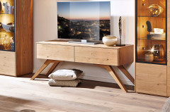 Ein Lowboard kann im Raum eine verbindende Rolle übernehmen – es schafft Ordnung, ohne dominant zu wirken, und bietet zugleich eine ruhige Fläche für Technik oder persönliche Gegenstände. Das TV-Unterteil von Schösswender aus der Kollektion Selecto fügt sich genau in diese Funktion ein und überzeugt durch seine klare Gestaltung und natürliche Ausstrahlung. Gefertigt mit edlem Wildeichenfurnier bringt das Möbel eine angenehme Wärme in den Wohnbereich. Die Oberfläche mit Samtlack verleiht dem Holz eine ruhige und zugleich gleichmäßige Optik. Dezente Rundungen an den Kanten sorgen für ein harmonisches Gesamtbild und unterstreichen die sorgfältige Verarbeitung. Mit seinen zwei Schubkästen bietet das TV-Möbel auch praktischen Stauraum für kleinere Alltagsgegenstände, die übersichtlich und griffbereit untergebracht werden sollen. Die grifflos integrierte TipOn-Technik unterstützt die klare Linienführung und ermöglicht eine komfortable Bedienung. Ein prägendes Detail sind die markanten Holzfüße in schräger, eckiger Ausführung, die dem Möbel eine schwebene Wirkung verleihen und gleichzeitig für eine stabile Basis sorgen. Dadurch wirkt der Solist weniger kompakt und fügt sich frei in den Raum ein. Durch seine individuelle Anpassbarkeit und Kombinierbarkeit lässt sich das Lowboard flexibel in unterschiedliche Wohnkonzepte integrieren – ob als TV-Möbel oder als dezentes Stauraumelement. In Verbindung mit weiteren Möbeln der Serie Selecto entsteht ein stimmiges Gesamtbild mit natürlichem Charakter und klarer Struktur.