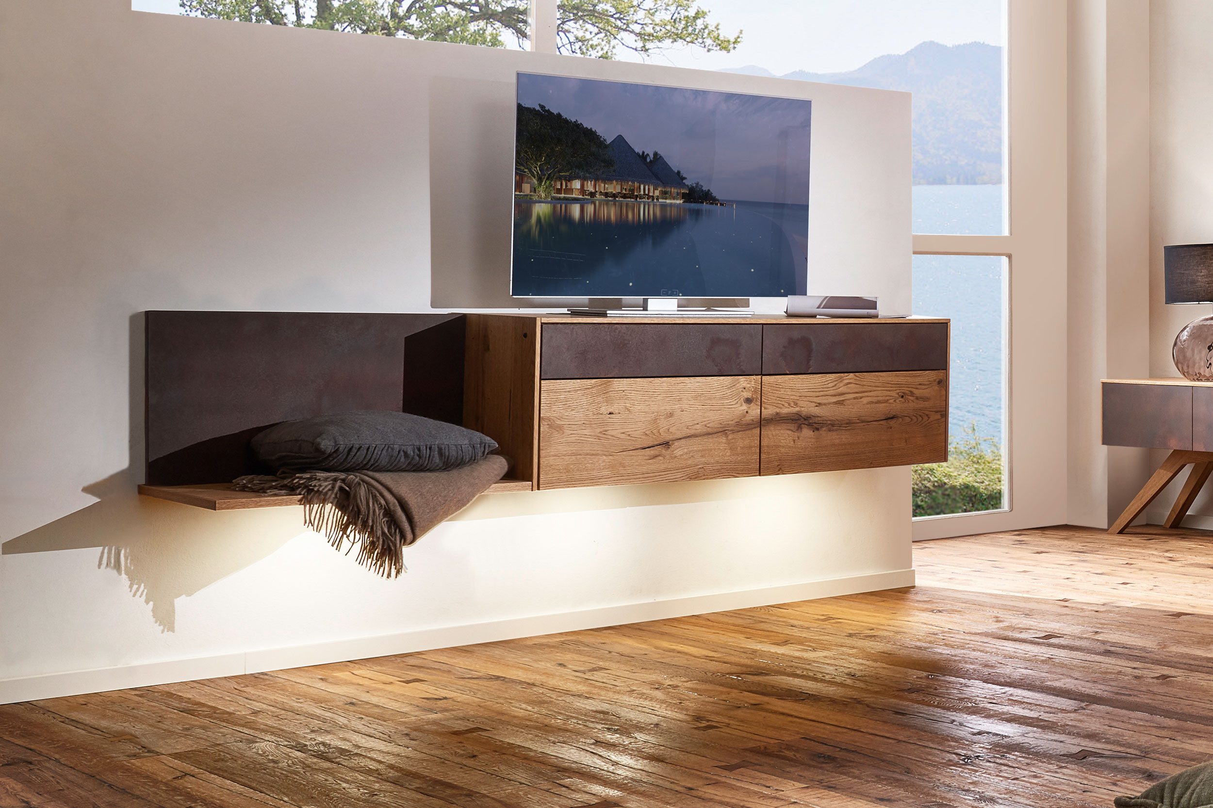 Ein Lowboard kann dem Raum eine klare Linie geben und gleichzeitig für eine aufgeräumte und entspannte Atmosphäre sorgen. Das TV-Unterteil von Schösswender aus der Kollektion Selecto verbindet genau diese Eigenschaften. Mit einer markanten Materialkombination und wird so zu einem funktionalen Mittelpunkt in Ihrem Wohnbereich. Die Gestaltung lebt vom Zusammenspiel natürlicher und ausdrucksstarker Elemente. Wildeiche, innen und außen edel furniert, bringt eine warme, authentische Ausstrahlung mit sich, die durch die barrique geölte Oberfläche zusätzlich betont wird. Die Holzstruktur wirkt lebendig, ohne unruhig zu erscheinen, und verleiht dem Möbel eine angenehme Tiefe. Einen bewussten Kontrast dazu setzen die Frontabsetzungen aus Metall in Rostoptik, die dem Solisten einen leicht industriellen Charakter geben. Im Alltag überzeugt das Möbelstück durch seine durchdachte Aufteilung. Vier Schubkästen bieten großzügigen Stauraum für verschiedenste Gegenstände – von Technikzubehör bis hin zu persönlichen Dingen. Ergänzt wird dies durch das offene Fach auf der linken Seite, das sich ideal für Mediengeräte oder dekorative Elemente eignet. Durch seinen ausgewogenen Mix aus Natürlichkeit und markanten Akzenten lässt sich das Lowboard vielseitig einsetzen und mit weiteren Möbeln der Serie Selecto zu einem stimmigen Wohnkonzept kombinieren.