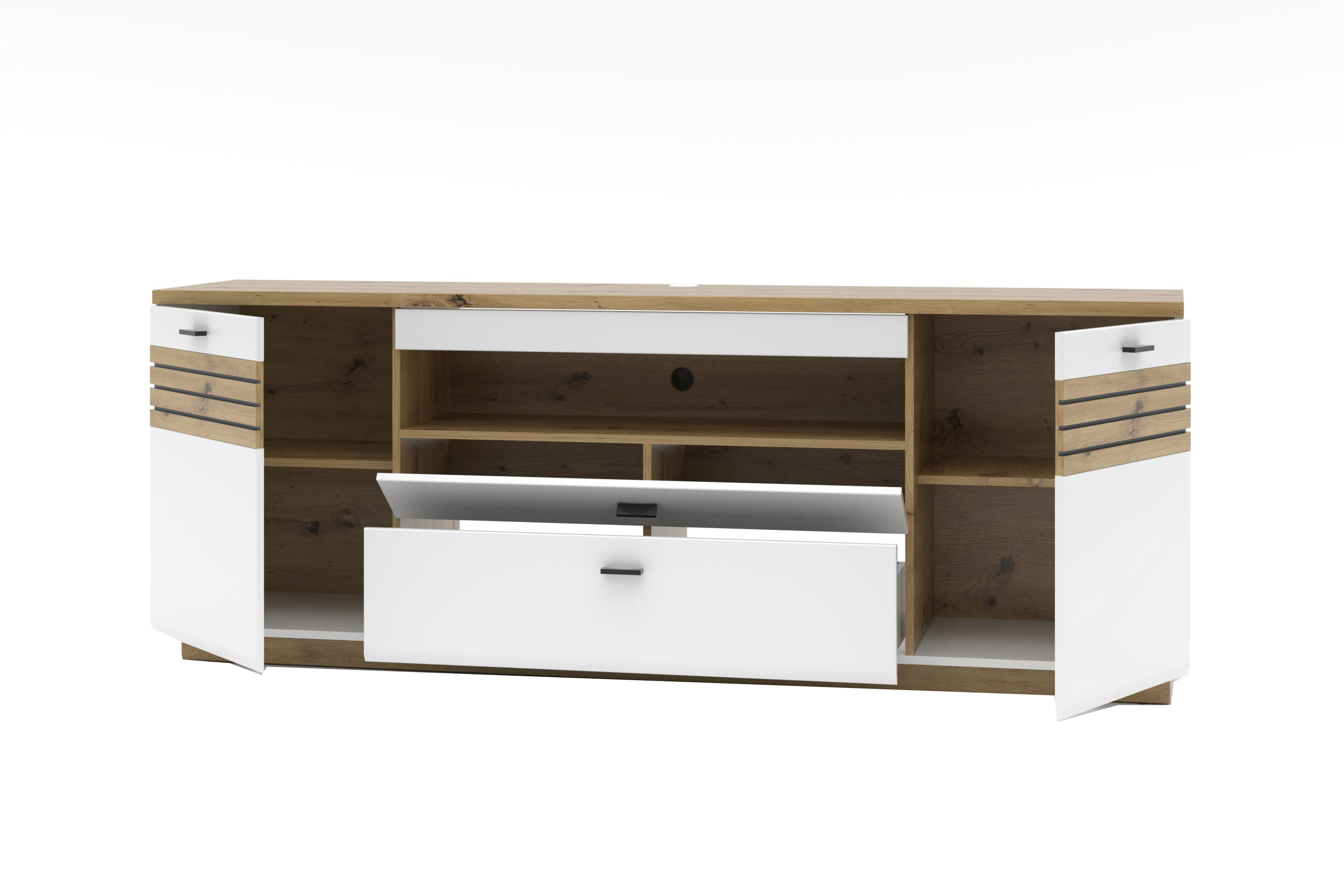 Das TV-Unterteil aus der Serie Fresno von Wohnconcept verbindet modernes Design mit zeitloser Eleganz und setzt dabei auf eine harmonische Kombination aus mattweißer Front und natürlicher Artisan-Eiche. Die feine Leistenoptik der Absetzung verleiht dem Möbelstück Tiefe und Charakter, während der leicht erhöhte Podest eine subtile, aber wirkungsvolle Präsenz schafft, wie eine Bühne, auf der Ihre Mediengeräte stilvoll in Szene gesetzt werden. Jede Linie, jede Oberfläche wurde bewusst gestaltet, um eine Atmosphäre von Ruhe, Klarheit und Wohnkomfort zu erzeugen. Neben seiner ästhetischen Raffinesse überzeugt das Lowboard durch intelligente Funktionalität: Zwei Holztüren, eine praktische Klappe, ein geräumiger Schubkasten und ein offenes Fach bieten ausreichend Stauraum, um Multimedia-Geräte, Bücher oder Dekoration sicher und geordnet zu verstauen. Der integrierte Kabeldurchlass sorgt dafür, dass Kabel unsichtbar bleiben und ein aufgeräumtes Gesamtbild entsteht. Besonders flexibel zeigt sich das Unterteil in den Erweiterungsoptionen: Eine stimmungsvolle Beleuchtung kann hinzugebucht werden und lässt sich bequem per Funkfernbedienung steuern, für ein wohnliches Ambiente auf Knopfdruck. Aufbewahrungsmöglichkeiten schaffen, sodass das Lowboard individuell an jede Raumgröße und Nutzung angepasst werden kann.