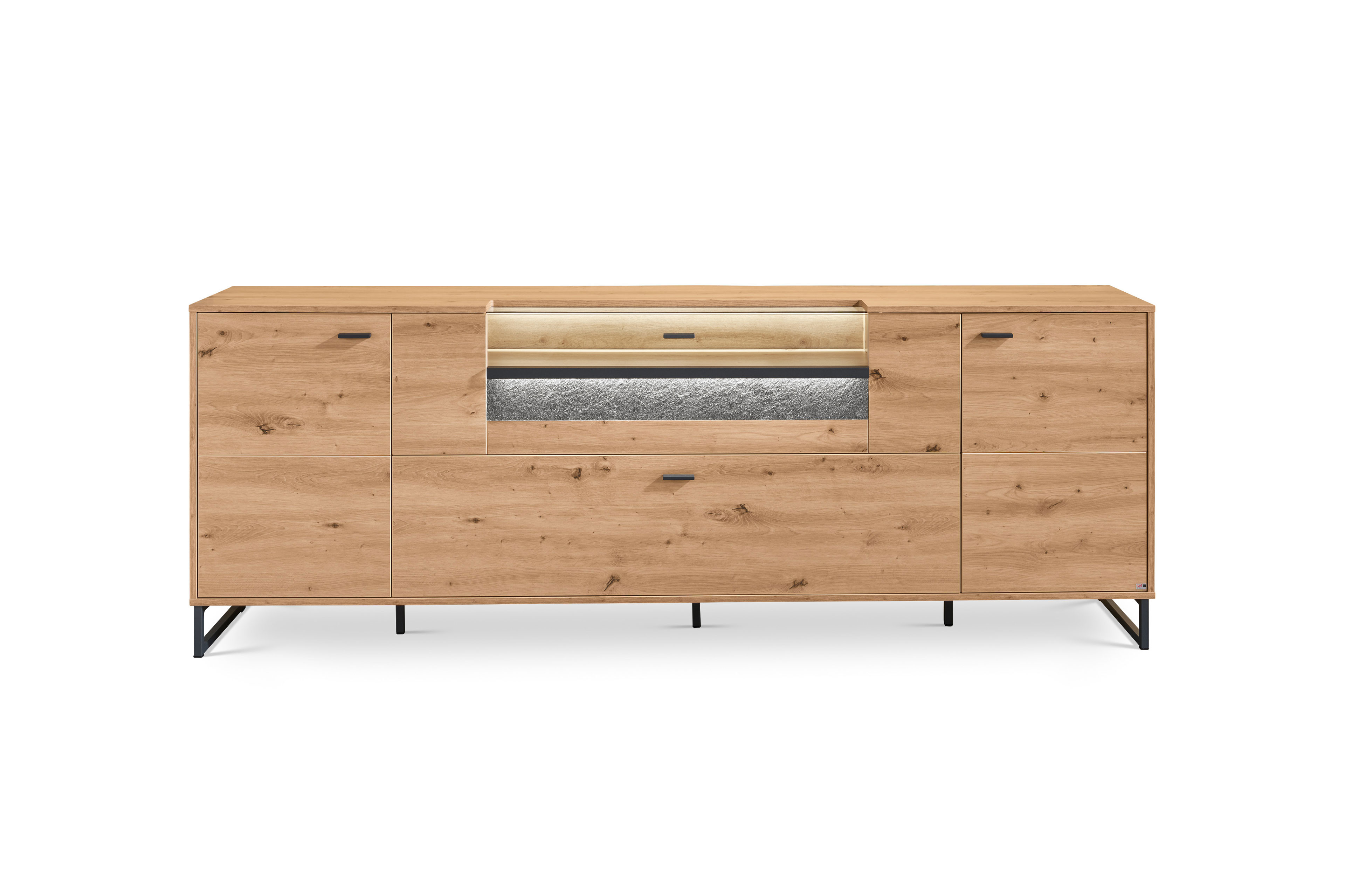Lowboards zählen zu den flexibelsten Einrichtungslösungen im Wohnbereich, da sie dem Fernseher einen passenden Platz geben und zugleich Raum für Technik, Medien und persönliche Utensilien schaffen. Deltona von set one by Musterring zeigt sich als klar gestaltetes TV-Element mit ausgewogener Aufteilung und durchdachtem Stauraumkonzept. Das Möbel verfügt über zwei Türen, hinter denen jeweils ein Einlegeboden untergebracht ist, und wird durch eine geschlossene Holzklappe ergänzt. Zusätzlich befindet sich oben eine Holz-/ Glasklappe, hinter der sich vier strukturierte Fächer befinden, die Übersicht und Ordnung unterstützen. Getragen wird das Element von markanten Kufen, was dem Gesamtbild eine moderne Leichtigkeit verleiht. Erhältlich ist das Lowboard wahlweise in Weiß oder in Eiche und lässt sich dadurch vielseitig kombinieren. Ein Zierelement in Sandstein setzt einen dekorativen Akzent und wird durch die integrierte Beleuchtung wirkungsvoll hervorgehoben. Im hinterlegten Typenplan finden sich alle verfügbaren Elemente, aus denen sich mithilfe des Möbelplaners eine individuelle Wohnwand zusammenstellen lässt. Deltona von set one by Musterring verbindet klare Gestaltung mit funktionaler Ordnung für zeitgemäßes Wohnen.