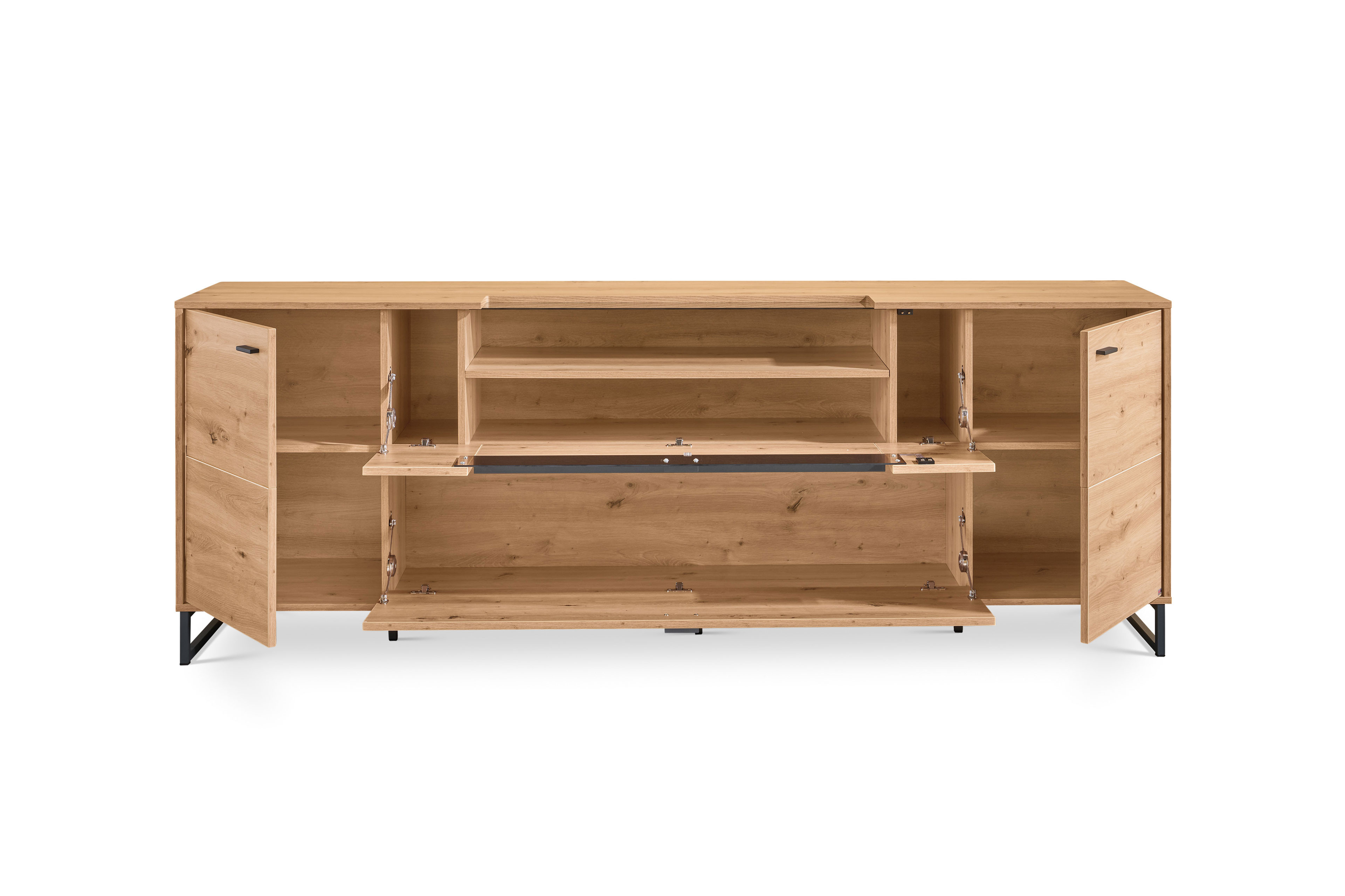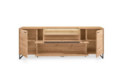 - Lowboard mit 2 Holztüren, 1 Klappe (oben) mit Glasausschnitten (Front und Deckblatt), 1 Klappe (unten) und 2 Einlegeböden