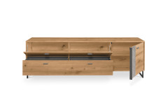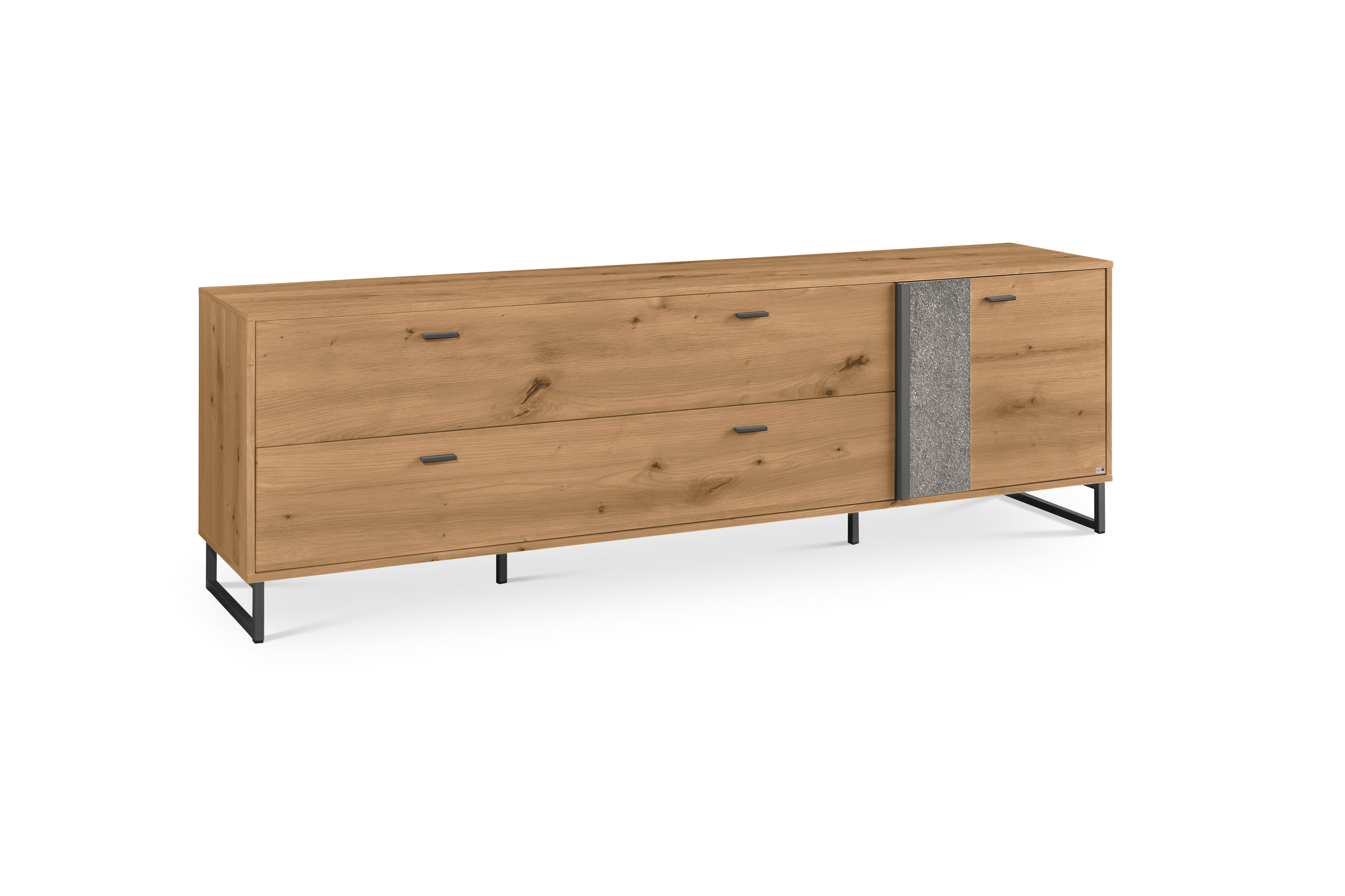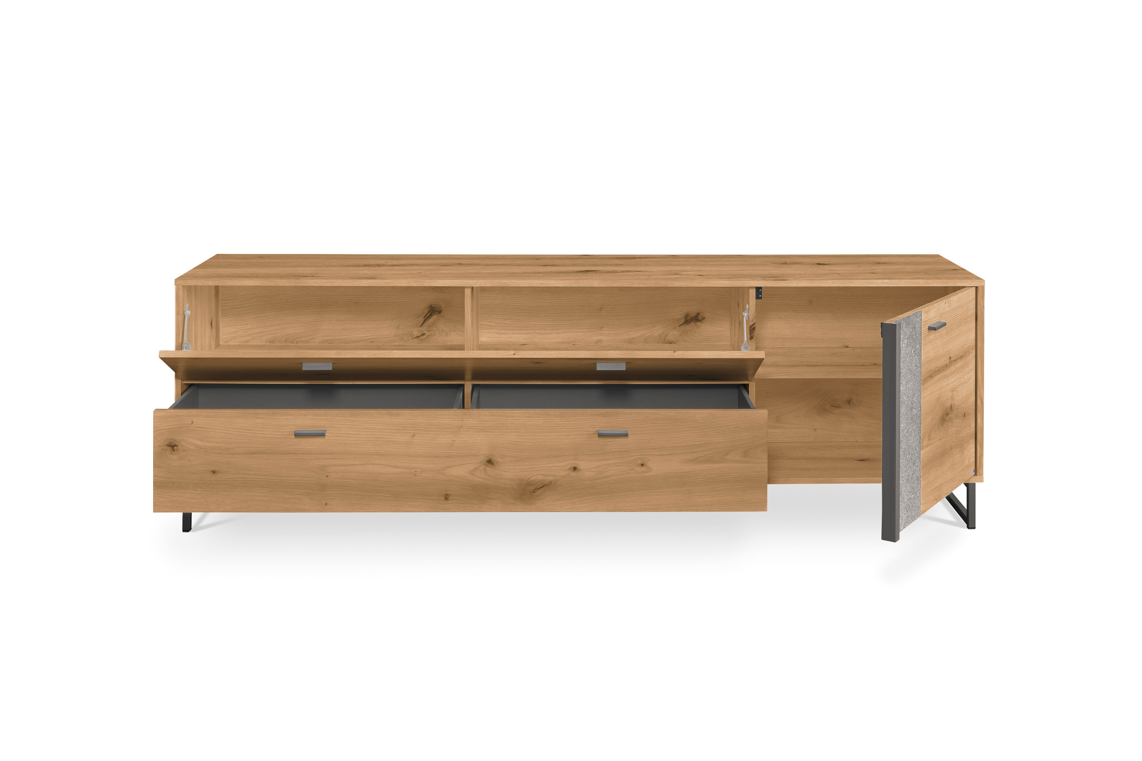 - Lowboard mit 1 Holztür, 1 Klappe (oben), 1 Doppelschubkasten (unten) und 1 Einlegeboden