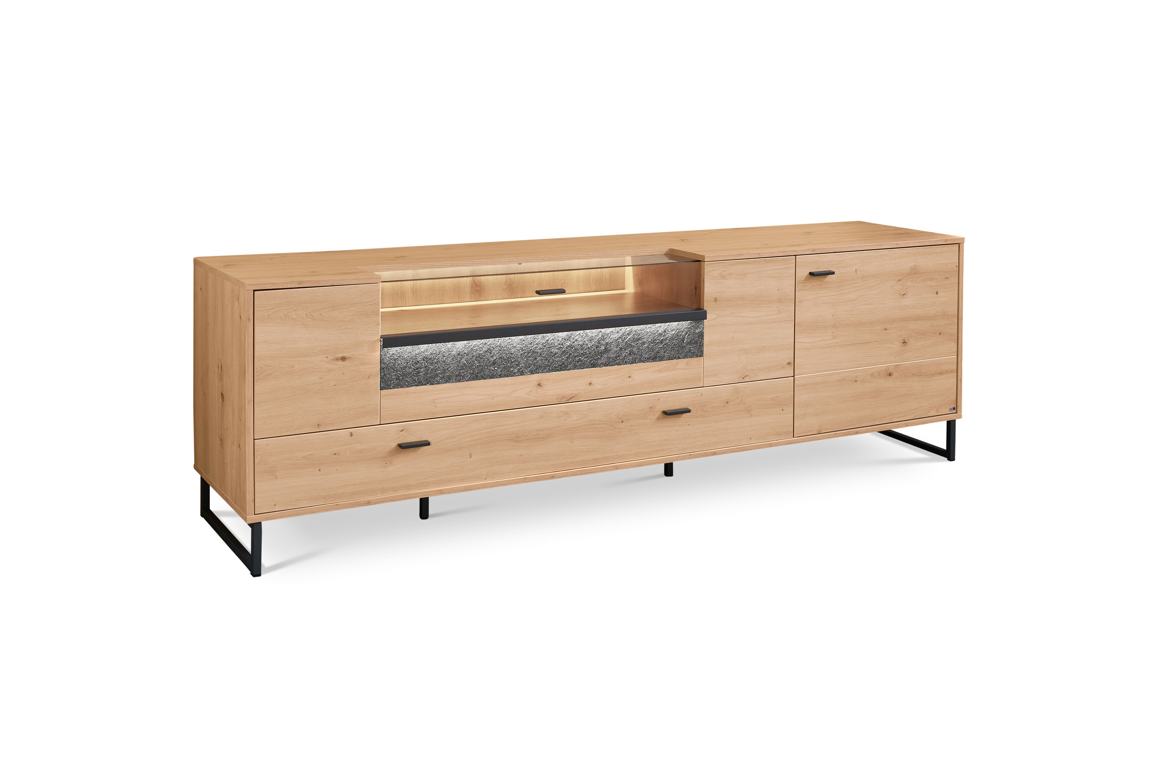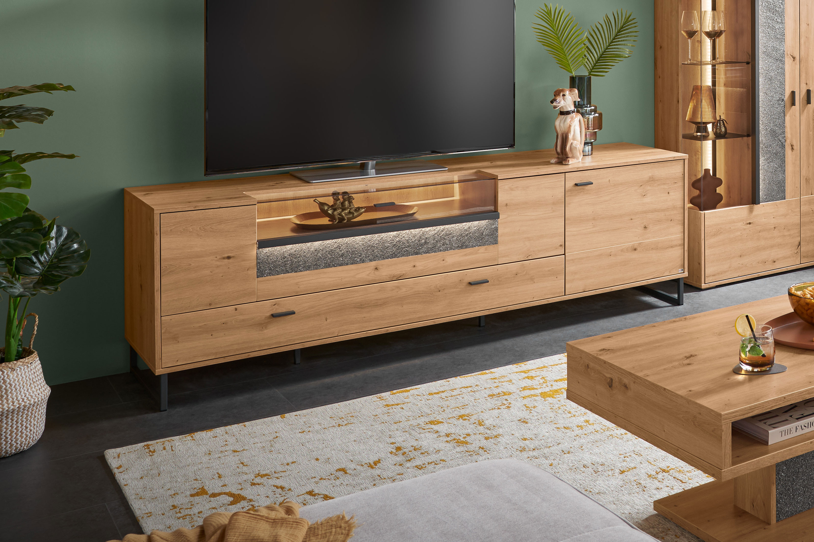 Lowboards gehören zu den besonders flexiblen Einrichtungselementen im Wohnbereich, da sie dem Fernseher einen festen Standort bieten und gleichzeitig Platz für Technik, Mediengeräte und persönliche Dinge schaffen. Deltona von set one by Musterring präsentiert sich als klar gezeichnetes TV-Möbel mit harmonischer Gliederung und einem sinnvoll aufgebauten Stauraumkonzept. Ausgestattet ist das Element mit einer Tür, hinter der ein Einlegeboden untergebracht ist und wird durch eine geschlossene Klappe aus Holz ergänzt. Im oberen Bereich befindet sich zudem eine Holz-/ Glasklappe, hinter der vier durchdacht angelegte Fächer liegen, die für Struktur und Ordnung sorgen. Das Möbel steht auf markanten Kufen, wodurch die Optik eine zeitgemäße Leichtigkeit erhält. Wahlweise in Weiß oder Eiche erhältlich lässt sich das Lowboard mühelos in unterschiedliche Wohnstile integrieren. Ein Zierelement in Sandstein setzt einen dezenten Akzent und wird durch die integrierte Beleuchtung wirkungsvoll betont. Der hinterlegte Typenplan bietet eine Übersicht aller verfügbaren Elemente, aus denen sich mithilfe des Möbelplaners eine individuelle Wohnwand zusammenstellen lässt. Deltona von set one by Musterring steht für klare Linien, durchdachte Funktionen und ein aufgeräumtes Wohnambiente.