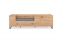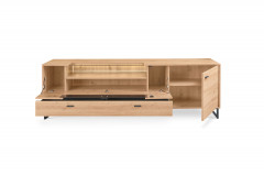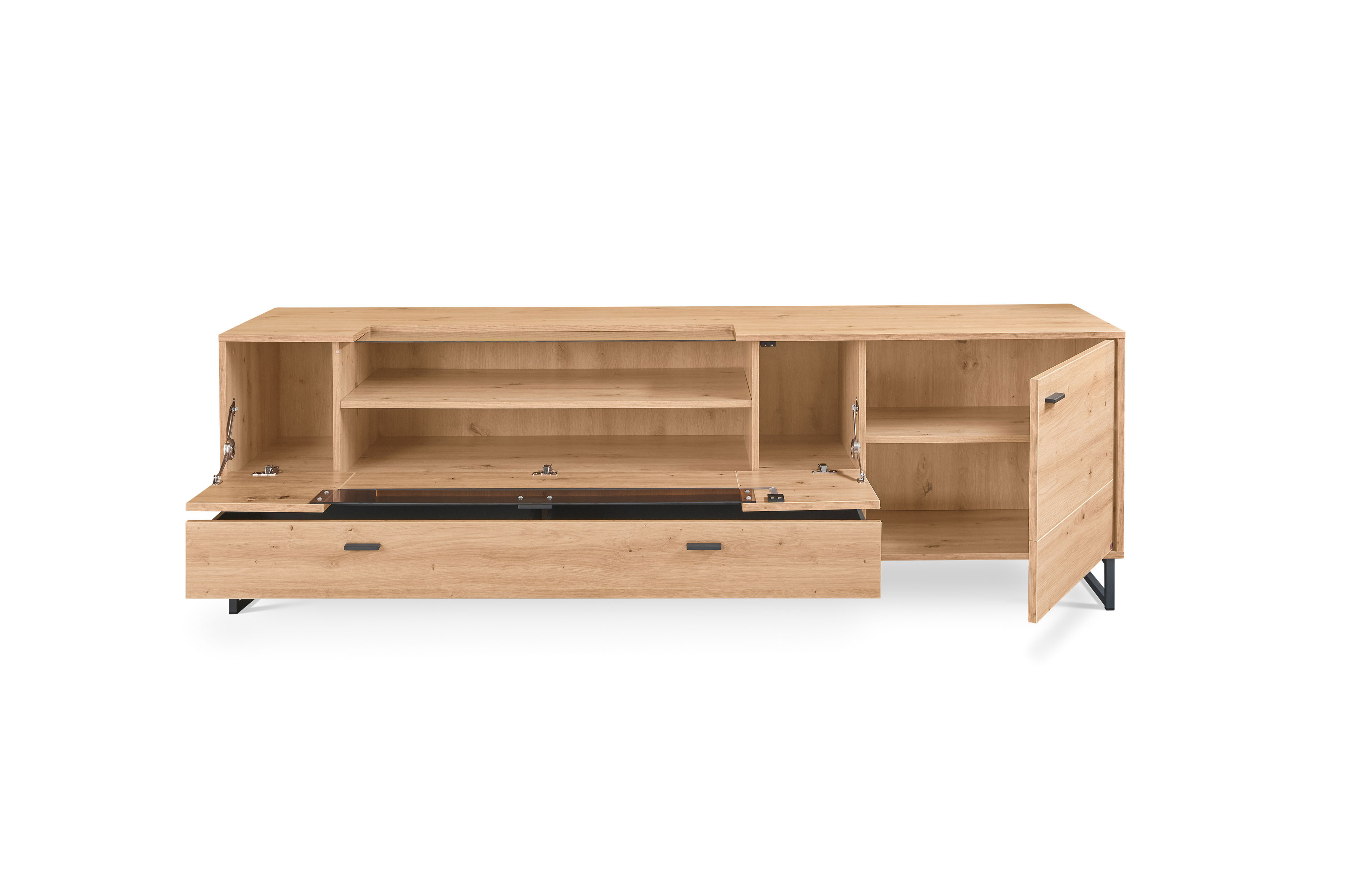 - Lowboard mit 1 Holztür, 1 Klappe (oben) mit Glasausschnitten (Front und Deckblatt), 1 Doppelschubkasten und 1 Einlegeboden