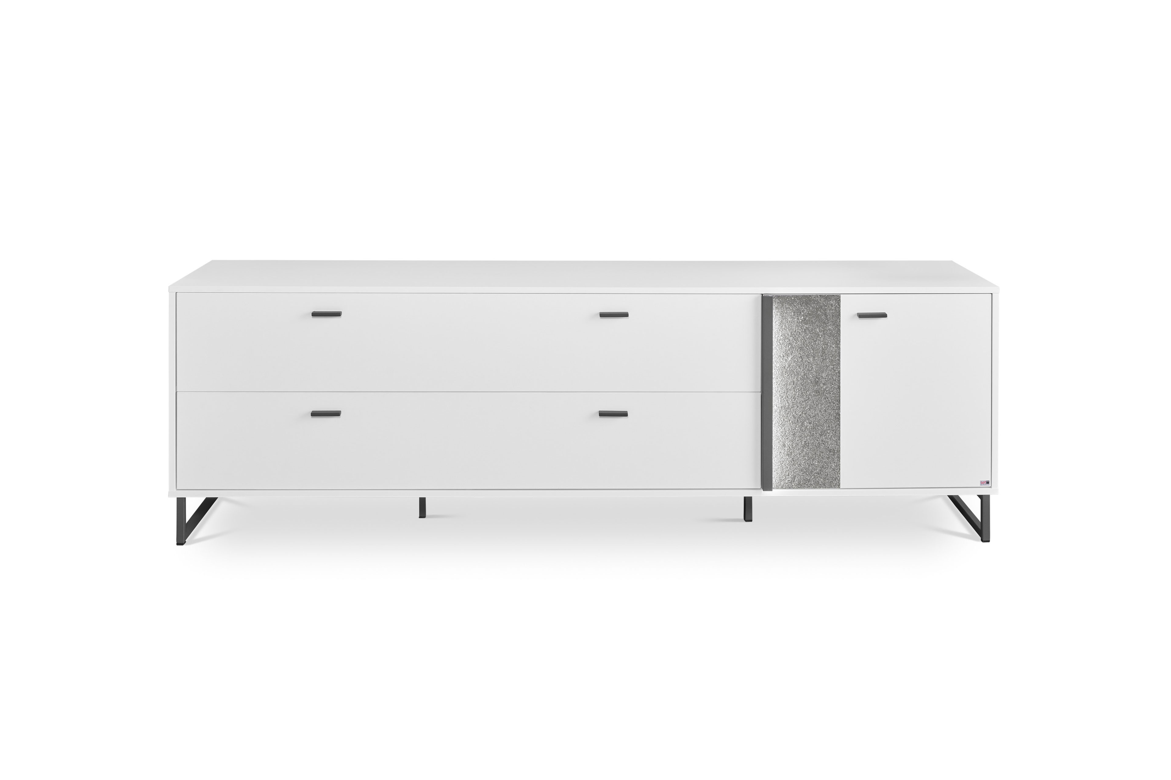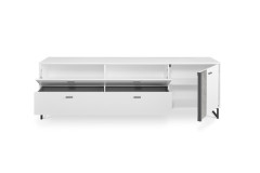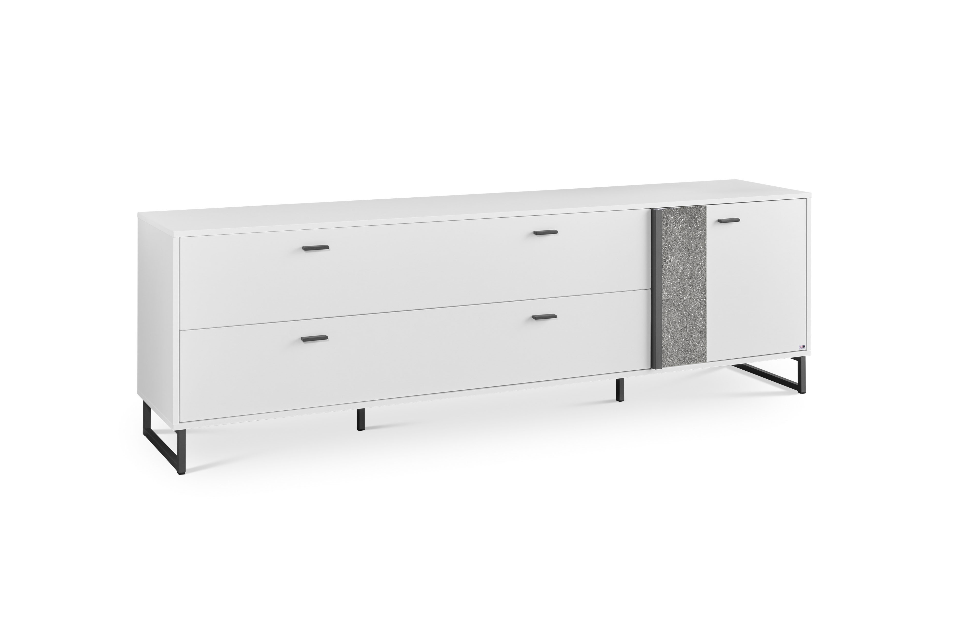 - Lowboard mit 1 Holztür, 1 Klappe (oben), 1 Doppelschubkasten (unten) und 1 Einlegeboden
