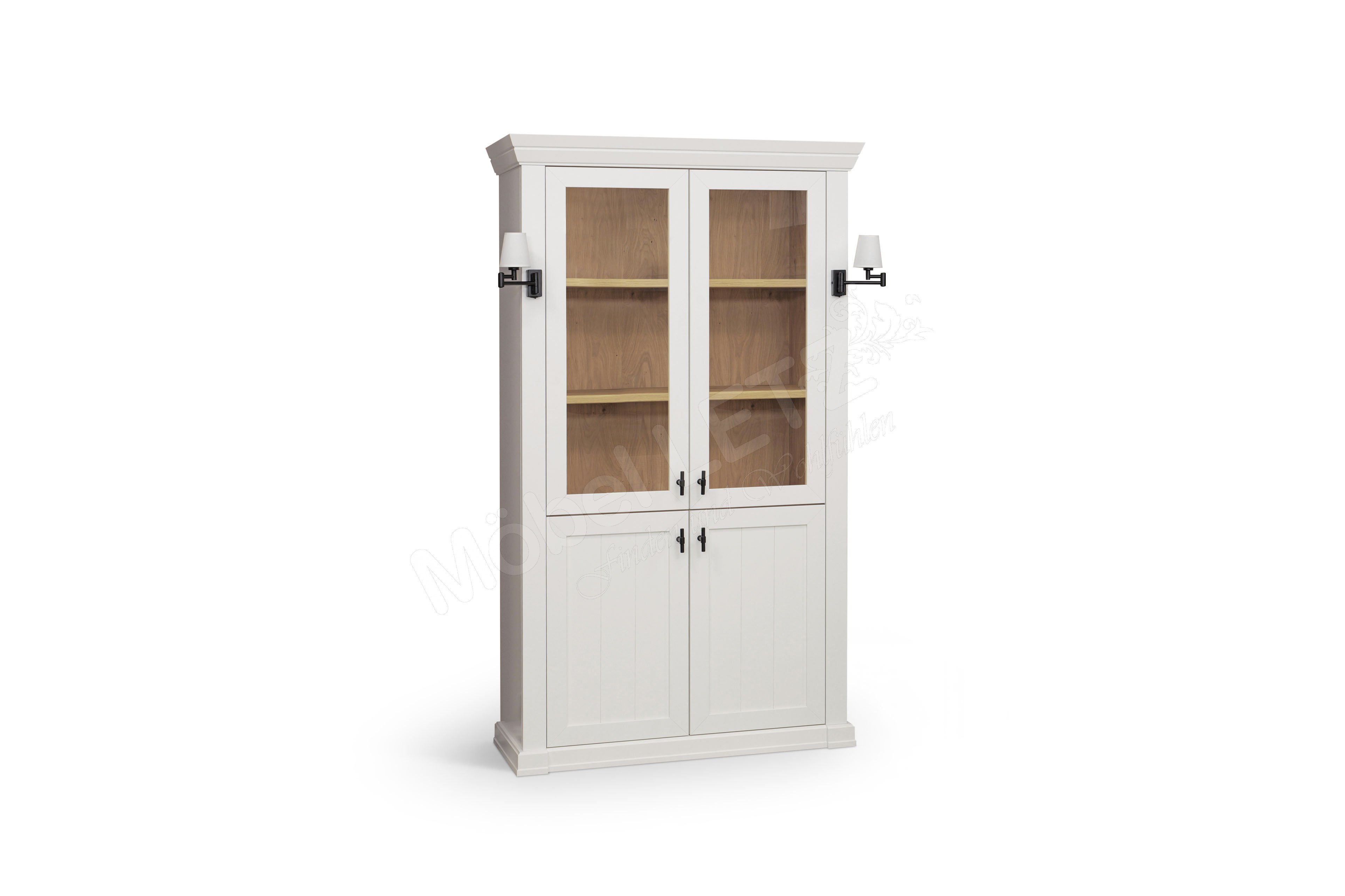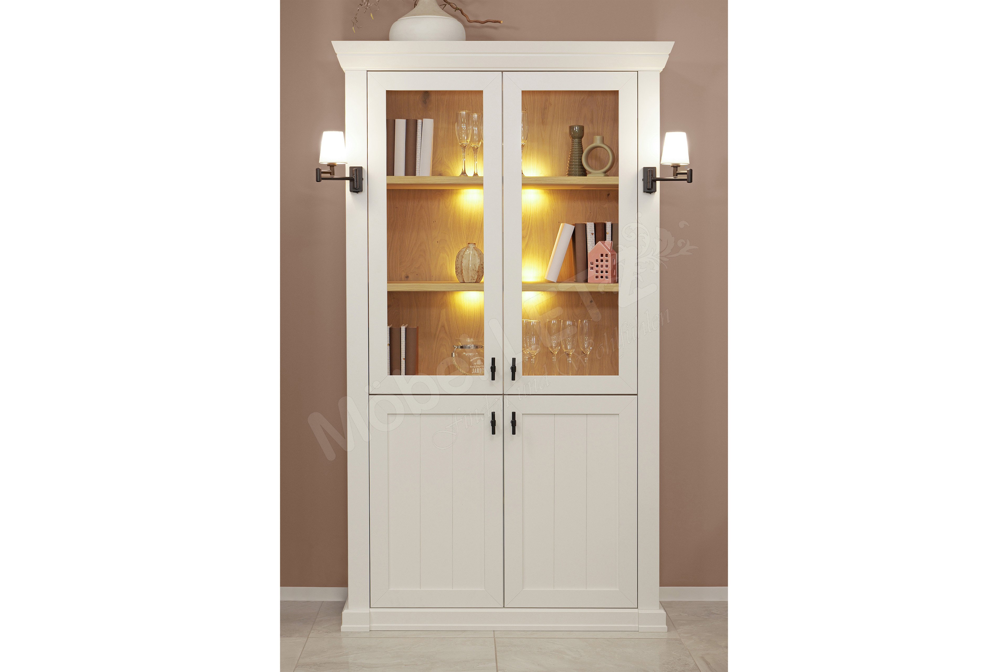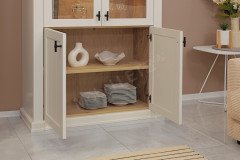 Die Schönheit des Landhausstils präsentiert Ihnen SCHÖNER WOHNEN mit dieser Vitrine aus der Kollektion Village. Das in Lack weiß gehaltene Element beeindruckt mit einer ungefähren Höhe von 193 Zentimetern, welche sich perfekt zum Anrichten, Präsentieren und Ausstellen eignet. Zwei Glas-/ Holzüren sowie zwei Holztüren mit insgesamt vier Holzböden bieten ausreichend Platz für Geschirr, Tischdecken, Ordner, Spiele und vieles mehr. Die Vitrine passt in den Wohn- sowie Essbereich und wird Ihnen hilfreichen Stauraum bieten. Die optionalen Pilasterleuchten unterstreichen den Charme dieses Möbels und die ebenfalls hinzubuchbare Holzbodenbeleuchtung setzt Ihre Schätze wunderschön in Szene. Village von SCHÖNER WOHNEN verkörpert den Landhausstil auf feinste Art und Weise. Entdecken Sie weitere Elemente im hinterlegten Typenplan und stellen Sie sich Ihre neue Wohnzimmereinrichtung zusammen.
