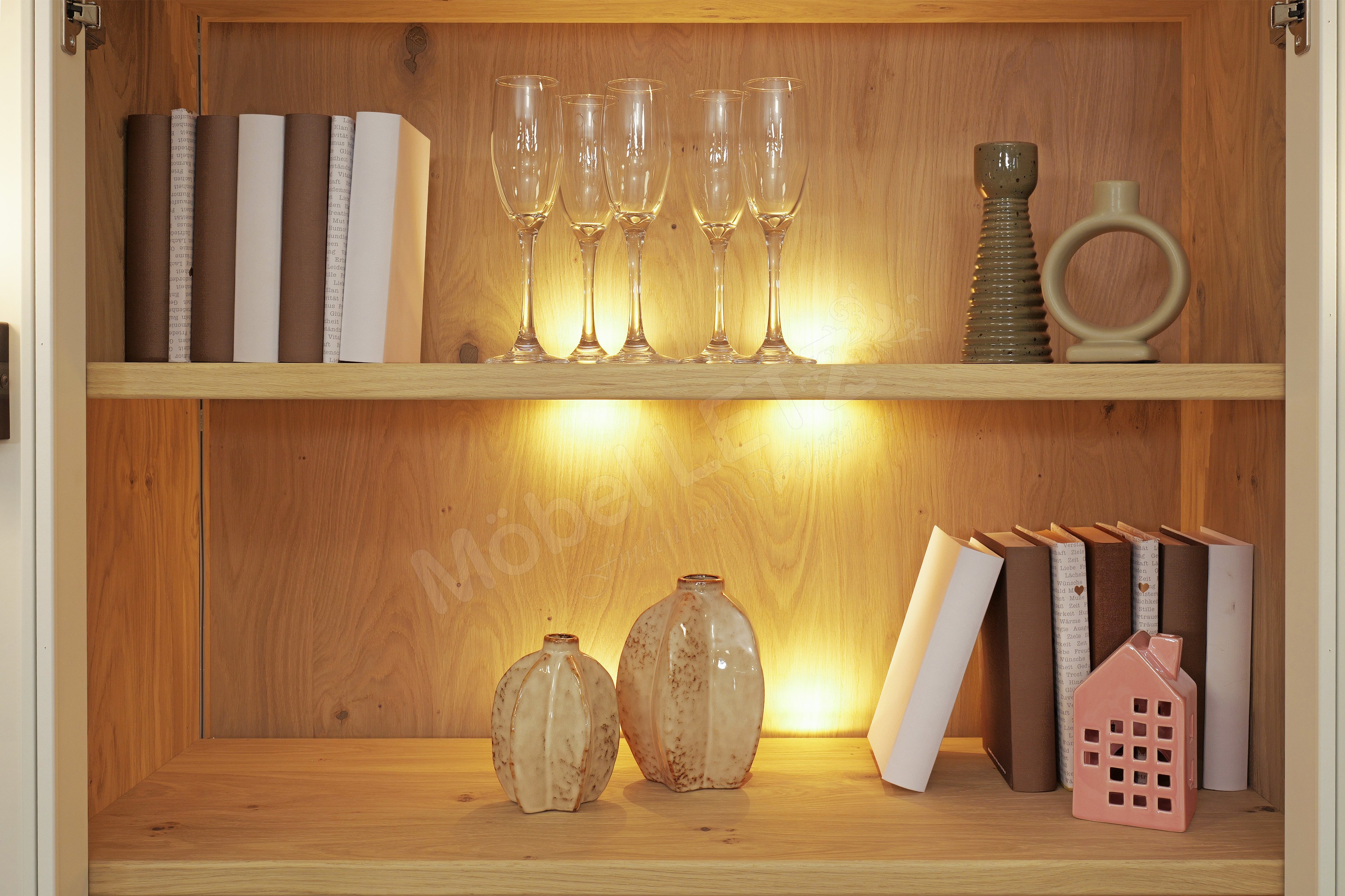 - Korpus innen/ sichtbare Rückwand/ Holzeinlegeböden: Asteiche, Nachbildung