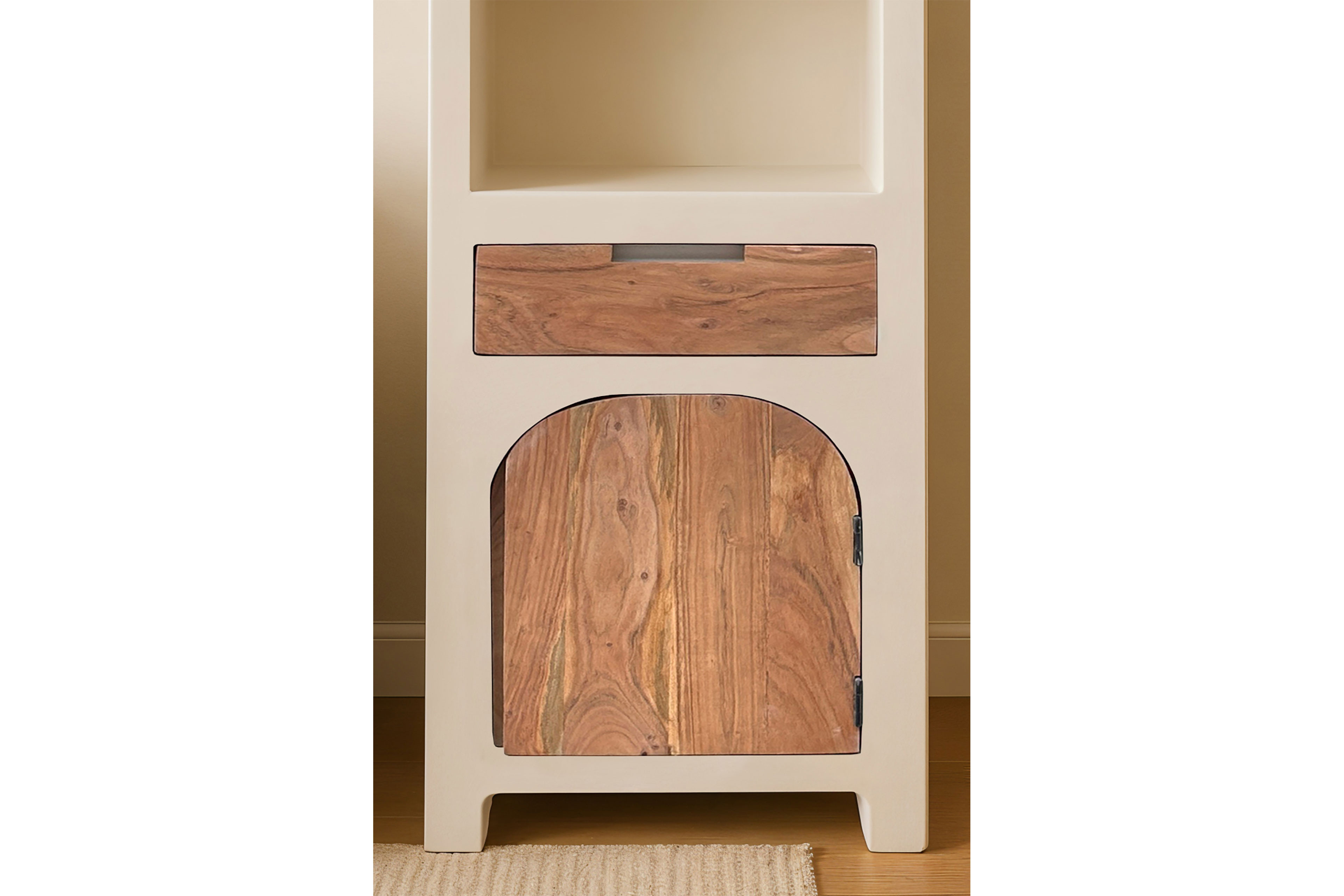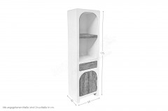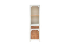 - Hochschrank mit 1 Holztür, 1 Schubkasten, 2 offenen Fächern und 1 Holzboden