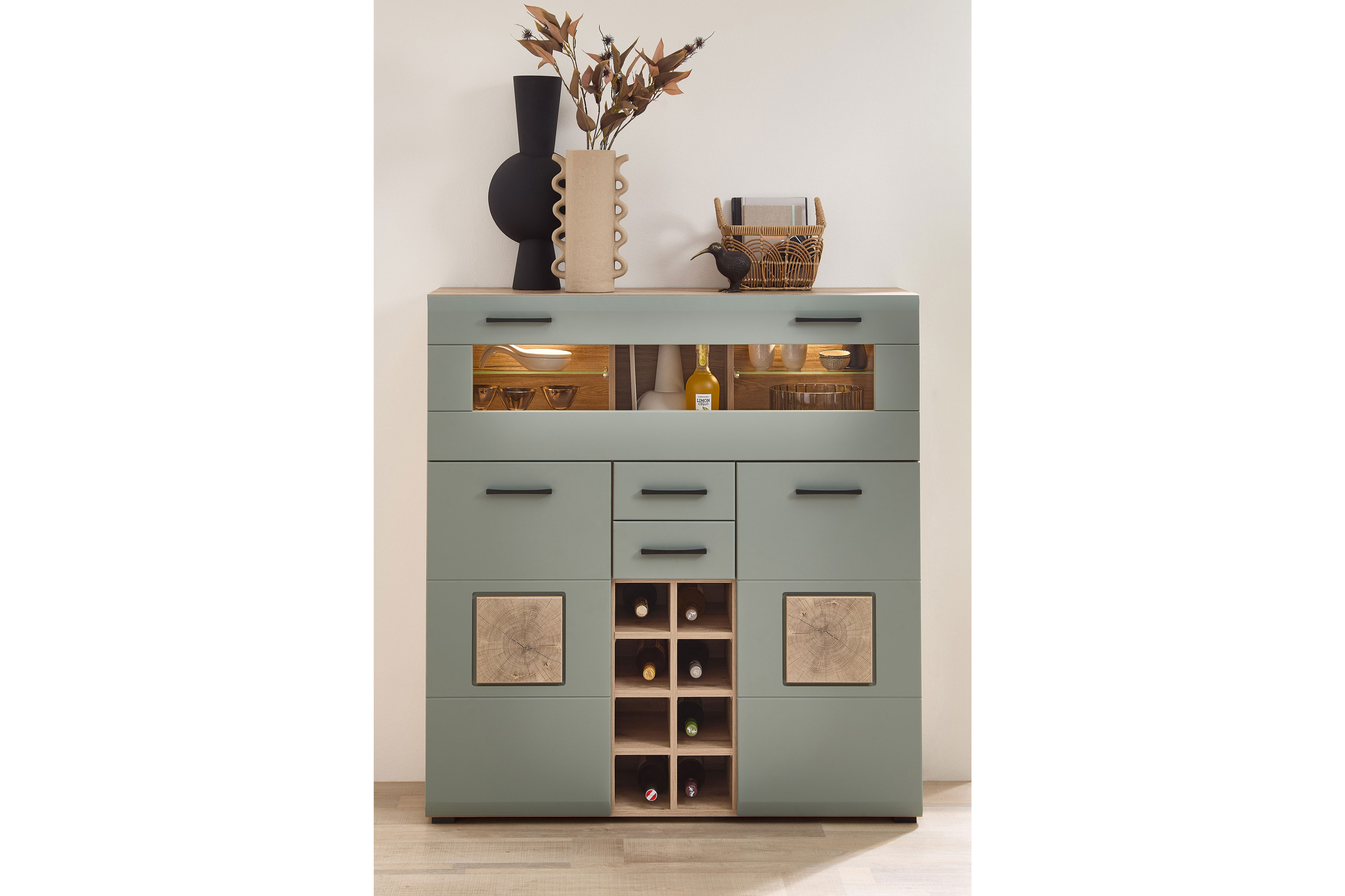 Mit diesem eleganten Barschrank aus der Modellreihe Fun Plus II von Innostyle erhalten Sie nicht nur ein funktionales Möbelstück, sondern auch einen einzigartigen Blickfang in Ihrem Wohnraum. Präsentiert wird dieses Möbel in einer matten schilfgrünen Front, welche in jedem Fall eine Besonderheit darstellt. Mit dieser Voderansicht und einem Korpus in Eiche fügt sich ein schönes Gesamtbild zusammen. Die durchdachte Funktionalität des Barschranks wird durch verschiedene Elemente unterstrichen. Eine Glas-/ Holzklappe und zwei geräumige Schubkästen bieten Platz für Barutensilien und Zubehör, während das integrierte Flaschenregal mit acht Fächern sowohl praktisch als auch dekorativ ist. Die inkludierte Beleuchtung setzt Ihre edlen Getränke und Baraccessoires gekonnt in Szene, wodurch eine atmosphärische Stimmung geschaffen wird. Mit einem Maß von circa 120 Zentimetern Breite und einer Höhe von circa 129 Zentimetern fügt sich dieser Barschrank perfekt in unterschiedliche Raumkonzepte ein und bietet dabei großzügigen Stauraum. Für alle weiteren Fragen und eine individuelle Beratung steht Ihnen unser engagierter Kundenservice gerne zur Verfügung. Vertiefende Informationen zu diesem Barschrank und weiteren Einzelementen aus der Fun Plus II Modellreihe finden Sie zudem in unserem beigefügten Typenplan.