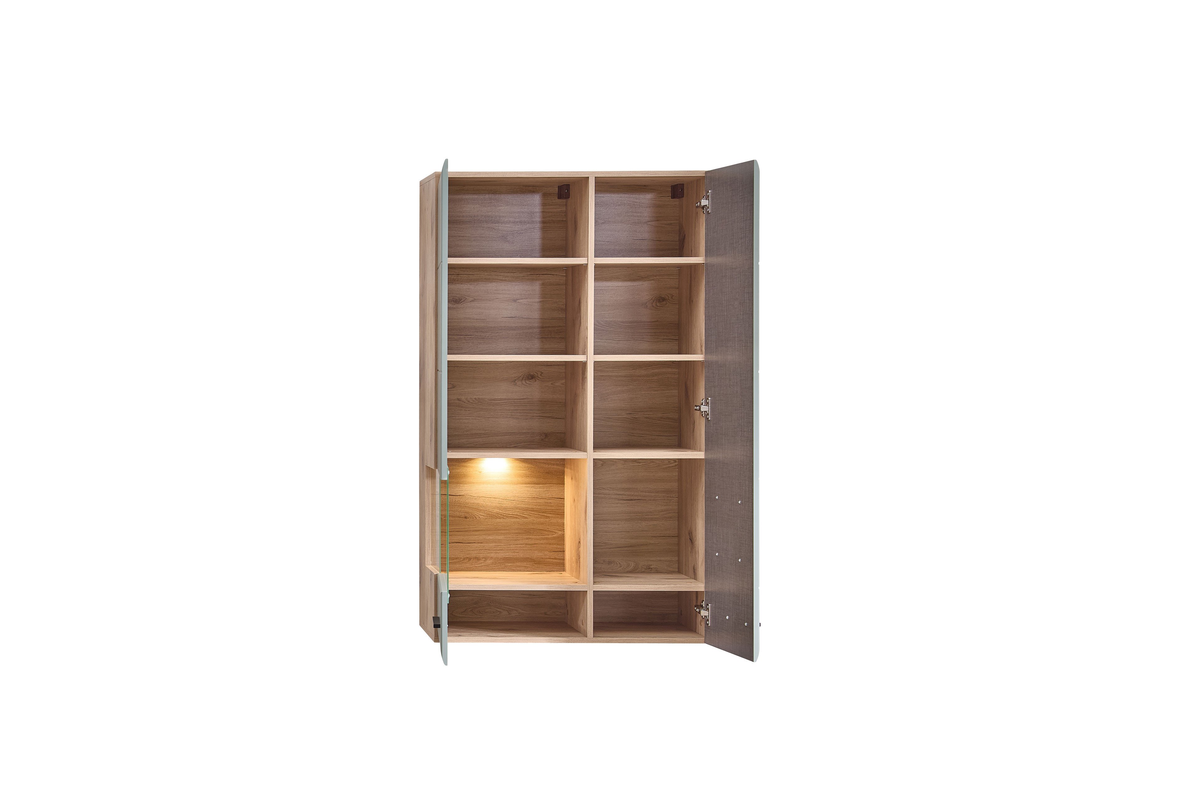 In diesem Angebot wird Ihnen diese erstklassige Innostyle Hängevitrine der Modellreihe Fun Plus II in ansprechendem Schilfgrün mit einer matten Oberfläche vorgestellt. Dieser Solist profitiert von modernem Design und durchdachter Funktionalität, somit schafft er nicht nur zeitlose Eleganz, sondern auch eine beruhigende Atmosphäre. Der Korpus in hellem Viking Oak verfeinert das Gesamtbild und sorgt für Harmonie. Vervollständigt wird das Design dank der natürlich wirkenden Hirnholzapplikation. Diese unterstreicht die Exklusivität des Möbelstücks. Zudem bietet diese Vitrine hinter einer Holztür und einer Glas-/ Holztür genügend Raum, um all Ihre Gegenstände sichtbar zu platzieren oder verborgen unterzubringen. Während die Holztür einen geschlossenen und eleganten Charakter verleiht, ermöglicht die Glasfront einen transparenten Einblick. Die inkludierte Beleuchtung setzt Ihre Objekte gekonnt in Szene und schafft ein stimmungsvolles Mileu im Raum. Mit einer Breite von circa 80 Zentimetern ist diese Hängevitrine nicht nur platzsparend, sondern auch vielseitig einsetzbar. Durch ihre hängende Funktion schafft sie einen schwebenden Effekt, der nicht nur modern, sondern auch platzsparend wirkt.